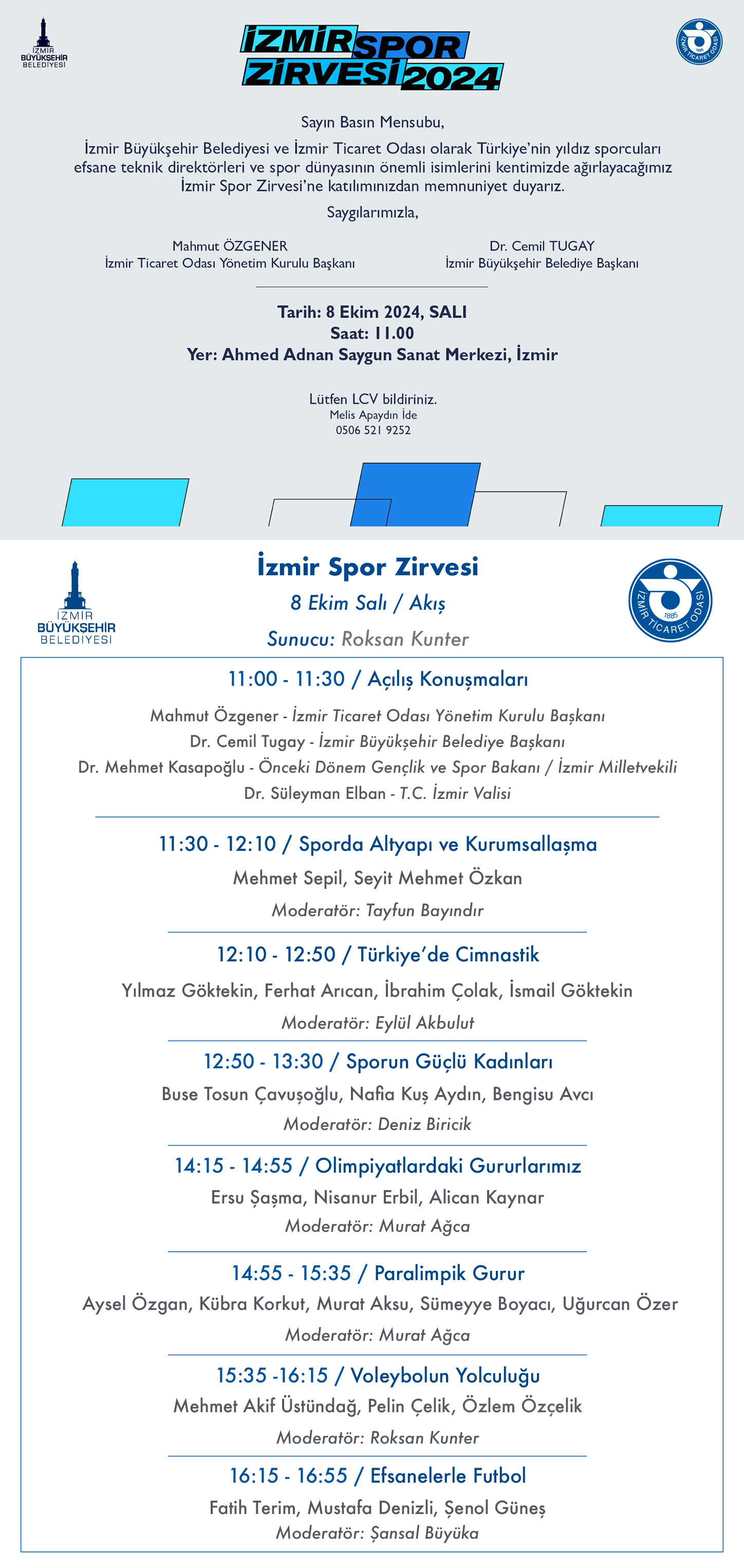 İZMİR BÜYÜKŞEHİR BELEDİYESİ VE İZMİR TİCARET ODASI İŞ BİRLİĞİYLE, TÜRKİYE’NİN YILDIZ SPORCULARI, EFSANE TEKNİK DİREKTÖRLERİ VE SPOR DÜNYASININ ÖNEMLİ İSİMLERİNİN KATILIMIYLA “İZMİR SPOR ZİRVESİ” DÜZENLENECEKTİR. BÜYÜKŞEHİR BELEDİYE BAŞKANI DR. CEMİL TUGAY, ZİRVEDE AÇILIŞ KONUŞMASI YAPACAKTIR.