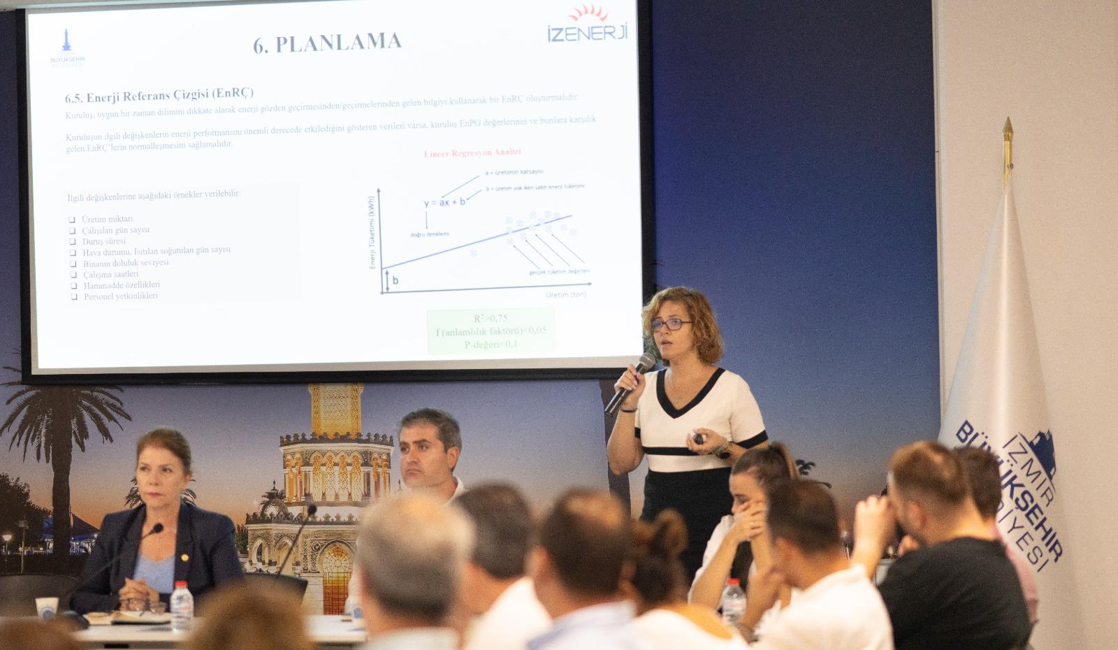 İzmir Büyükşehir Belediyesi İklim Değişikliği ve Temiz Enerji Şube Müdürlüğü ve İZENERJİ AŞ personeli yaptıkları sunumlarla TS EN ISO 50001 standardı ve İzmir Büyükşehir Belediyesi’nin bu kapsamdaki uygulamalarını anlattı. Sunumda, Ahmed Adnan Saygun Sanat Merkezi, Bornova Buz Sporları Yerleşkesi ve Buca Sosyal Yaşam Kampüsü’nün Türk Standartları Enstitüsü (TSE) tarafından yürütülen belgelendirme tetkik sürecini başarıyla tamamlayarak TS EN ISO 50001 Enerji Yönetim Sistemi Belgesi’ni aldığı, yine enerji etütleri ile belirlenen verimsiz noktalarda iyileştirmeler yapılarak enerji tasarrufu sağlandığına dikkat çekildi. İzmir Büyükşehir Belediyesi iştiraki İZENERJİ AŞ Enerji Hizmetleri Müdürlüğü yetkilileri ise binalarda enerji verimliliği konularında danışmanlık hizmetleri sunduklarını ve İZENERJİ’nin ana hizmet binasının TS EN ISO 50001 Enerji Yönetim Sistemi Belgesi’ne sahip olduğunu aktardı.
