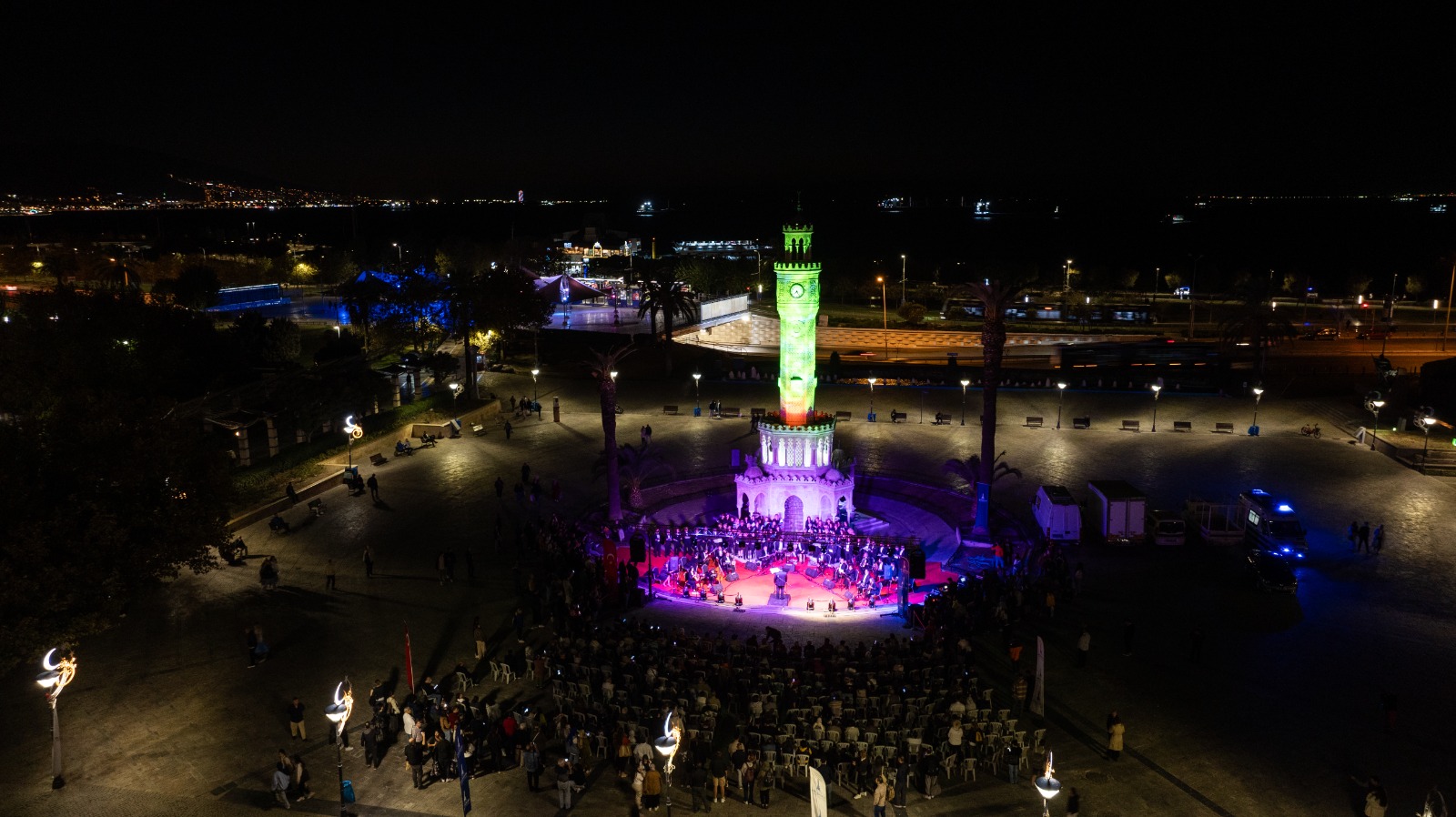 İzmir Büyükşehir Belediyesi’nin 29 Ekim Cumhuriyet Bayramı coşkusunu kentin tamamına yayma hedefiyle başlattığı “Cumhuriyet Her Yerde” programı kapsamında düzenlenen etkinlikler aralıksız devam ederken, Konak Atatürk Meydanı’ndaki konsere İzmirlilerin ilgisi büyüktü. Şef İnanç Menekşe yönetimindeki İzmir Büyükşehir Belediyesi 100. Yıl Cumhuriyet Korosu’nun sahne aldığı konserde Cumhuriyet marşları ve dönemi yansıtan özel repertuvar İzmirlilere unutulmaz anlar yaşattı.