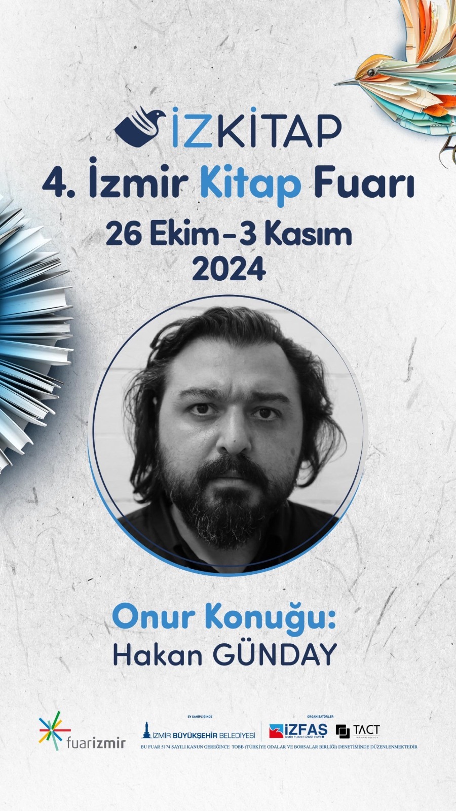 KOSGEB desteğiyle yazar ve yayıncılarla kitapseverleri bir araya getirecek, sektörü buluşturacak İZKİTAP - İzmir Kitap Fuarı’nın onur konuğu yazarı ise roman, dizi ve film senaryosu, oyun türlerinde eserleri olan, yurtiçi ve yurtdışında birçok prestijli ödülün sahibi Hakan Günday olacak. Okurları, Hakan Günday ile 26 Ekim günü saat 14.30’da düzenlenecek söyleşide bir araya gelip kitaplarının yanı sıra Şahsiyet, Müslüm, Daha gibi film ve dizi senaryoları hakkında sohbet etme imkânı bulacak.