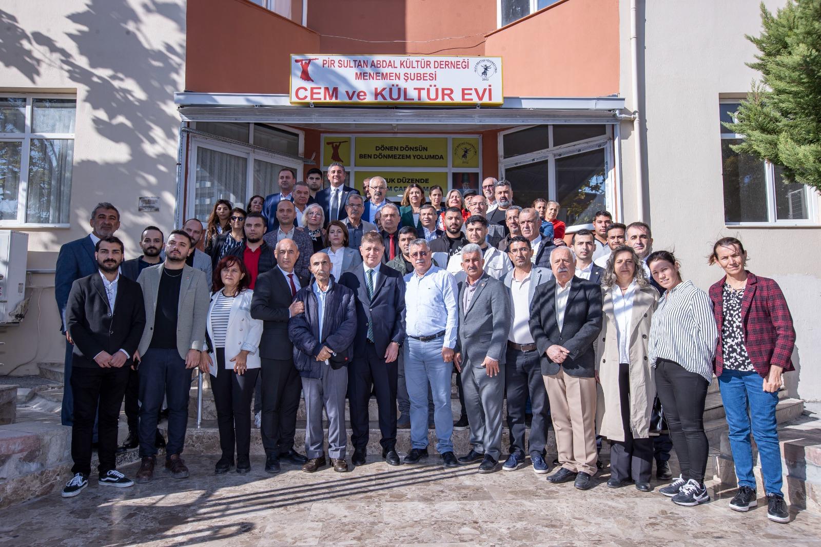 İzmir Büyükşehir Belediye Başkanı Dr. Cemil Tugay, Menemen’deki Asarlık Alevi Kültür Derneği ile Pir Sultan Abdal Kültür Derneği’ni ziyaret etti. Cumhuriyet Halk Partisi (CHP) Menemen İlçe Başkanı Hüseyin Özbey ve belediye meclis üyelerinin de eşlik ettiği Büyükşehir Belediye Başkanı Tugay, Asarlık’ta Dernek Başkanı Şenel Bozkurt ve yöneticileri tarafından çiçeklerle karşılandı. Başkan Tugay daha sonra Uğur Mumcu Mahallesi’ndeki Pir Sultan Abdal Kültür Derneği’ne ziyarette bulundu. Burada da Dernek Başkanı Ali Onay, Başkan Vekili İsmail Polat ve dernek yöneticileri tarafından karşılanan Tugay, yurttaşların ihtiyaç, talep ve isteklerini dinledi, gerekli adımların atılacağını belirtti.