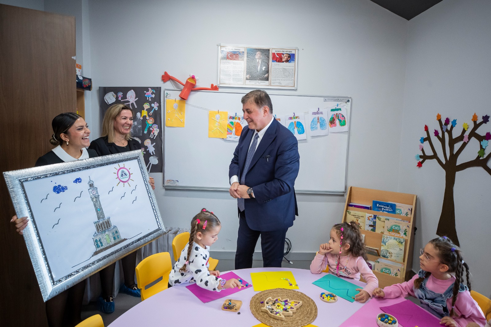 Anaokulu ve kreş eğitim merkezleri ile İzmir’in dört bir yanından 24-72 ay arası çocuklara kaliteli hizmet veren İZELMAN Anaokulları, okul sayısını 18’e yükselterek çocukların eğitim alma hakkına destek oluyor. İzmir Büyükşehir Belediye Başkanı Dr. Cemil Tugay, İZELMAN Egekent Kreş ve Anaokulu Eğitim Merkezi’ni ziyaret ederek buradaki öğretmen ve öğrencilerle buluştu. Miniklerin elleriyle yaptıkları çiçek buketi ve Saat Kulesi tablosu ile karşılanan Başkan Tugay da öğretmenlere çiçek verdi, miniklere ise hediyeler dağıttı. Öğrencilerin oyunlarına da dahil olan Başkan Tugay, 20 Kasım Dünya Çocuk Hakları Günü’nde çocukların eğitim alma haklarına dikkat çekti. Çocuklara kaliteli eğitim hizmeti verirken ailelerin bütçesini rahatlatmak için okul ücretlerini de yarı fiyatına düşürdüklerinin altını çizen Başkan Tugay, önümüzdeki yıl kreş sayısını iki katına çıkaracaklarını duyurdu.