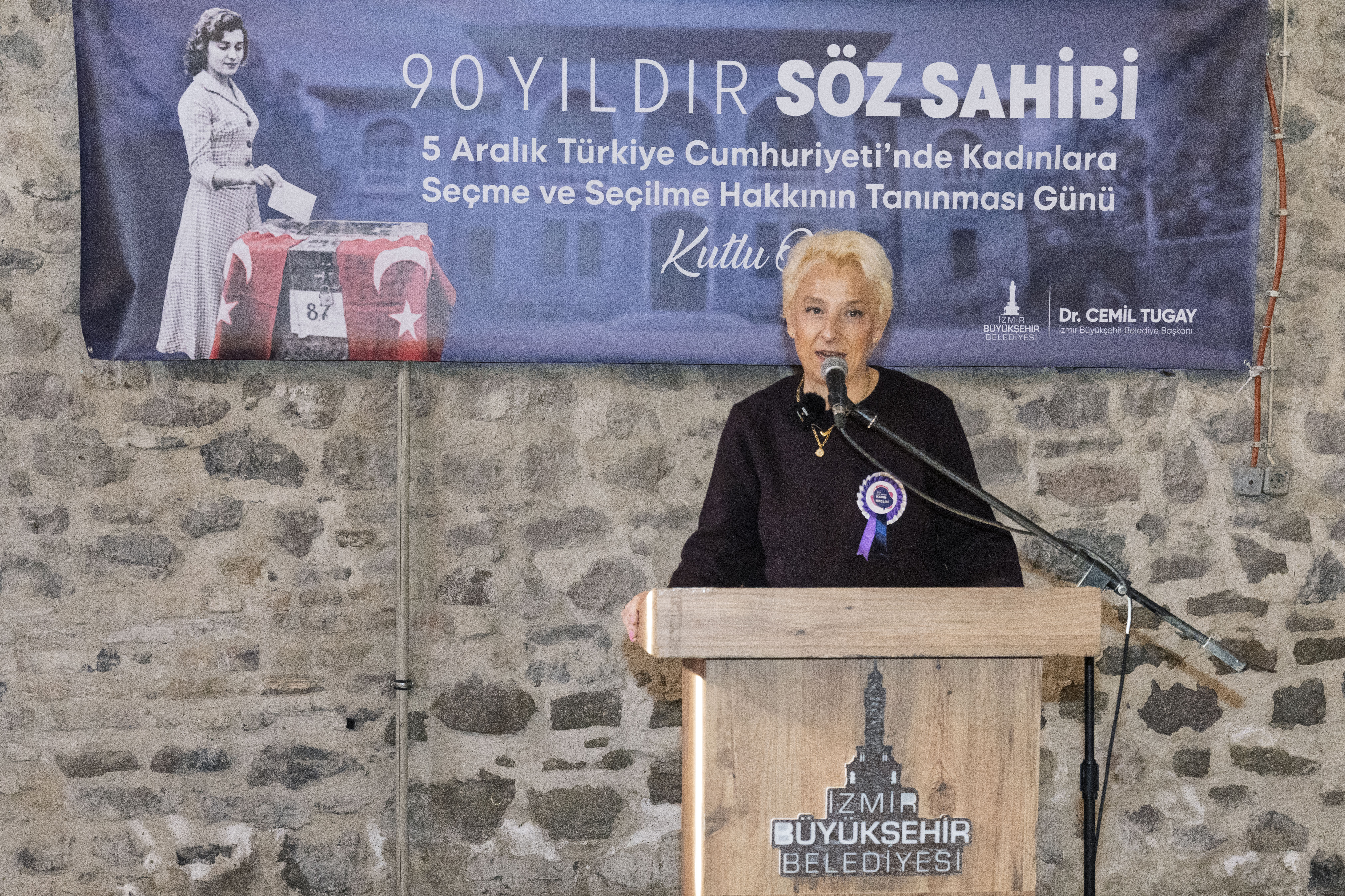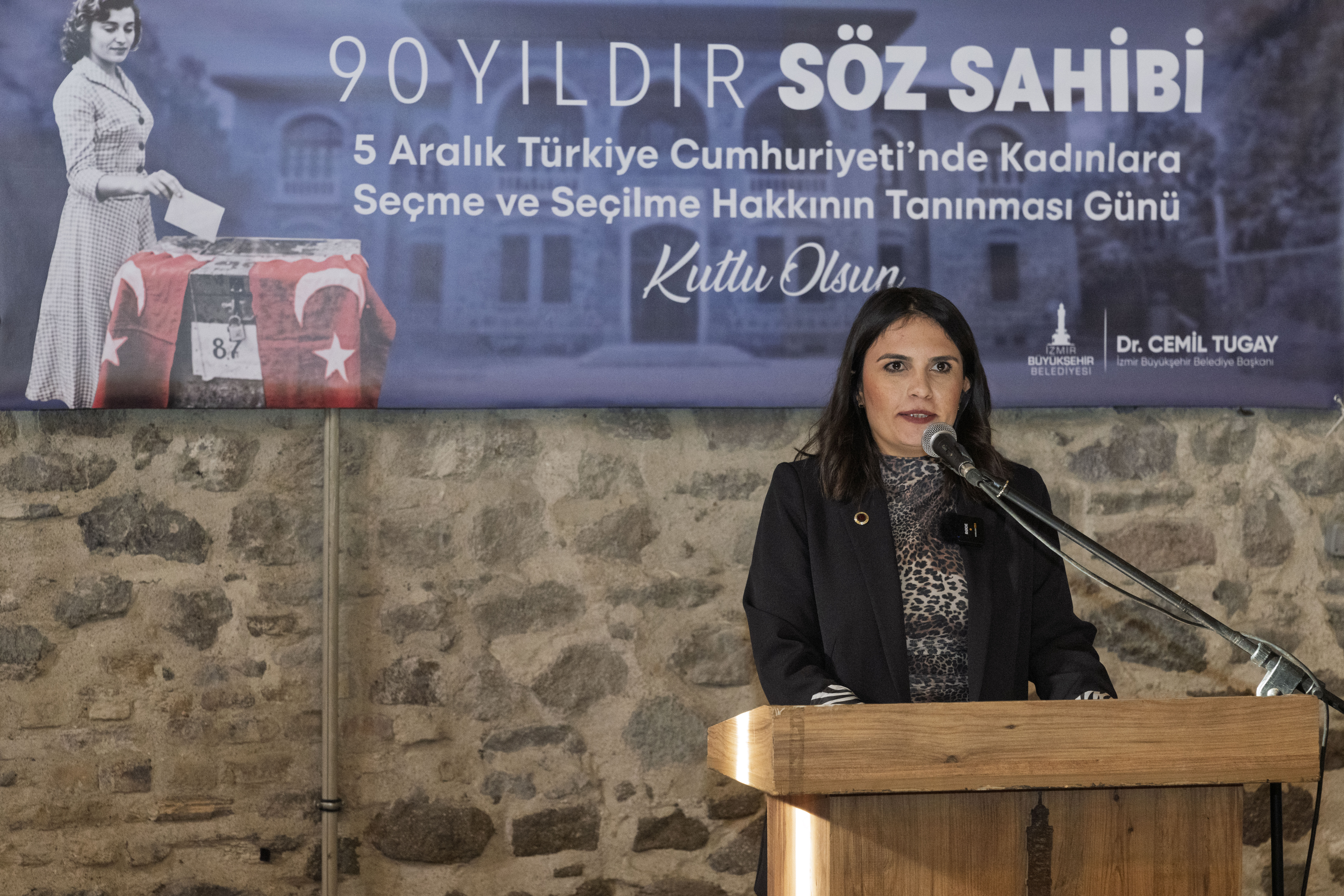Törende konuşan İzmir Büyükşehir Belediyesi Meclis Üyesi ve Toplumsal Cinsiyet Eşitliği Komisyonu Başkanı Hatice Semerci, Türk kadınına seçme ve seçilme hakkının tanınmasının tarihsel sürecini aktardı. Semerci, Türkiye Cumhuriyeti’nin kurucusu Mustafa Kemal Atatürk sayesinde birçok gelişmiş ülkeden önce seçme ve seçilme hakkını elde ettiklerini vurguladı. Parlamentolararası Birlik’in 2023 verilerine göre dünyadaki parlamentoların kadın temsilinde 186 ülke arasında Türkiye’nin en alt sıralara gerilediğini kaydeden Semerci, “Nüfusun yarısını kadınlar oluşturmasına rağmen kadınların fiili olarak eşit yurttaş olamadıkları açıktır. Kadının önündeki engellerin kalkması, yasal değişikliklerin yapılması, kadın erkek eşitliğini sağlayacak toplumsal dönüşümün sağlanması için dün olduğu gibi bugün de çalışmalarımıza ve mücadelemize devam edeceğiz” dedi.