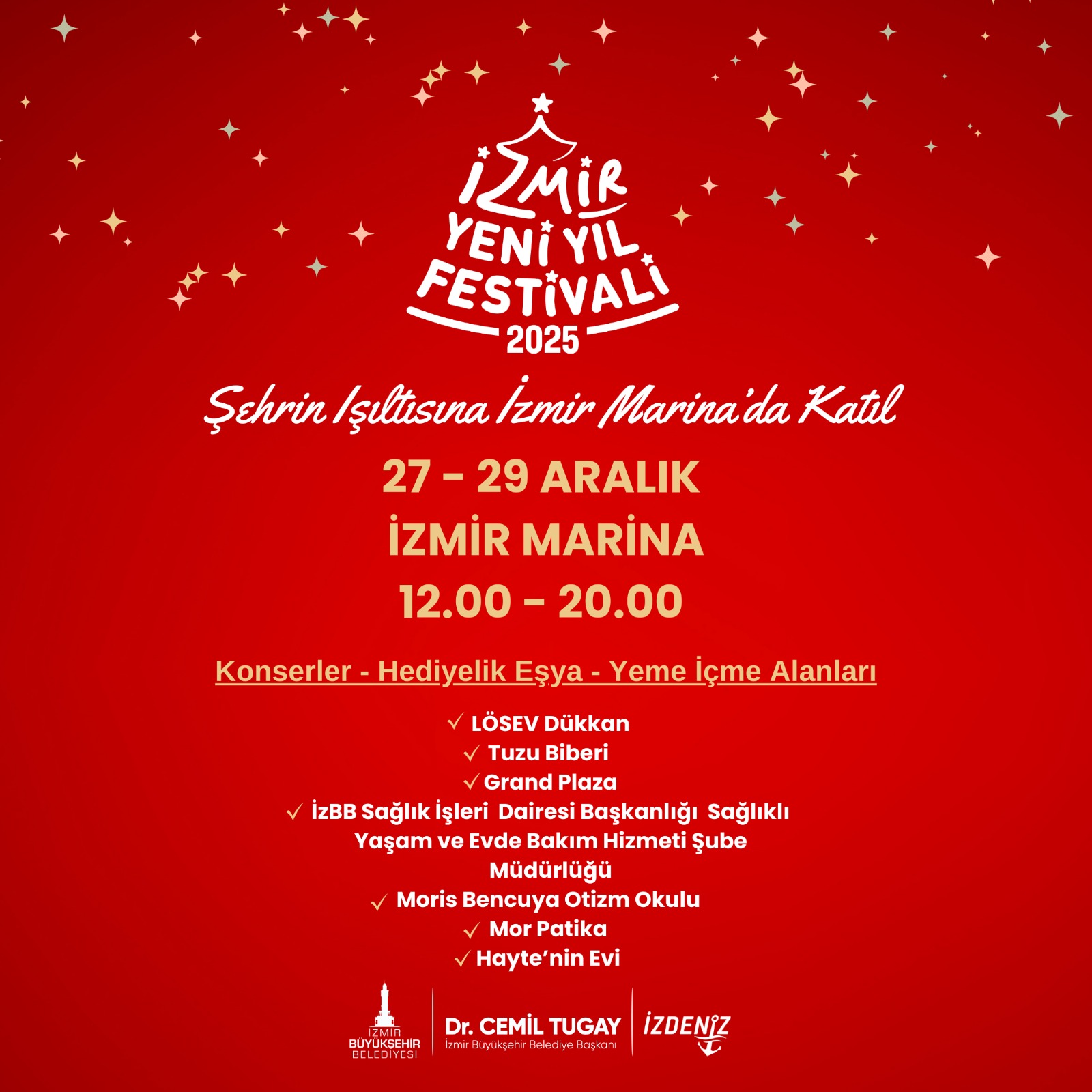 İzmir Marina’daki Yeni Yıl Festivali’ne; Lösev Dükkân, Tuzu Biberi, Maurice Bencuya Otizm Okulu, İzmir Büyükşehir Belediyesi Sağlık İşleri Dairesi Başkanlığı Sağlıklı Yaşam ve Evde Bakım Hizmeti Evde Bakım Hizmeti Şube Müdürlüğü, Mor Patika ve Hayte’nin Evi katılacak.