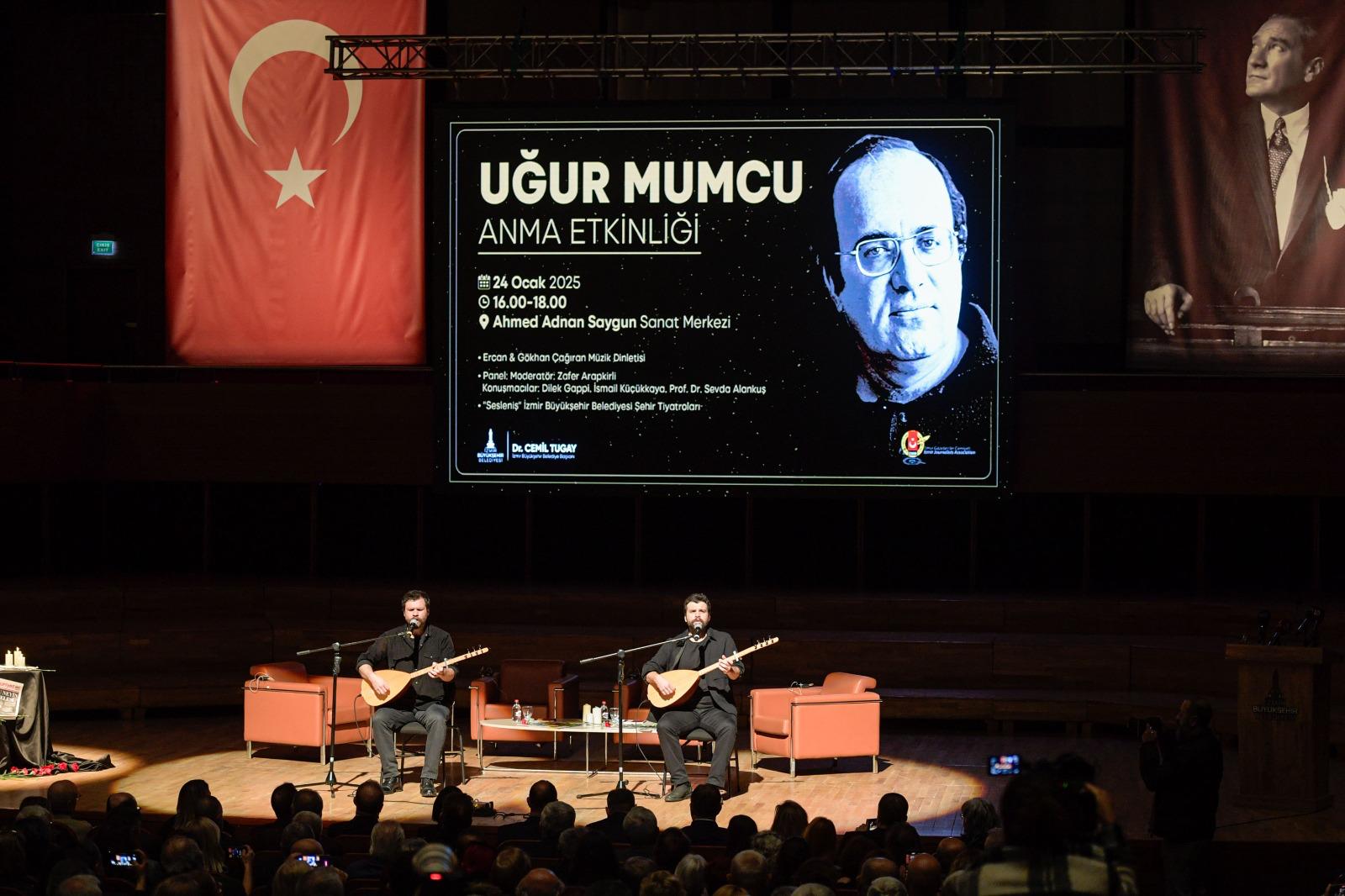 Anma programı Ercan ve Gökhan Çağıran’ın müzik dinletisiyle başladı. Ercan ve Gökhan Çağıran, bağlama eşliğinde Uğur Mumcu’nun katledilişinin ardından 32 yıldır dillerde kendisiyle özdeşleşen “Yiğidim Aslanım”, “Ankara’nın Taşına Bak”, “Uğurlar Olsun” gibi türküleri seslendirdi. AASSM Büyük Salon’u dolduran yüzlerce İzmirli Uğur Mumcu anısına türkülere hep bir ağızdan eşlik etti. Ardından geçmiş dönem CHP İzmir Milletvekili ve Uğur Mumcu Araştırmacı Gazetecilik Vakfı Başkanı Güldal Mumcu’nun mesajı okundu.