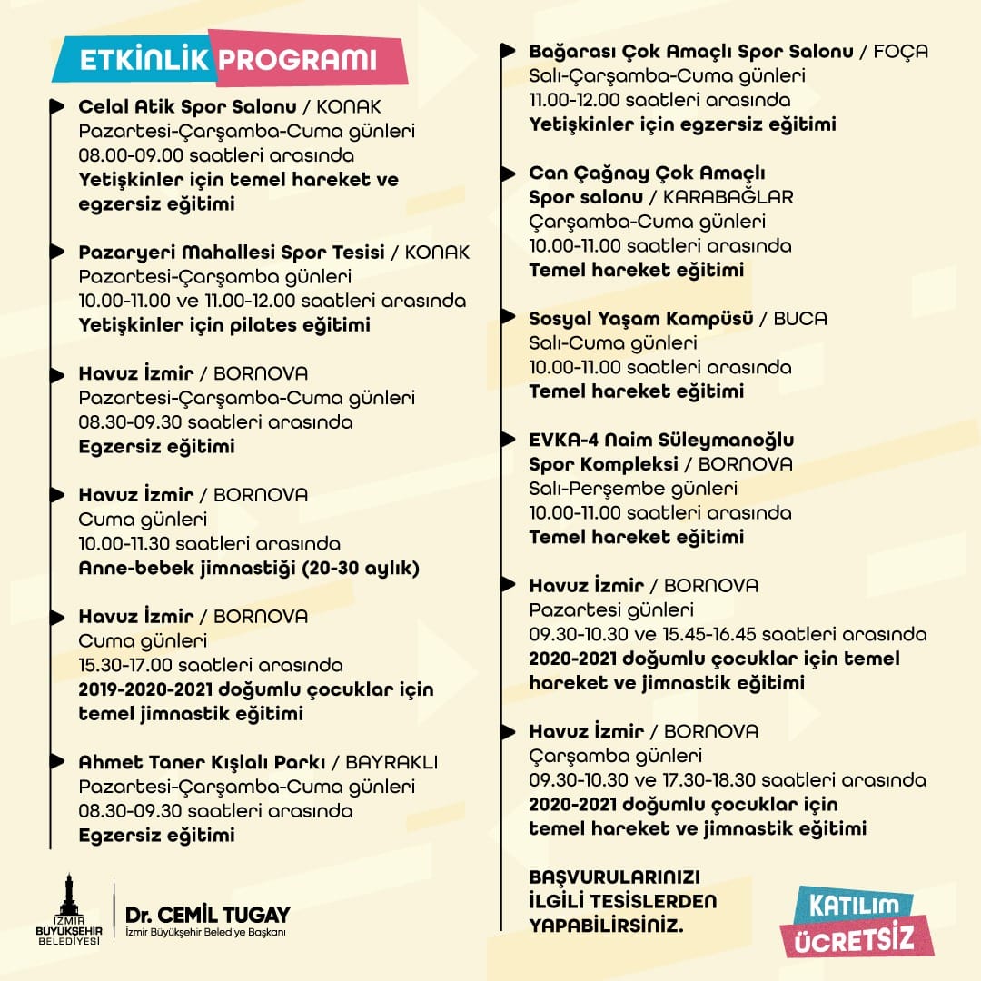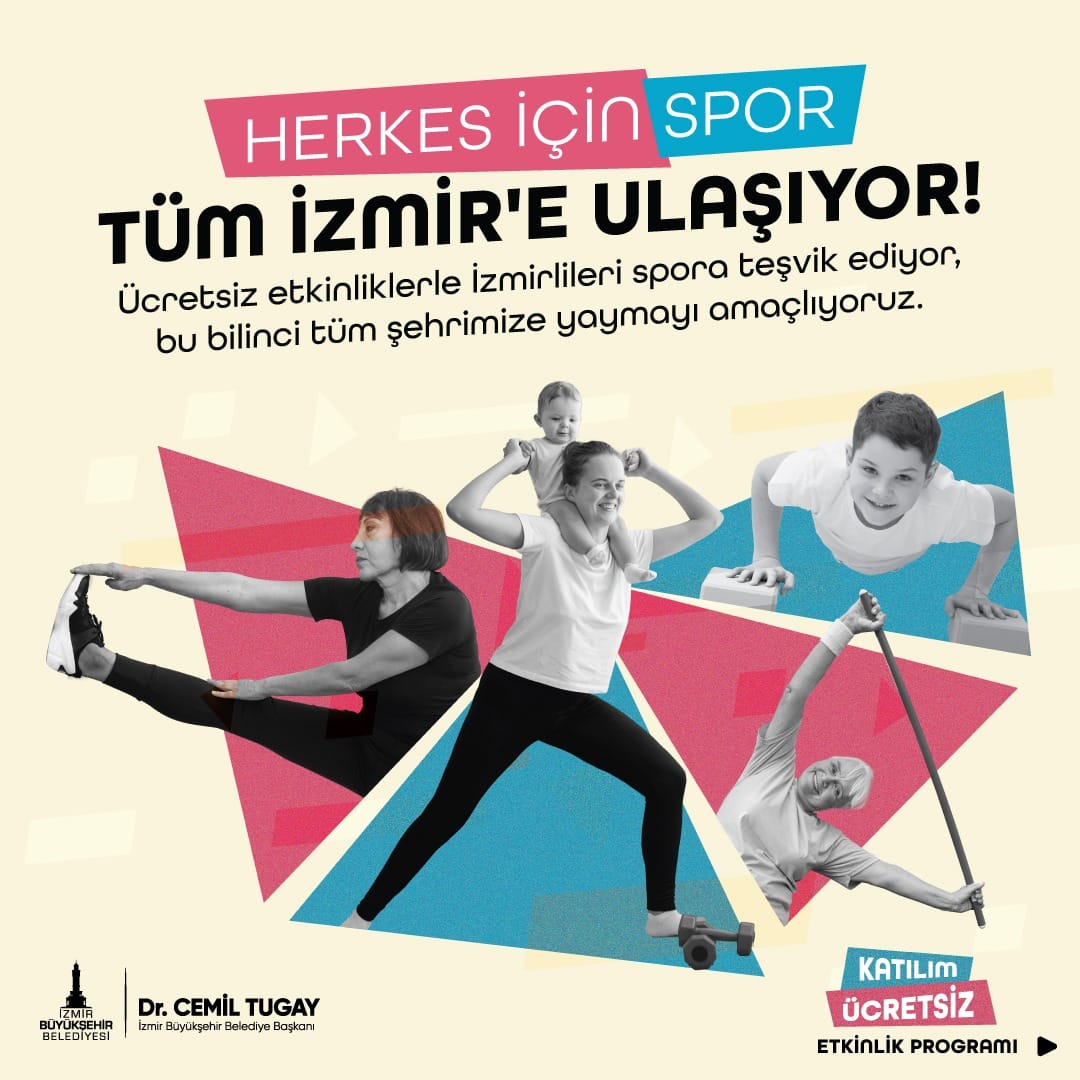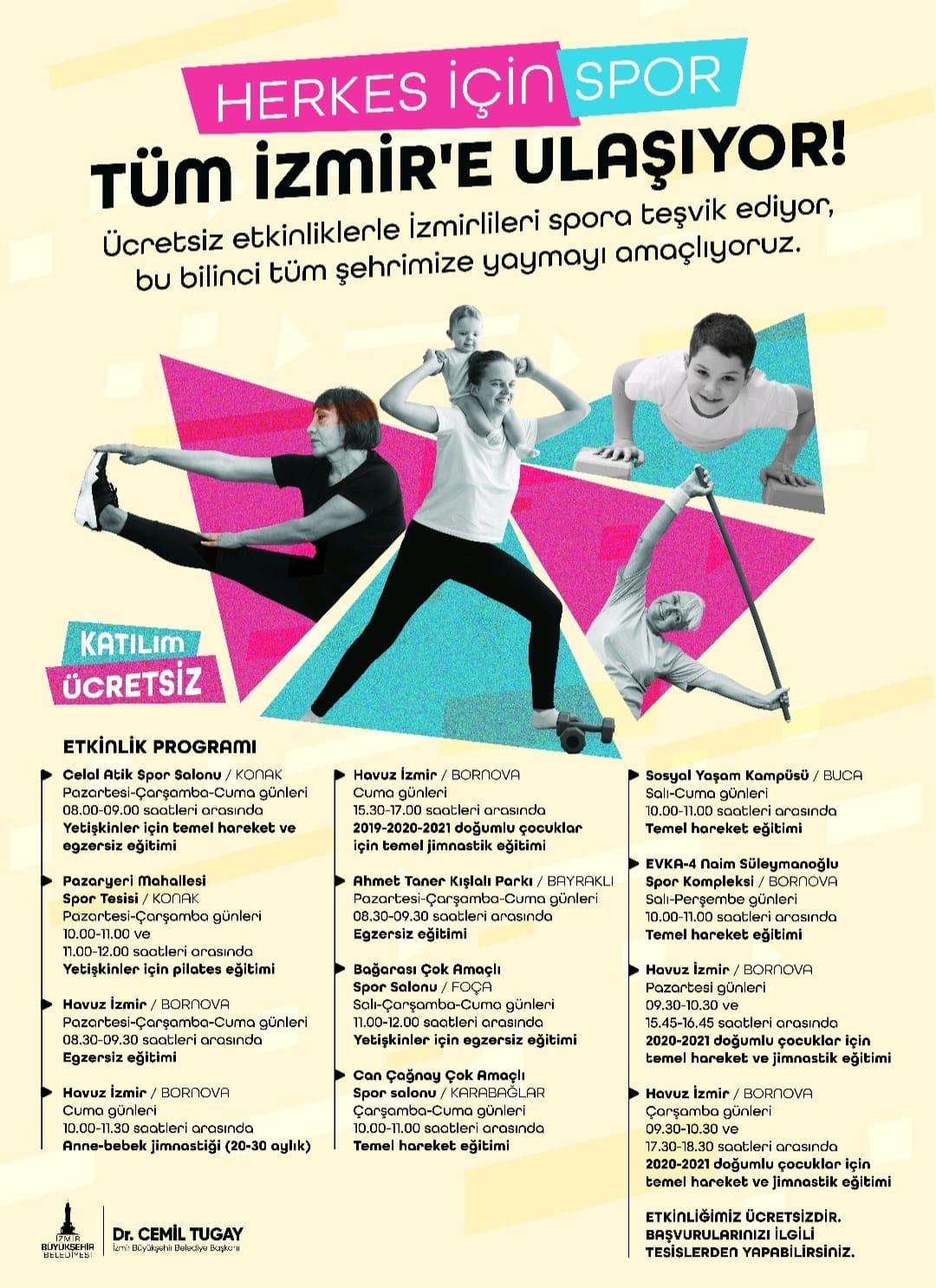 İzmir Büyükşehir Belediyesi, toplumun tüm kesimlerinin spor olanaklarına rahatlıkla ulaşabilmesi için haftanın her günü ücretsiz spor faaliyetleri düzenliyor. Türkiye Sağlıklı Kentler Birliği Başkanı ve İzmir Büyükşehir Belediye Başkanı Dr. Cemil Tugay’ın “Spor Kenti İzmir” hedefi doğrultusunda bir yandan amatör spor kulüplerine nakdi destek ve malzeme yardımı yapılırken, bir yandan da tesis yatırımları sürüyor. Buca, Bornova, Gaziemir, Karşıyaka ve Menderes’te 21 bin metrekare büyüklüğünde 3 Uluslararası Futbol Federasyonu onaylı futbol sahası, 4 halı saha ve 1 ilçe atletizm parkuru için 16 milyon TL yatırım yaparak yenileme çalışmasını tamamlayan Büyükşehir, "Herkes İçin Spor" başlığı altında ücretsiz spor etkinlikleri de yapıyor. Farklı spor salonlarında uzman eğitmenler tarafından hazırlanan programlarda kalp sağlığını iyileştiren, kas iskelet sistemi ve eklem sağlığını güçlendiren, genel sağlığı artıracak egzersizler yapılıyor. Programlara katılmak isteyenlerin, yararlanmak istediği tesiste yüz yüze kayıt yaptırması gerekiyor.