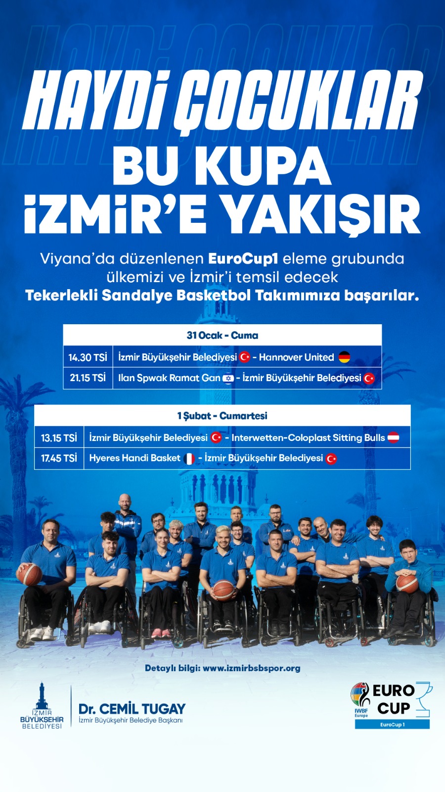 İzmir Büyükşehir Belediyesi Tekerlekli Sandalye Basketbol Takımı bu hafta sonu EuroCup1’de birbirinden zorlu mücadelelere çıkacak. İzmir temsilcisi 31 Ocak-1 Şubat 2025 tarihlerinde oynanacak grup maçlarında, Alman ekolünün güçlü temsilcisi Hannover United, İsrail’den Ilan Spwak Ramat Gan, ev sahibi Avusturya’dan Interwetten-Coloplast Sitting Bulls ve Fransa Kupası’nın son şampiyonu Hyeres Handi Basket ile karşılaşacak.
