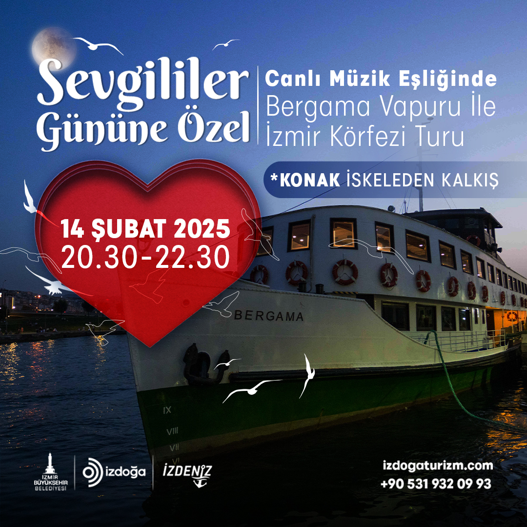 İzmir Büyükşehir Belediyesi 14 Şubat etkinlikleri kapsamında Bergama Vapuru ile İzmir Körfezi turu da düzenliyor. İzmir Büyükşehir Belediyesi şirketleri İZDENİZ ve İZDOĞA işbirliğiyle düzenlenen etkinlik için 14 Şubat saat 20.30’da Konak vapur iskelesinden hareket edilecek. Etkinlik 22.30’da sonlanacak. İzmir Körfezi'nin büyüleyici sularında, panoramik İzmir manzarasıyla Bergama Vapuru’nun nostaljik atmosferinde, enstrümantal canlı müzik dinletisi eşliğinde gerçekleştirilecek tur alternatif bir kutlama seçeneği sunuyor. Ayrıntılı bilgi ve biletler için www.izdogaturizm.com adresi ziyaret edilebilir.