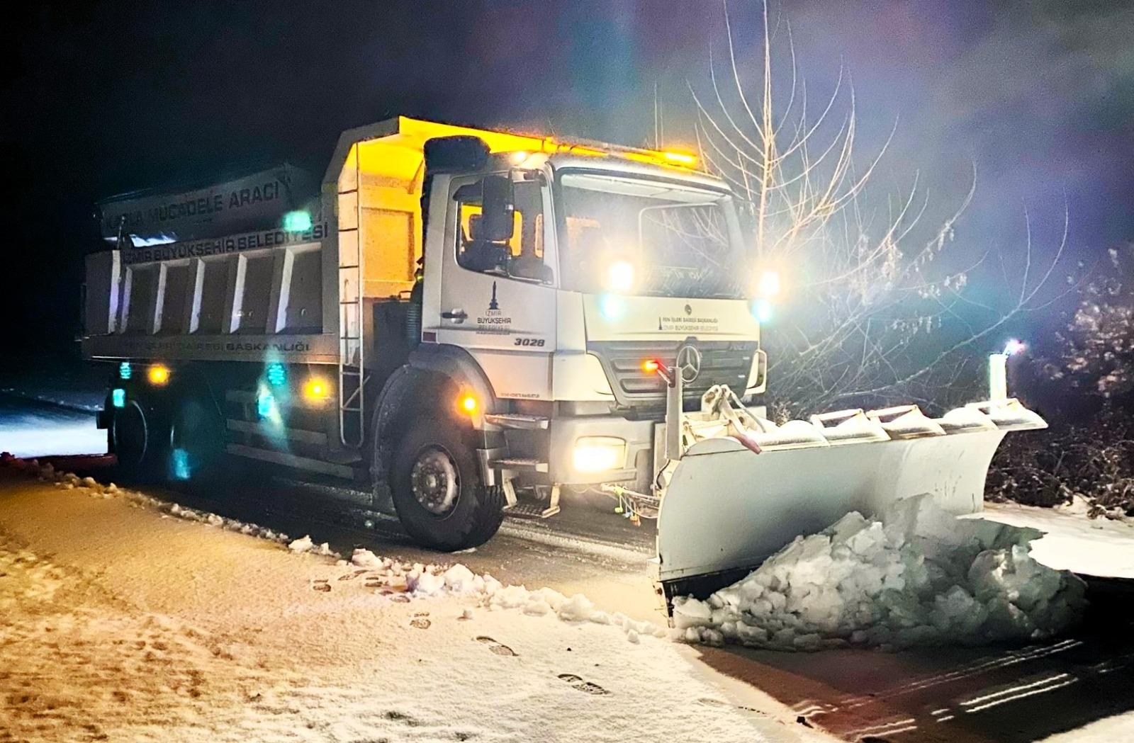 İzmir Büyükşehir Belediyesi ekipleri, şehrin yüksek kesimlerinde etkisini gösteren kar yağışı nedeniyle kapanan yolları açık tutmak için çalışmalarını kesintisiz sürdürüyor. Ekipler 24 saat boyunca kar küreme ve tuzlama araçlarıyla göreve hazır tutuluyor.