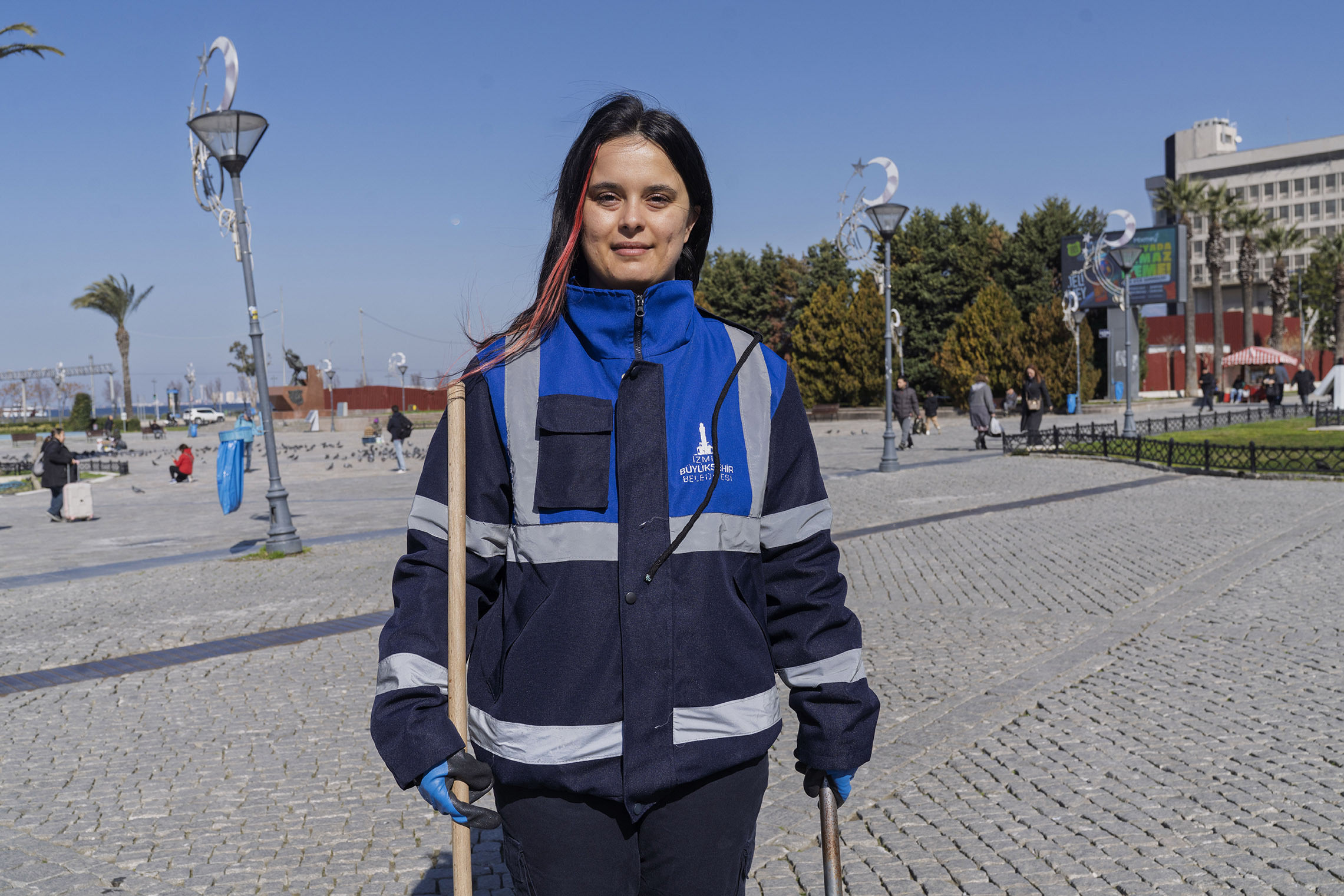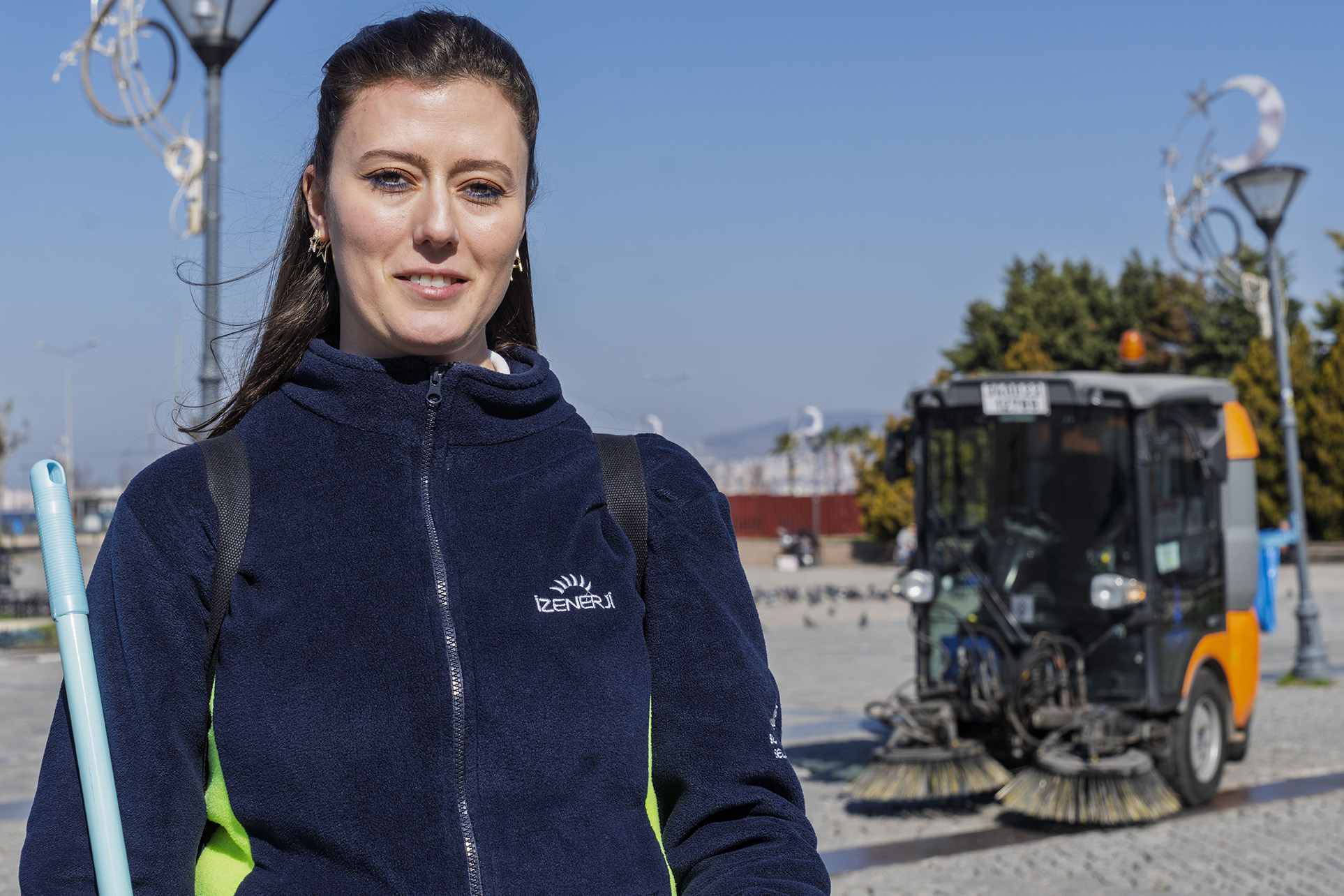 İzmir Büyükşehir Belediyesi İklim Değişikliği ve Sıfır Atık Dairesi Başkanlığı Kent Temizliği Şube Müdürlüğü’nde sokak süpürgecisi olarak görev yapan kadınlardan Sinem Erkan, daha önce kadın kuaförlüğü yaptığını belirtti. Şimdiki işini severek yaptığını belirten Sinem Erkan, “Kadınların çalışma alanında olması önemli. 15 yıl boyunca kuaförlük yaptım. O zaman kadınları güzelleştiriyordum, şimdi de sokaklarımızı. Kadın süpürgeci olarak ilk başladığımızda insanlar biraz yadırgadı ama şimdi herkes bize teşekkür ediyor. Biz de işimizi büyük bir sevgi ile yapıyoruz. İnsanlardan güzel tepkiler gördükçe gururlanıyoruz” dedi.