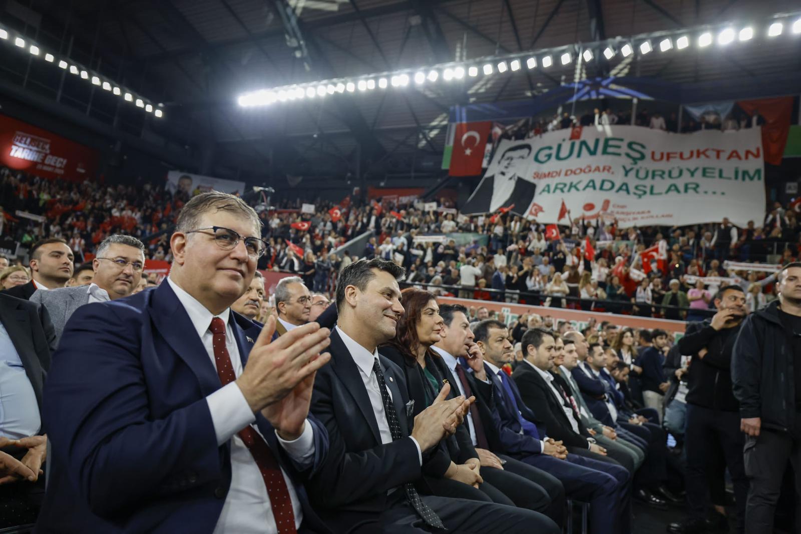 CHP'nin Cumhurbaşkanlığı Ön Seçimi adayı, İstanbul Büyükşehir Belediye (İBB) Başkanı Ekrem İmamoğlu’nun İzmir'de Mustafa Kemal Atatürk Spor Salonu’ndaki programında konuşan İzmir Büyükşehir Belediye Bakanı Dr. Cemil Tugay, İmamoğlu'nun bu önemli yolculuğu İzmir'den başlattığını hatırlatarak, “Bu gurur tablosunu İzmir'e yaşattığınız için hepinize teşekkür ediyorum. Bugün cesur bir yüreği, bir cesur insanı, bir büyük lideri hazırlandığı yolculukta selamlamak için buradayız. Hoş geldiniz Ekrem Başkanım, sefalar getirdiniz İzmir’imize. ‘Biz Mustafa Kemal'in askerleriyiz' diyoruz. Neyin mirasını devraldığımızı bildiğimiz için bunu söylüyoruz. Kurtuluş yok tek başına, ya hep beraber ya hiçbirimiz diyoruz. Bu birlik ve beraberliğin farkında olduğumuz için bunu söylüyoruz. Değerli yoldaşlarım, CHP'nin bir neferi olmak onurdur. Bu partinin çatısı altında siyaset yapmak büyük bir onurdur. Bu onuru kimi zaman sıradan bir üye olarak, kimi zaman örgütte farklı görevler üstlenerek yaşıyoruz. Bugün belediye başkanları olarak ya da örgütte görev alan pek çok arkadaşımızla beraber, aldığımız sorumluluğun farkındayız” dedi.