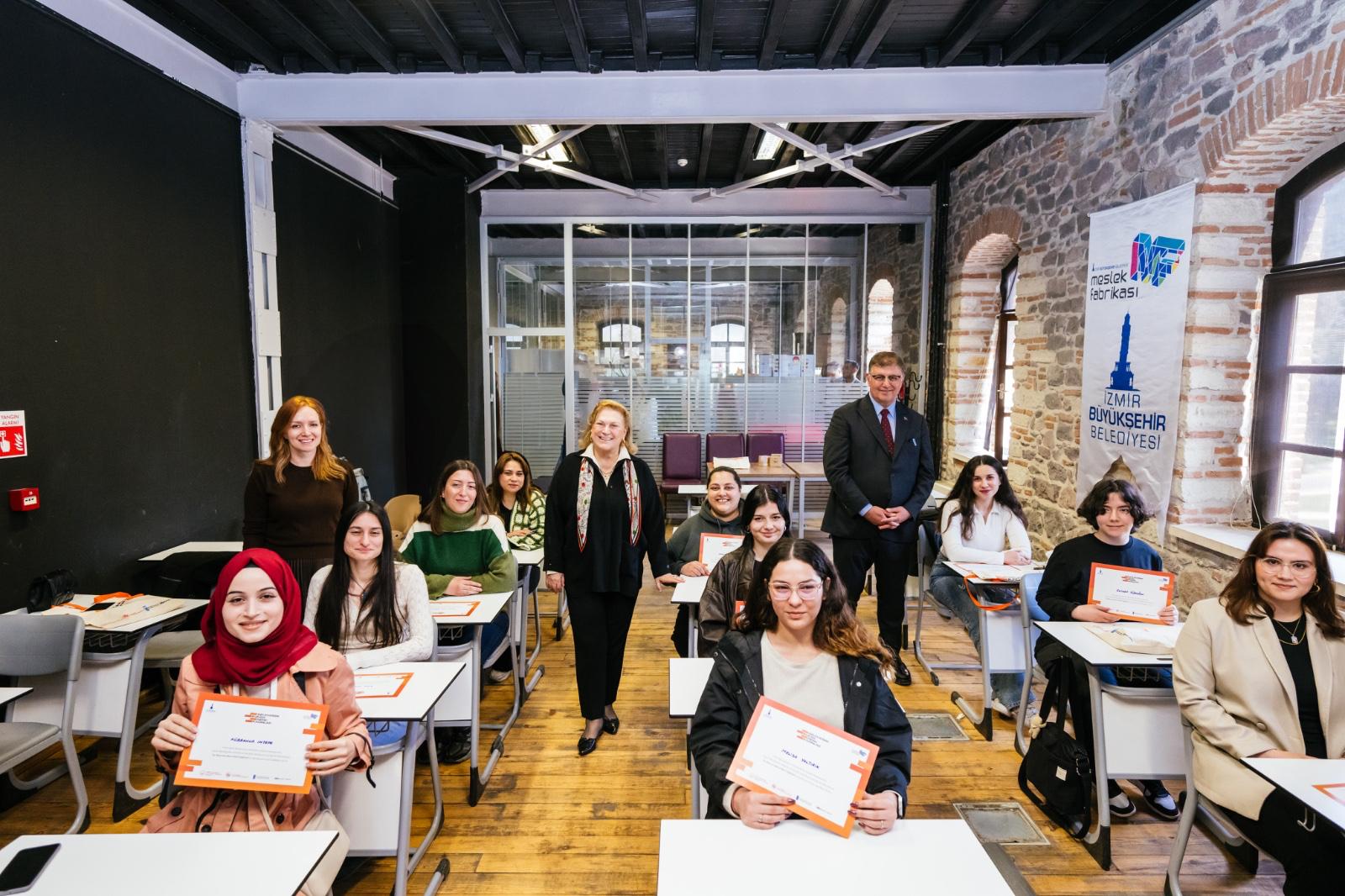 Konuşmaların ardından Başkan Tugay, eşi Öznur Tugay ve Güler Sabancı, Genç Barista Yetiştirme eğitimi sınıfını gezdi. Güler Sabancı, burada eğitim gören kadınlarla sohbet ederek hatıra fotoğrafı çektirdi. Ziyarette kahve yapımının incelikleri de eğitmen tarafından aktarıldı. Tezgâhın başına geçen Sabancı, espresso yaptı. Daha sonra İşe Başvuru Becerileri Geliştirme Sınıfı kursiyerleri ile bir araya gelindi. Başkan Tugay ve Sabancı, mezun olmaya hak kazanan kursiyerlere sertifikalarını da teslim etti. İzmir buluşmasında, hem proje kapsamında mezun olan kadınlar hem de kurs gören kadınlar ile toplu fotoğraf çekildi.