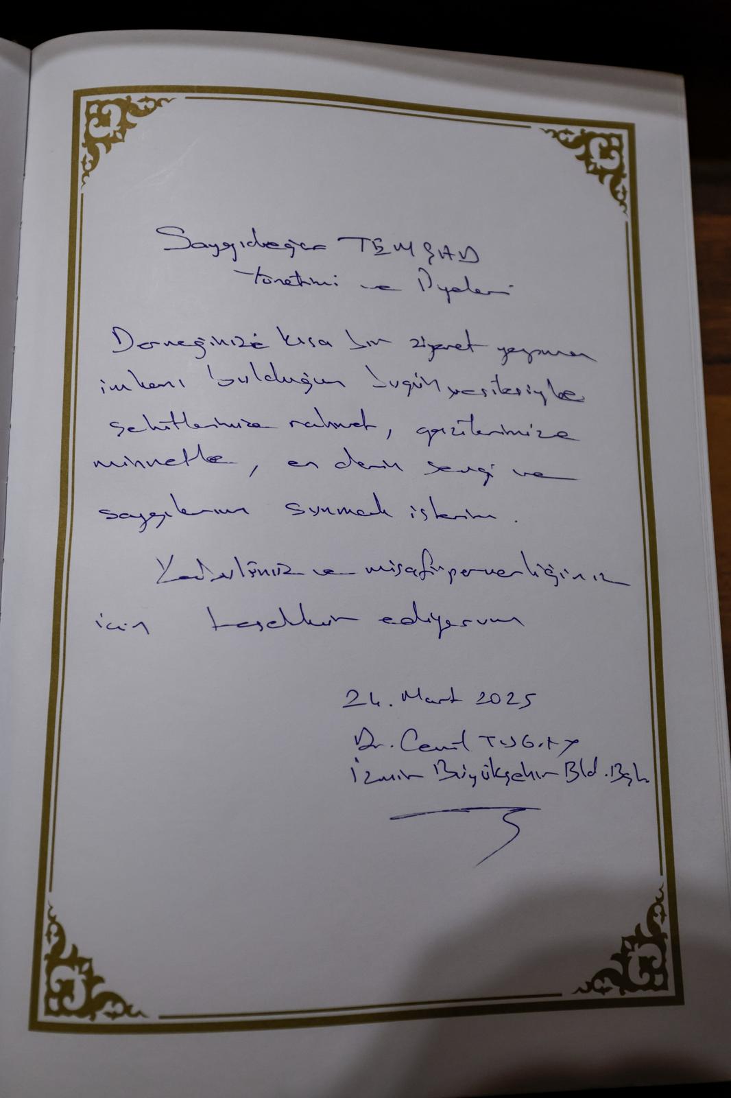 Başkan Tugay ziyaret sonunda derneğin anı defterine duygu ve düşüncelerini yazdı.