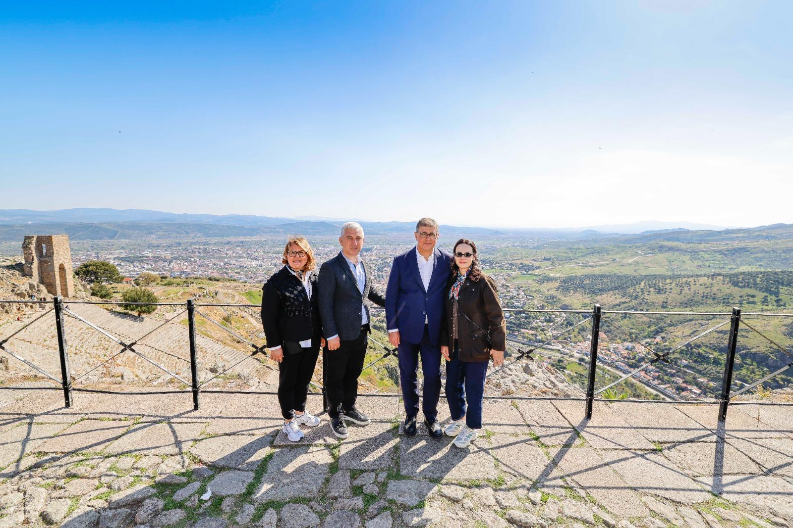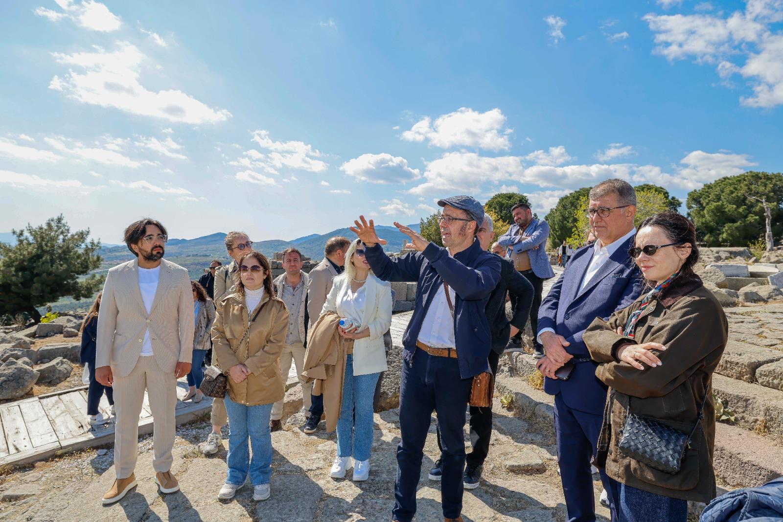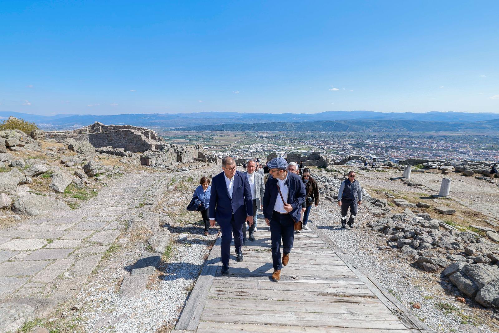 Başkan Tugay ve beraberindeki heyet Ferizler Mahallesi’nin ardından tarihi Akropol’ü ziyaret etti. Bergama Kazı Başkanı Prof. Dr. Felix Pirson rehberliğinde tamamlanan gezi sonrası Alman Kazı Enstitüsü’ne geçildi. Başkan Tugay, Kızıl Avlu’ya da gitti, Geleceğe Miras Kazısı hakkında Kazı Koordinatörü Prof. Dr. Yusuf Sezgin’den bilgi aldı. Sezgin, Başkan Tugay’a İzmir Büyükşehir Belediyesi’nin kazı çalışmalarına verdiği destekler için teşekkür etti.
