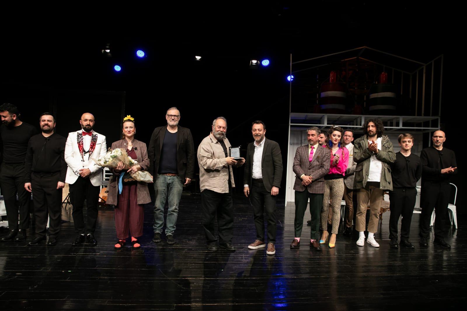 Bursa Büyükşehir Belediyesi Şehir Tiyatrosu Genel Sanat Yönetmeni Ali Düşenkalkar’a, İzBB Kültür ve Sosyal İşler Dairesi Başkan Vekili Yener Ceylan tarafından plaket, Şehir Tiyatrosu oyuncularına da çiçek takdim edildi. Yener Ceylan, iki tiyatro arasındaki paylaşımın artmasını temenni ettiklerini dile getirdi.