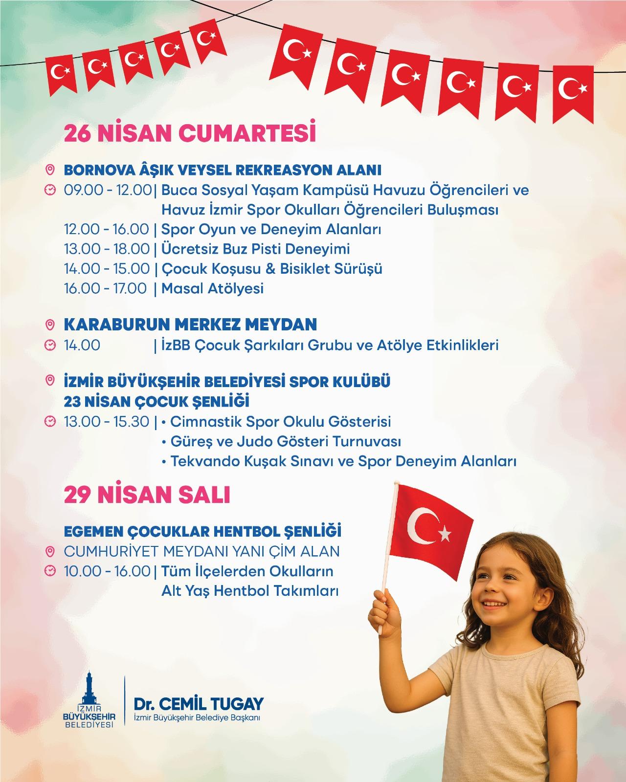 25 Nisan’da çocuklara yönelik tiyatro gösterisi de yapılacak. Kültürpark Gençlik Tiyatrosu’nda 18.00-19.30 saatlerinde Genç İzmir Tiyatro Topluluğu tarafından çocuklara özel ücretsiz “Şulibuli” adlı tiyatro oyunu sahnelenecek. Ulusal Egemenlik ve Çocuk Bayramı Spor Şenliği de 26 Nisan’da 09.00-18.00 saatleri arasında Âşık Veysel Rekreasyon Alanı’nda yapılacak. İzmir Büyükşehir Belediyesi Spor Kulübü ile sponsor firmaların iş birliğinde yapılacak etkinlikte spor oyun ve deneyim alanları oluşturulacak. Ücretsiz buz pisti deneyimi, çocuk koşusu ve bisiklet sürüşü ile masal atölyesi de var.