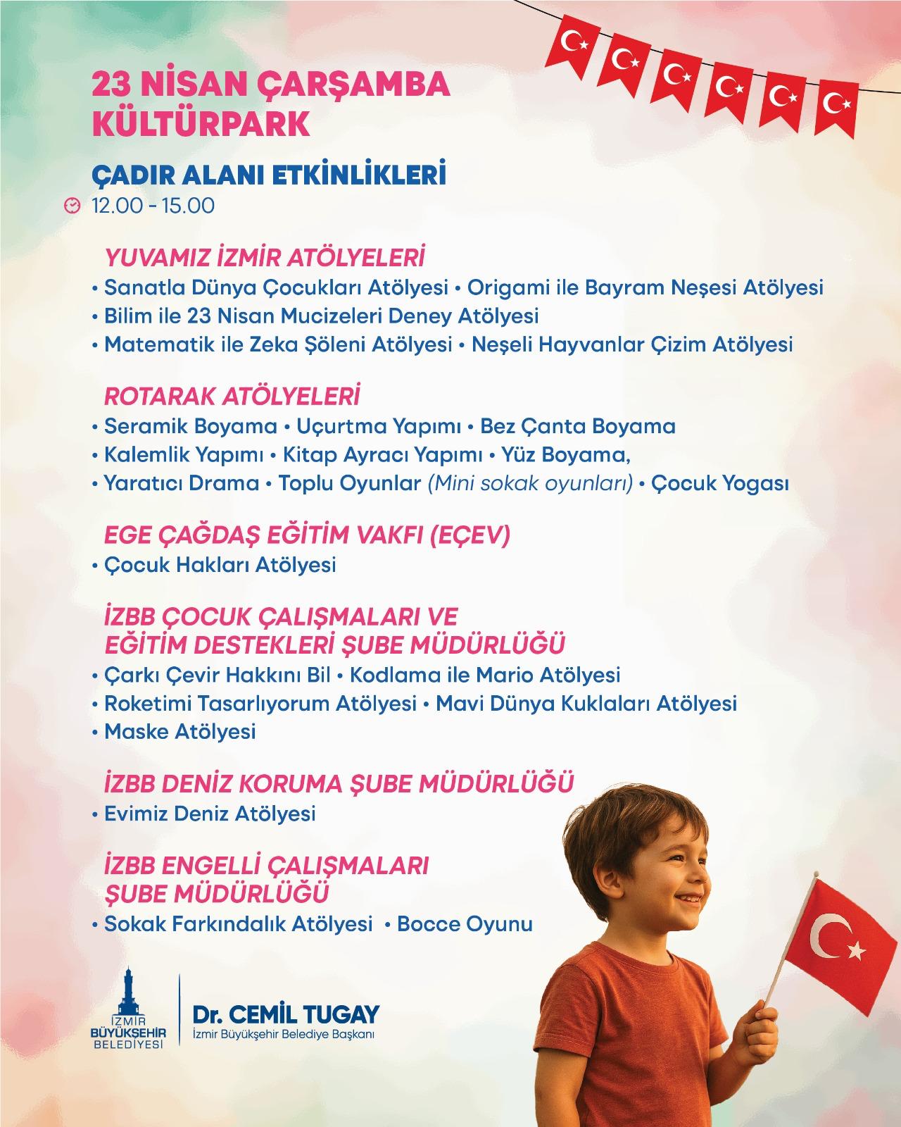 Kültürpark’ta kurulan çadır alanında 12.00-15.00 saatlerinde atölyeler olacak. İZELMAN AŞ Yuvamız İzmir Çocuk Etkinlik Merkezlerinin Sanatla Dünya Çocukları Atölyesi, Origami ile Bayram Neşesi Atölyesi, Bilim ile 23 Nisan Mucizeleri Deney Atölyesi, Matematik ile Zekâ Şöleni Atölyesi ve Neşeli Hayvanlar Çizim Atölyesi çocukların keyifli zaman geçirmesini sağlayacak. Rotarak atölyelerinde ise seramik boyama, uçurtma yapımı, bez çanta boyama, kalemlik yapımı, kitap ayracı yapımı, yüz boyama, yaratıcı drama, toplu oyunlar ve çocuk yogası yer alacak. Atölye çalışmaları kapsamda ayrıca Ege Çağdaş Eğitim Vakfı’nın (EÇEV) Rüzgâr Gülü Atölyesi, Çocuk Çalışmaları ve Eğitim Destekleri Şube Müdürlüğü’nün Çarkı Çevir Hakkını Bil Atölyesi, Kodlama ile Mario Atölyesi, Roketimi Tasarlıyorum Atölyesi, Mavi Dünya Kuklaları Atölyesi, Maske Atölyesi, Deniz Koruma Şube Müdürlüğü’nün Evimiz Deniz Atölyesi ve Engelli Çalışmaları Şube Müdürlüğü’nün Sokak Farkındalık Atölyesi ile Bocce oyunu olacak.