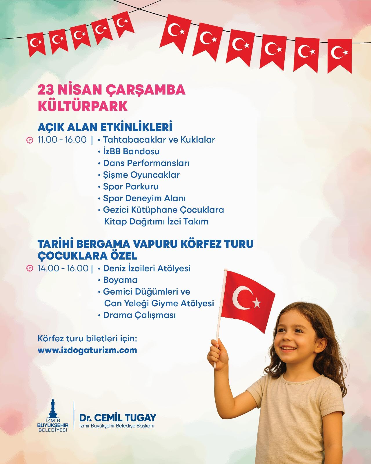 İzmir Büyükşehir Belediyesi, 23 Nisan Ulusal Egemenlik ve Çocuk Bayramı’nı bayram havası yaşatacak etkinliklerle kutlayacak. Dört bir yanda yapılacak etkinliklerle çocuk neşesi kent geneline yayılacak.