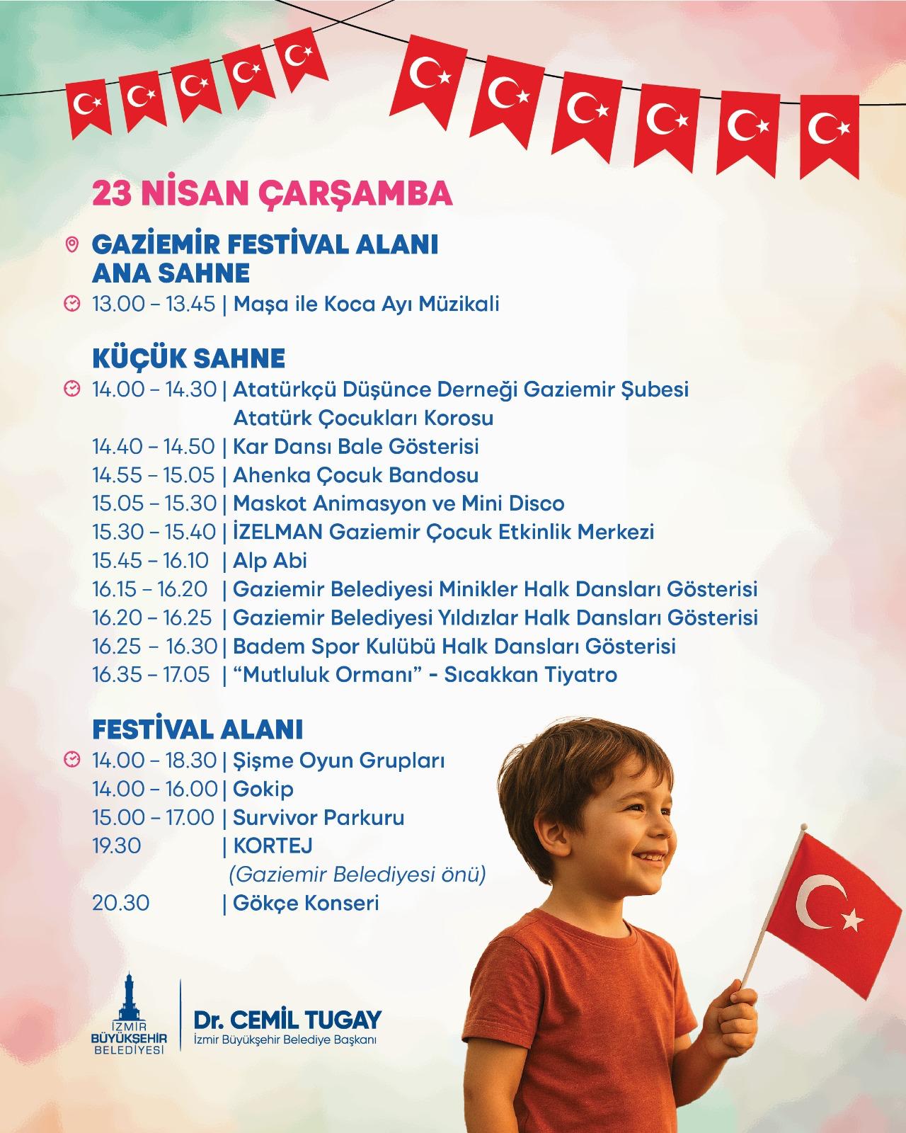 İzmir Büyükşehir Belediyesi ve Gaziemir Belediyesi iş birliği ile düzenlenecek 27. Gaziemir 23 Nisan Ulusal Egemenlik ve Çocuk Bayramı Programı, 19-23 Nisan tarihlerinde yapılacak. Gaziemir’deki kutlamalarda animasyon ve yüz boyama gibi eğlenceli etkinliklerden müzikallere kadar çok sayıda etkinlik yer alacak. Festival, Gökçe konseri ile sona erecek.
