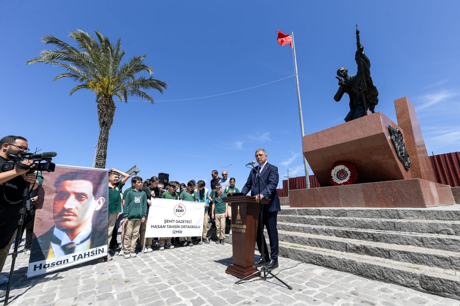 İzmir’in işgaline karşı ilk kurşunu sıkan gazeteci Hasan Tahsin, şehit edilişinin 106’ncı yılında meslektaşları tarafından törenle anıldı. Hasan Tahsin’in Konak’taki anıtı önünde düzenlenen programa katılan İzmir Büyükşehir Belediye Başkanı Dr. Cemil Tugay, “Direnişin sembol ismi Hasan Tahsin gazetecidir ve gazetecilerin onurudur. Ama aynı zamanda İzmir’in, Türkiye’nin gururudur. Herkes bu kahramanlığın hikayesini duymuştur. Eline kalemi aldığında içindeki korkuyu atarak ‘ben doğruları yazacağım’ diyen bütün gazeteciler de kahramandır” dedi.