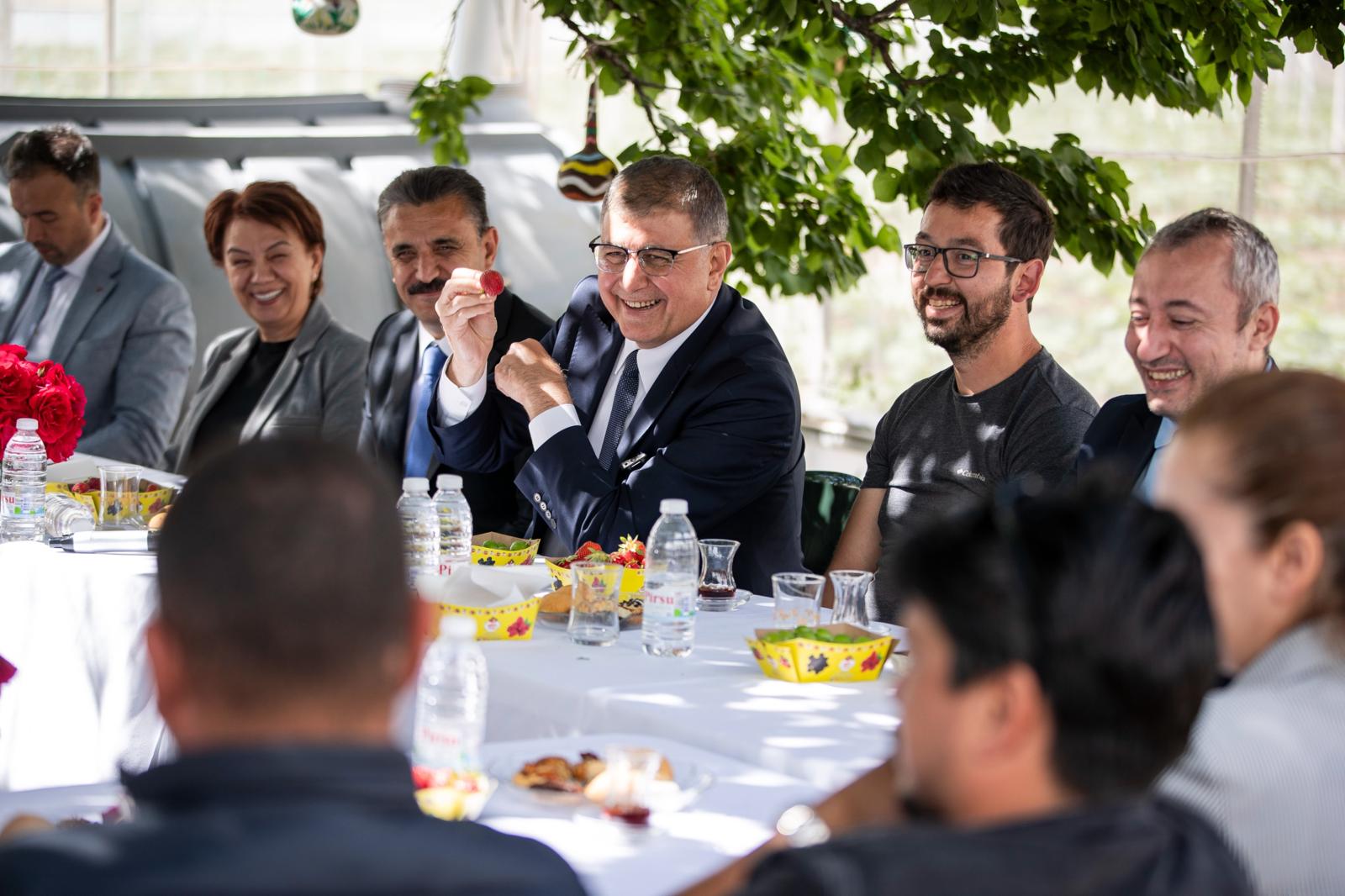 Başkan Tugay, açılış programı öncesi Dikilili çiftçilerle bir araya geldi. Bölgede çilek üretimi yapan İmren ailesinin seralarını ziyaret eden Başkan Tugay, çilek hasadına katıldı. Çilek hasadının ardından bölgedeki üretim hakkında bilgi alan Başkan Tugay, çiftçilerin sorunlarını dinledi. Organik tarımdan kırsal kalkınmaya kadar pek çok konuda çiftçilerle sohbet eden Başkan Tugay, İzmir Büyükşehir Belediyesi olarak her zaman yanlarında olduklarını ifade etti.