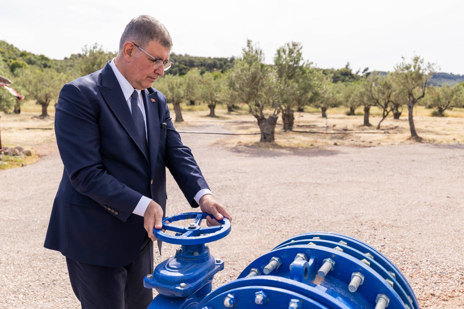 Konuşmaların ardından Başkan Tugay, zeytinlik alanına geçerek iletim hattının vanasını çevirdi. Tesisten gelen yüksek basınçlı su, damla sulama yöntemiyle faaliyete başladı.