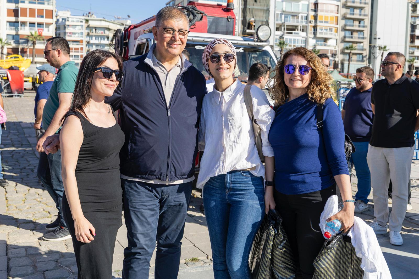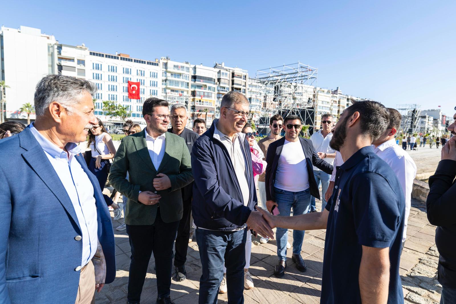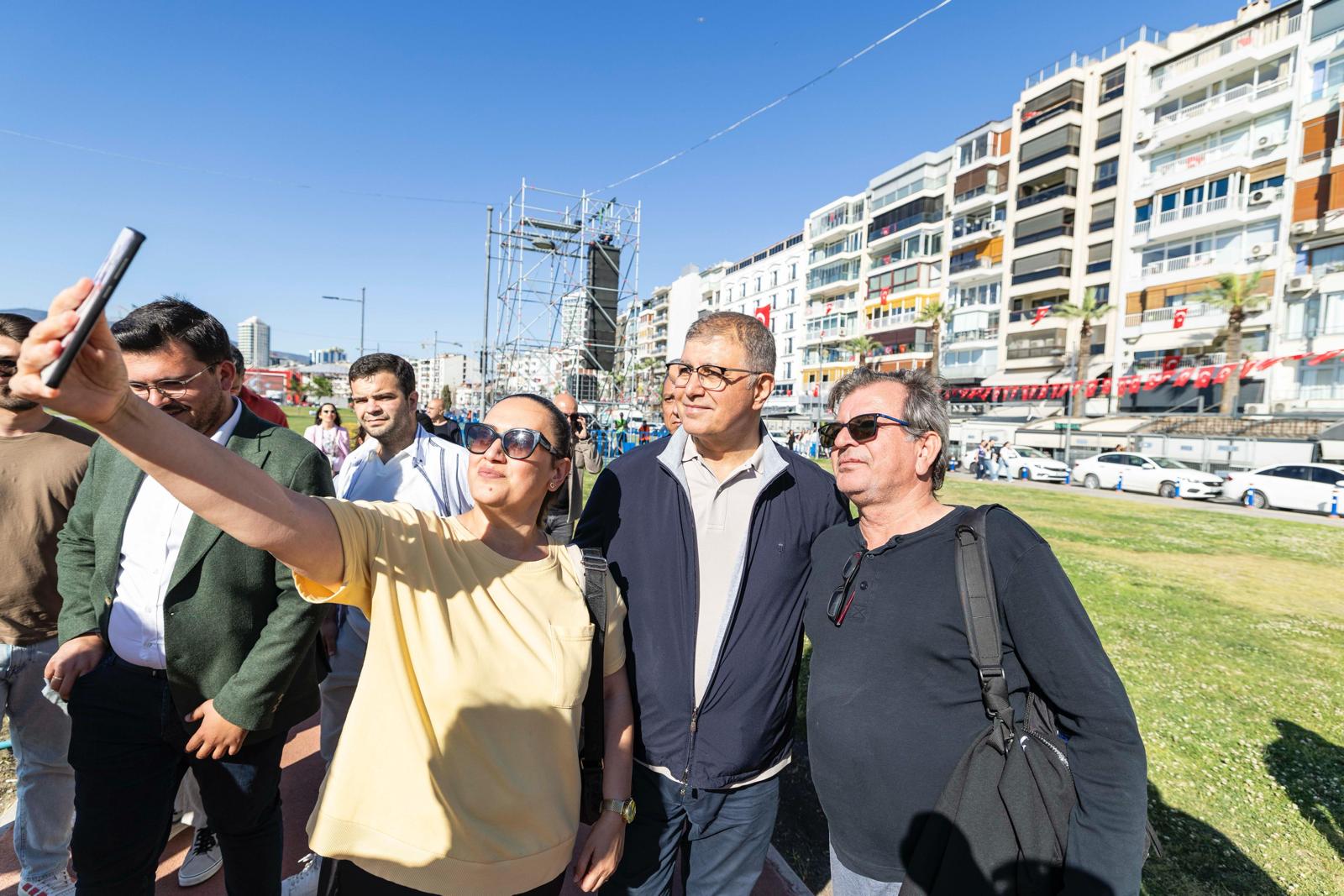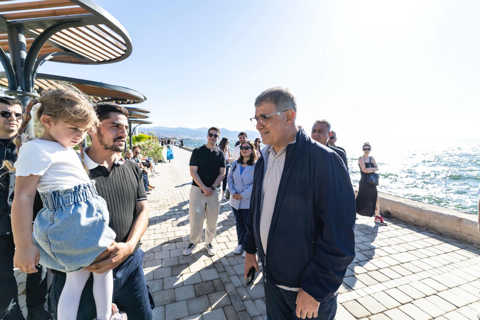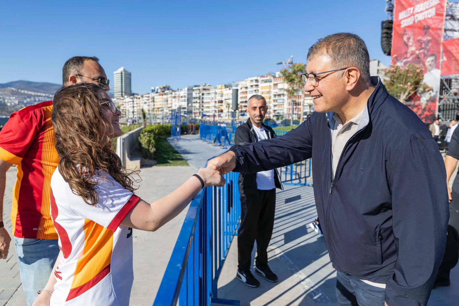 Başkan Tugay Kordon'da yürürken yanında gelen yurttaşlarla da sohbet ederek hatıra fotoğrafı çektirdi. Şampiyonluğa oynayan Galatasaray'ın maçını seyretmek için Kordon'da bulunan Galatasaray formalı baba ve kızına başarılar dileyen Başkan Tugay, miting için Denizli'den gelen bir aile ile de konuştu.