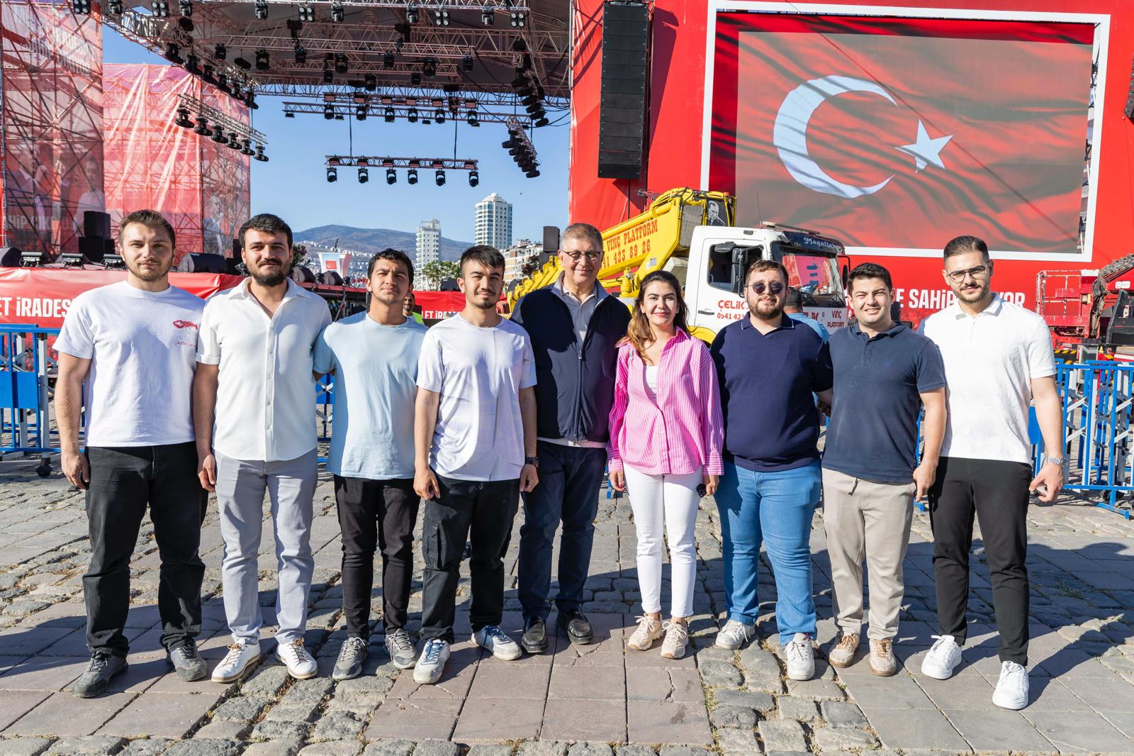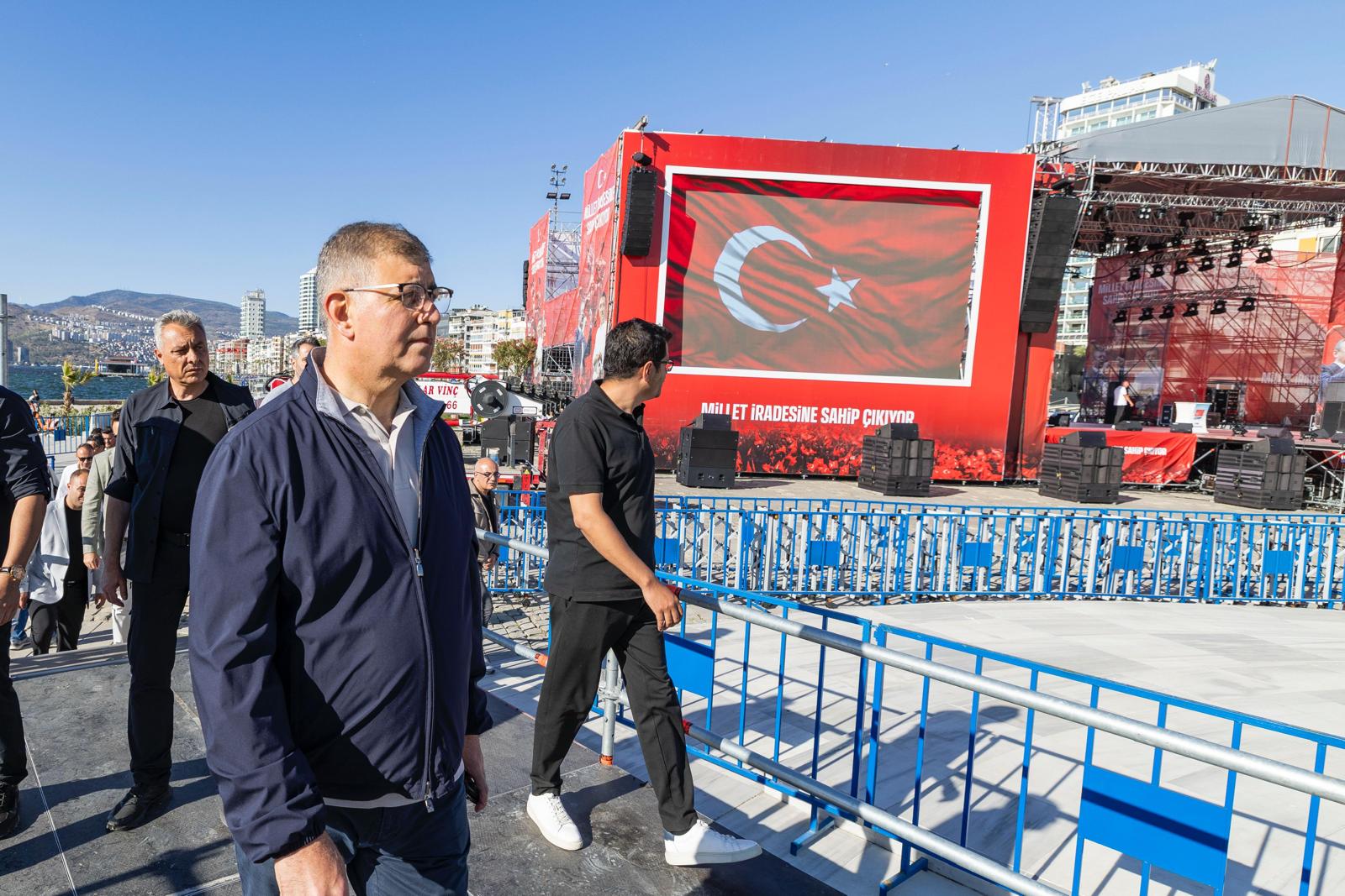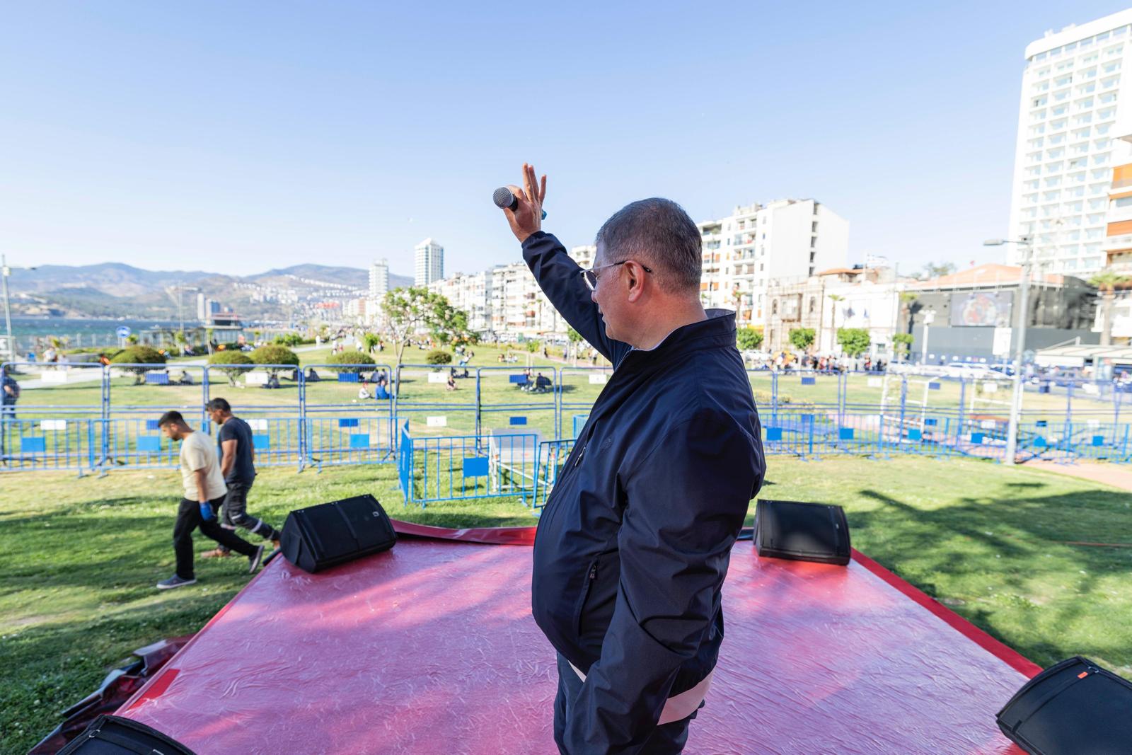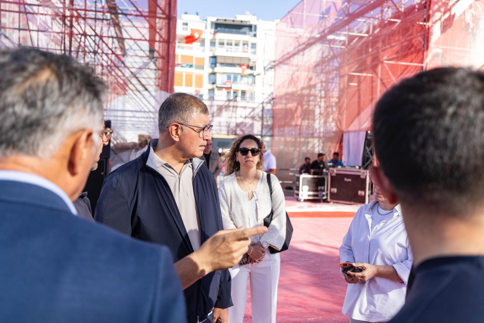 İzmir Büyükşehir Belediye Başkanı Dr. Cemil Tugay, 19 Mayıs Atatürk'ü Anma, Gençlik ve Spor Bayramı'nda düzenlenecek 19 Mayıs İzmir Mitingi için Gündoğdu Meydanı’nda süren çalışmaları inceledi. Yarın İzmir tarihinin en önemli günlerinden birine tanıklık edeceklerini söyleyen Başkan Tugay, “Heyecanlıyız. Cumhuriyet, demokrasi, insan hakları, adalet isteyen herkesi meydana bekliyoruz. Gençliğin Bayramı Türkiye'ye umut, tüm ülkemize moral olacak” dedi.