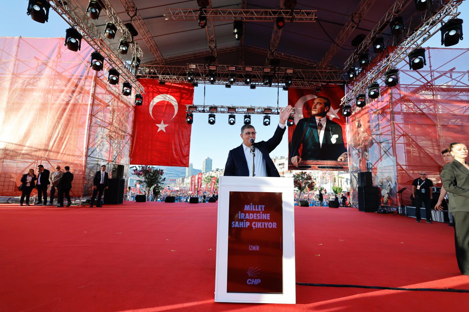 CHP tarafından 19 Mayıs Atatürk’ü Anma Gençlik ve Spor Bayramı’nda organize edilen “Millet İradesine Sahip Çıkıyor İzmir Mitingi”, Gündoğdu Meydanı’nda büyük bir coşkuya sahne oldu. CHP Genel Başkanı Özgür Özel ve eşi Didem Özel, eski CHP Genel Başkanı Hikmet Çetin, İzmir Büyükşehir Belediye Başkanı Dr. Cemil Tugay ve eşi Öznur Tugay, Ekrem İmamoğlu’nun eşi Dilek İmamoğlu, CHP İzmir İl Başkanı Şenol Aslanoğlu ve eşi Duygu Aslanoğlu, CHP Parti Meclisi (PM) ve Yüksek Disiplin Kurulu (YDK) Üyeleri, milletvekilleri, belediye başkanları, parti mensuplarının yer aldığı tarihi mitingde yurttaşlara seslenen Başkan Tugay, “Türkiye elbette büyük ve güçlü bir ülke ama yanlış yönetilince yoksulların ve işsizlerin ülkesi olduk. Cumhuriyet kurulduğu yıllarda idealist, vatansever yöneticileri vardı. Halk da onların etrafında kenetlenmişti. İşte bu şekilde Türkiye hızla büyümüş ve yükselmişti ama şimdi; hata üstüne hata yapıyor, acısını çiftçisiyle, emeklisiyle, öğrencisiyle, işçisiyle, memuruyla ve en önemlisi iş bulamayan gençleriyle tüm halkımız çekiyor. Gençlerimiz başka ülkelerde kendisine gelecek arıyor. Onlara ‘Giderlerse gitsin’ diyor birileri. İçimiz acıyor, çünkü gidenler bizim geleceğimiz. Bu yanlışlara azim ve kararlılıkla hep beraber ‘dur’ diyeceğiz değerli kardeşlerim ve büyüklerim. Türkiye kaybettiği her şeyi tekrar geri kazanacak. Çalışarak başaracağız. Kendimize, halkımıza, değerlerimize inanarak bunu başaracağız” diye konuştu.