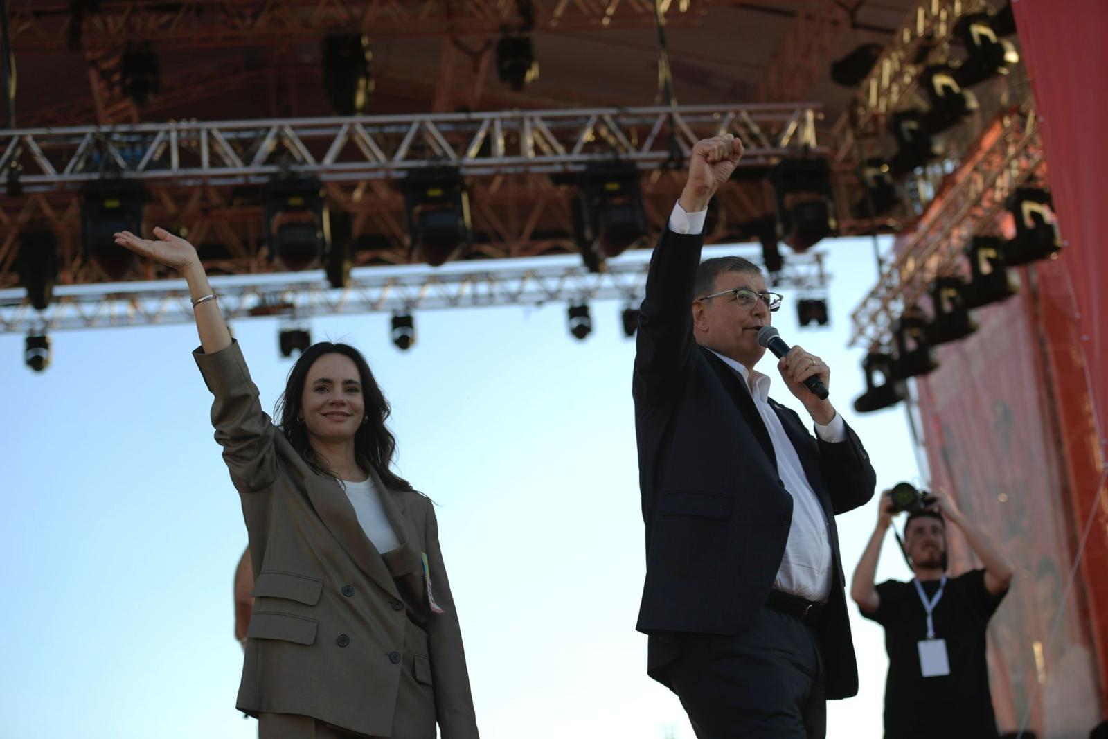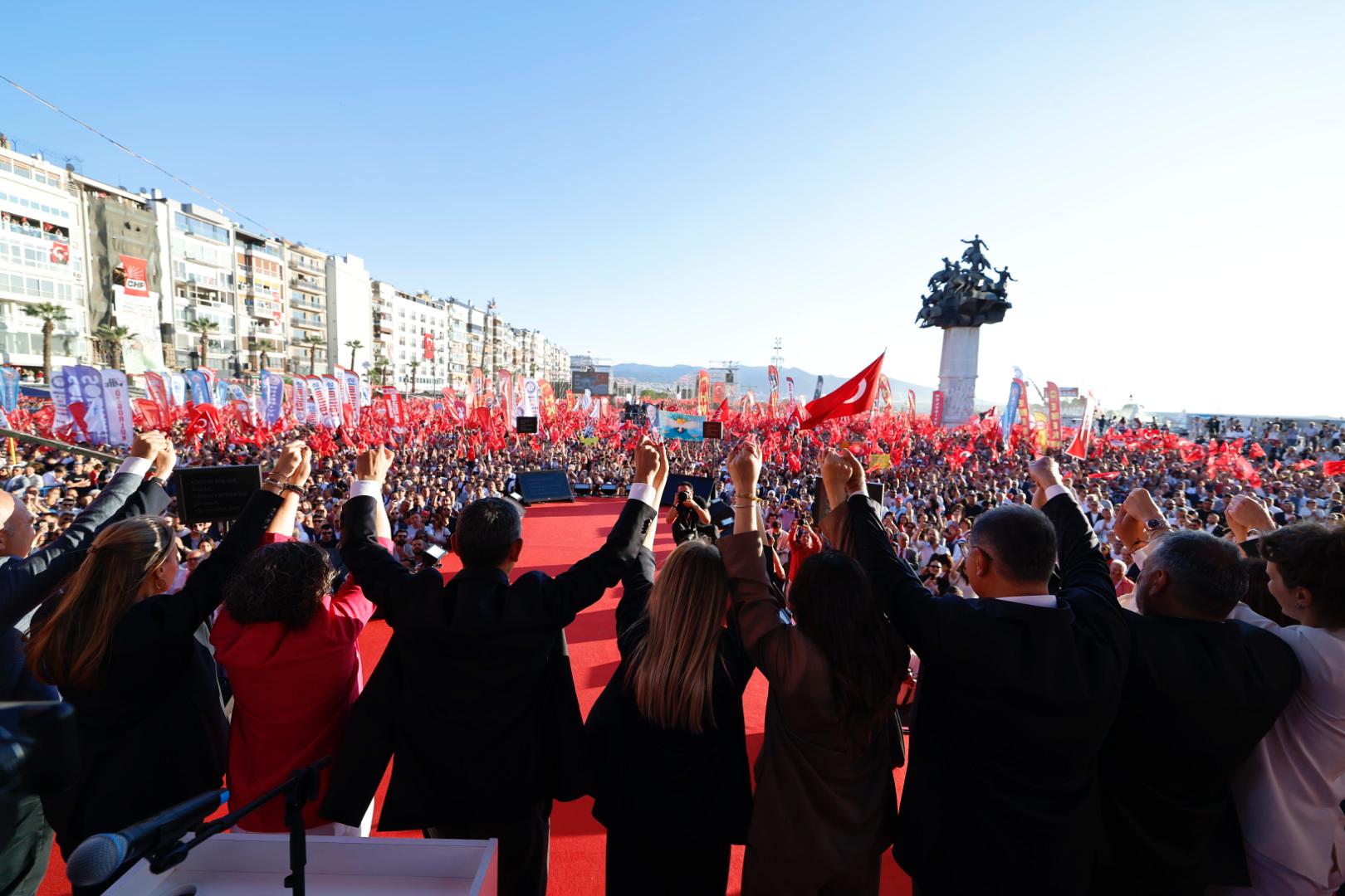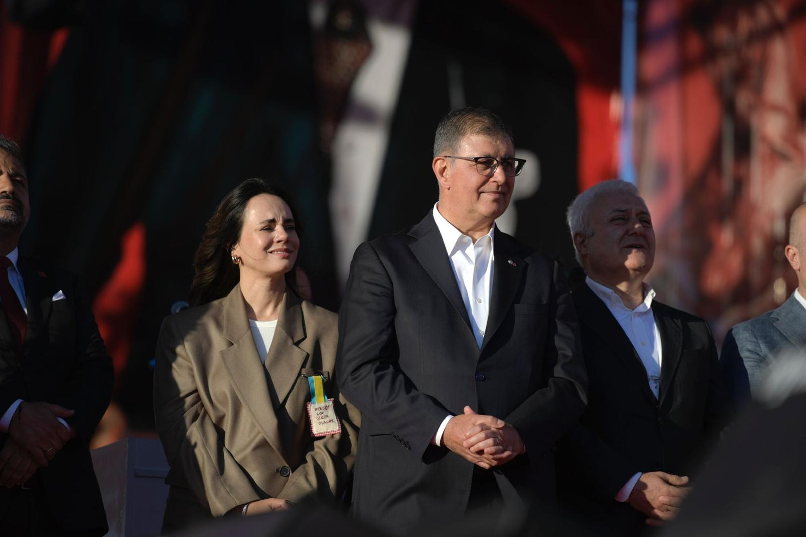 Sevginizi bu millete vermeye hazır mısınız?’ Ekrem Başkan’ımıza ve onunla beraber cezaevinde tutulan tüm yoldaşlarımıza buradan selam söylüyoruz. Onlara hep beraber selam söylüyor muyuz? Önümüzdeki günlerde yapacağımız bu mücadeleyi daha da büyütmeye hazır mıyız İzmir, hazır mıyız Türkiye? Yolumuz açık olsun kardeşlerim.”