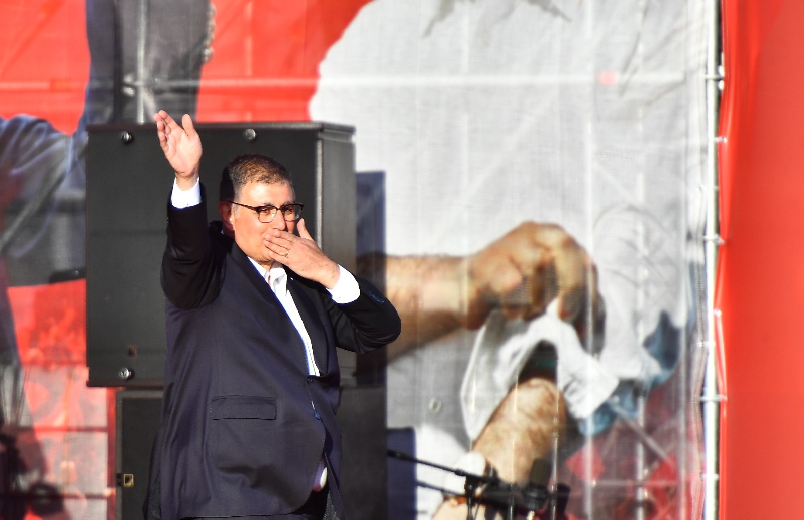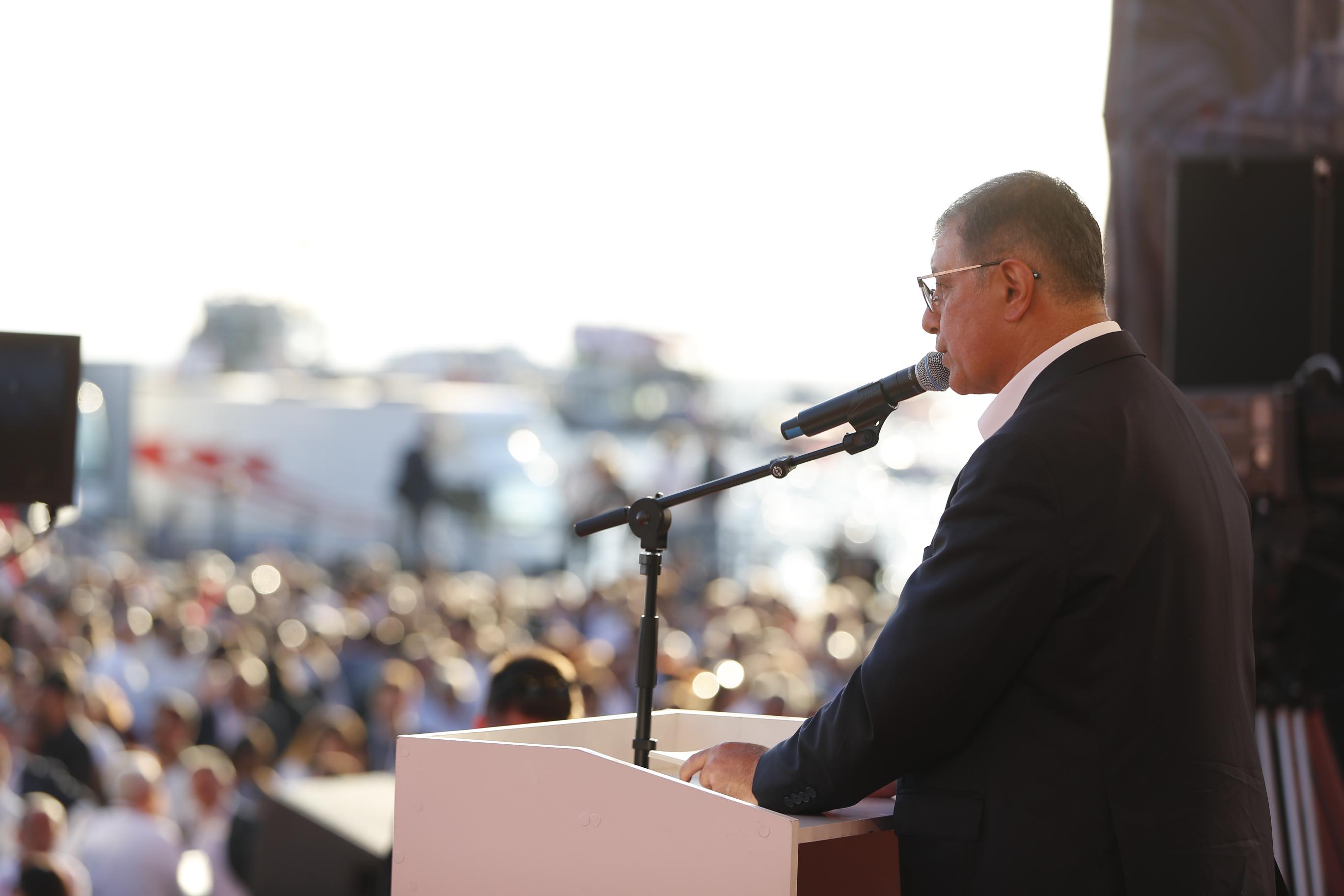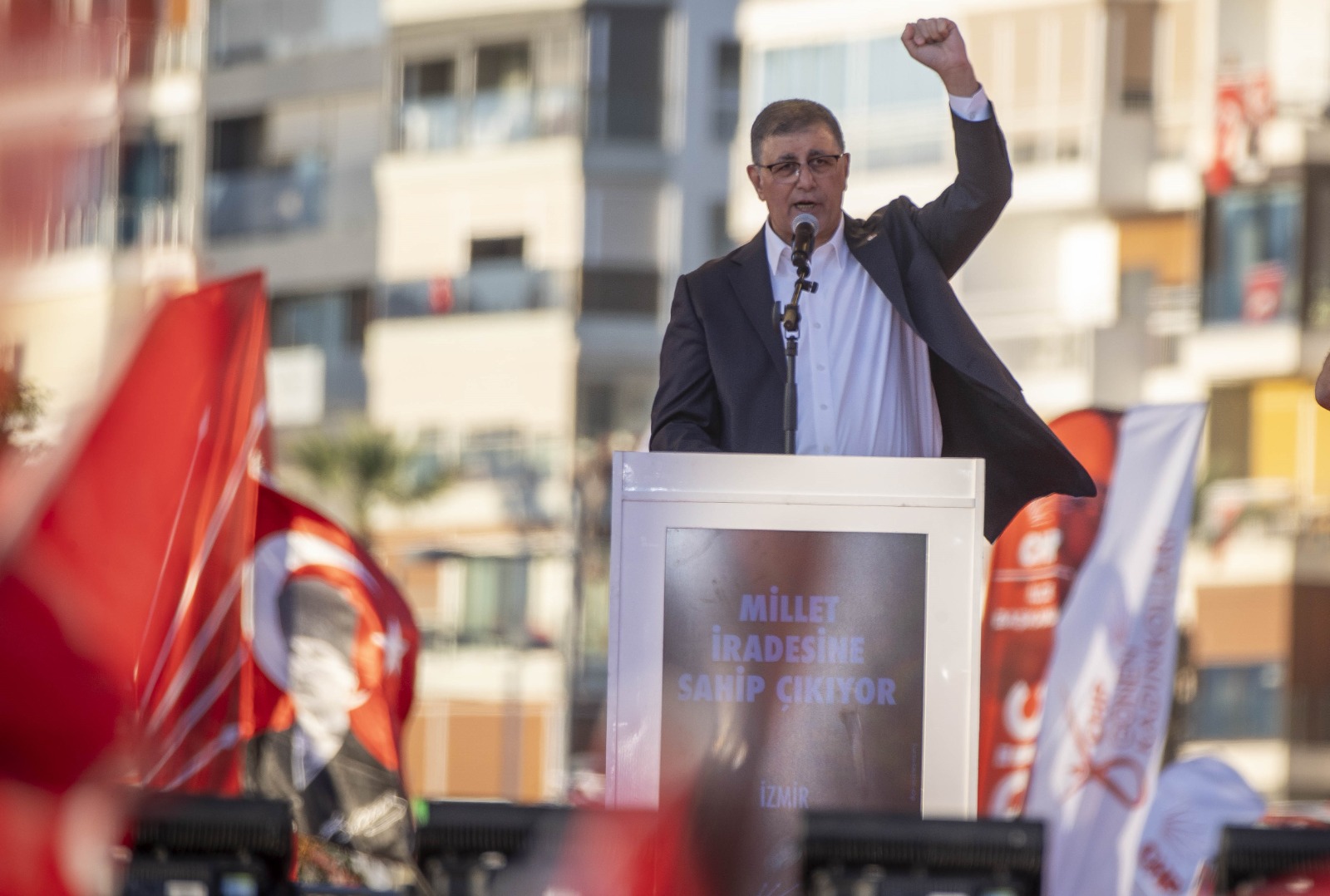 Sevginizi bu millete vermeye hazır mısınız?’ Ekrem Başkan’ımıza ve onunla beraber cezaevinde tutulan tüm yoldaşlarımıza buradan selam söylüyoruz. Onlara hep beraber selam söylüyor muyuz? Önümüzdeki günlerde yapacağımız bu mücadeleyi daha da büyütmeye hazır mıyız İzmir, hazır mıyız Türkiye? Yolumuz açık olsun kardeşlerim.”