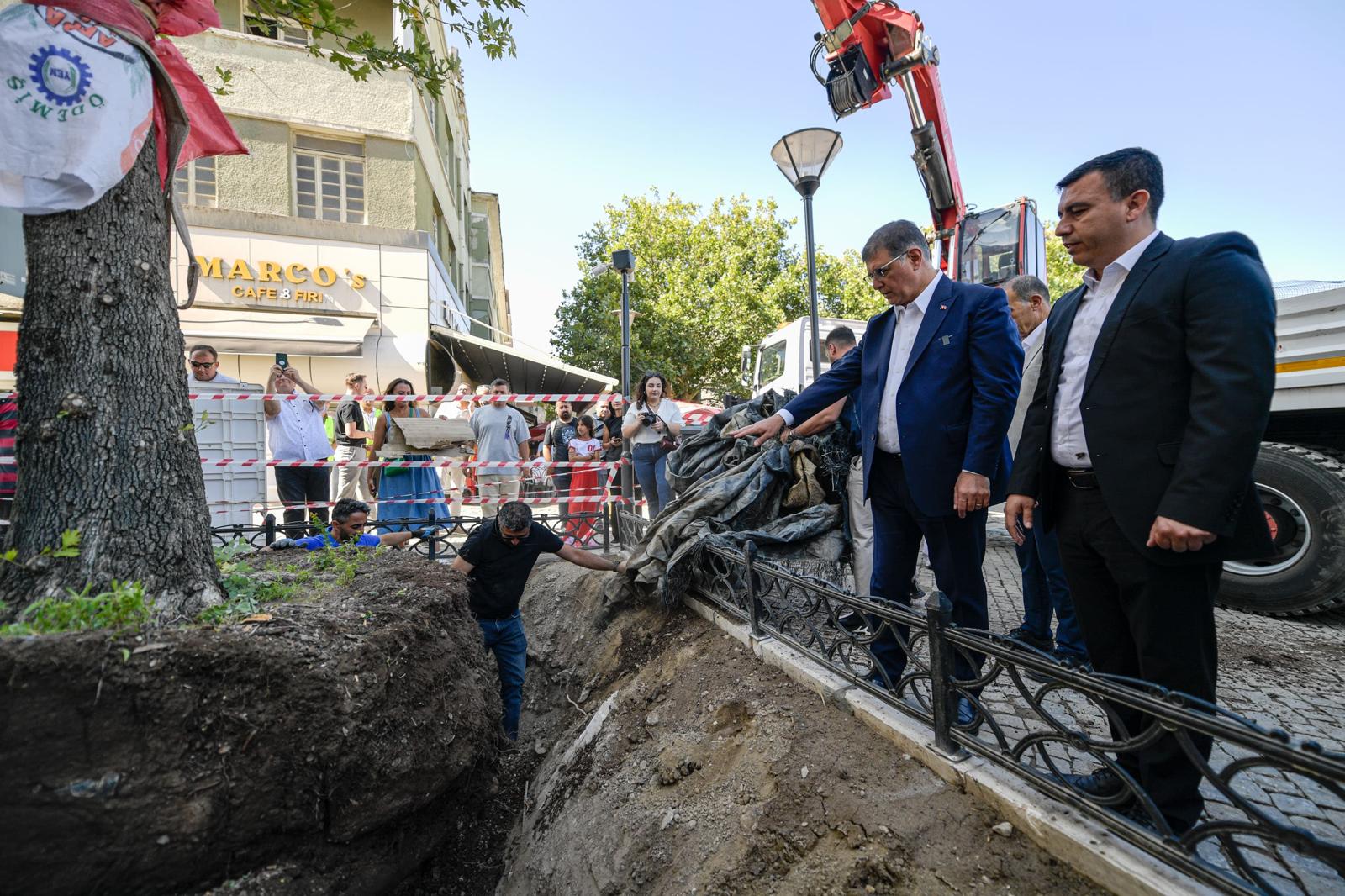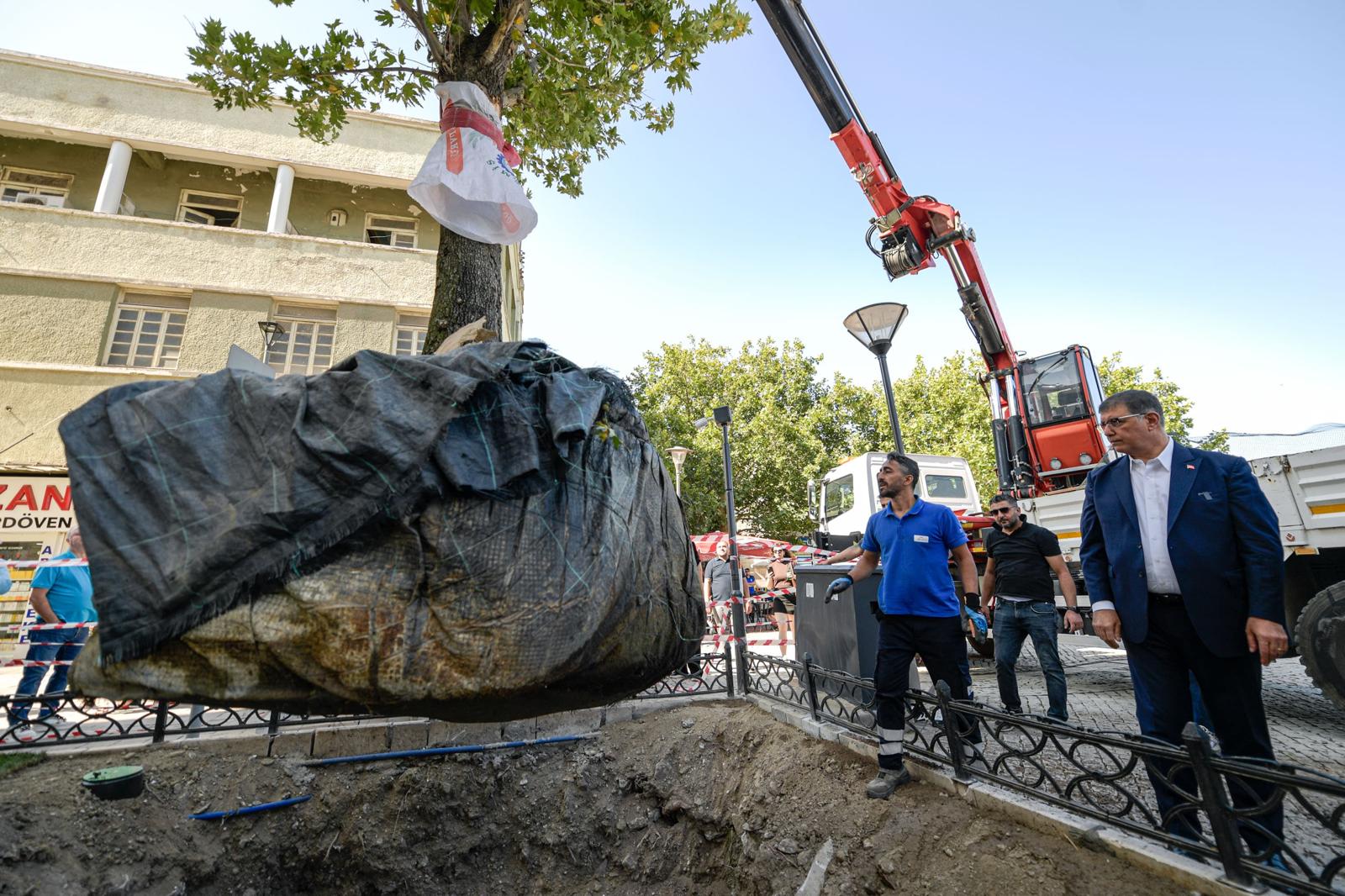 Kırılan ağacın yerini alan doğu çınarı, vinç yardımıyla alana getirildi. 35 yaşlarında, kökleriyle birlikte 7 metre boyunda ve 120 santimetre gövde kalınlığındaki ağaç İzmir’in yeni sembolleri arasında yer alacak.