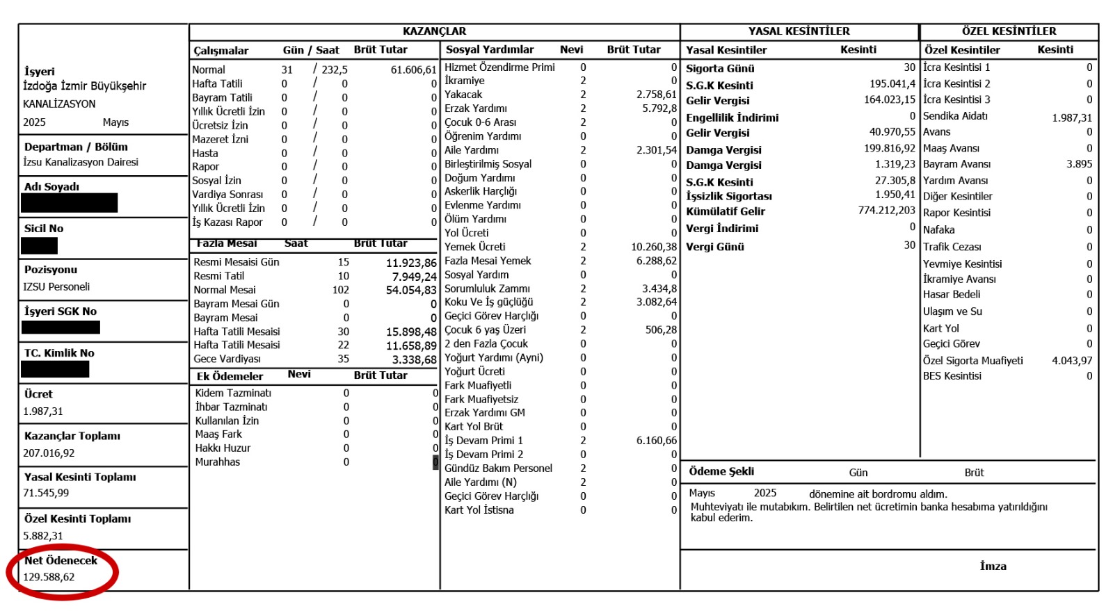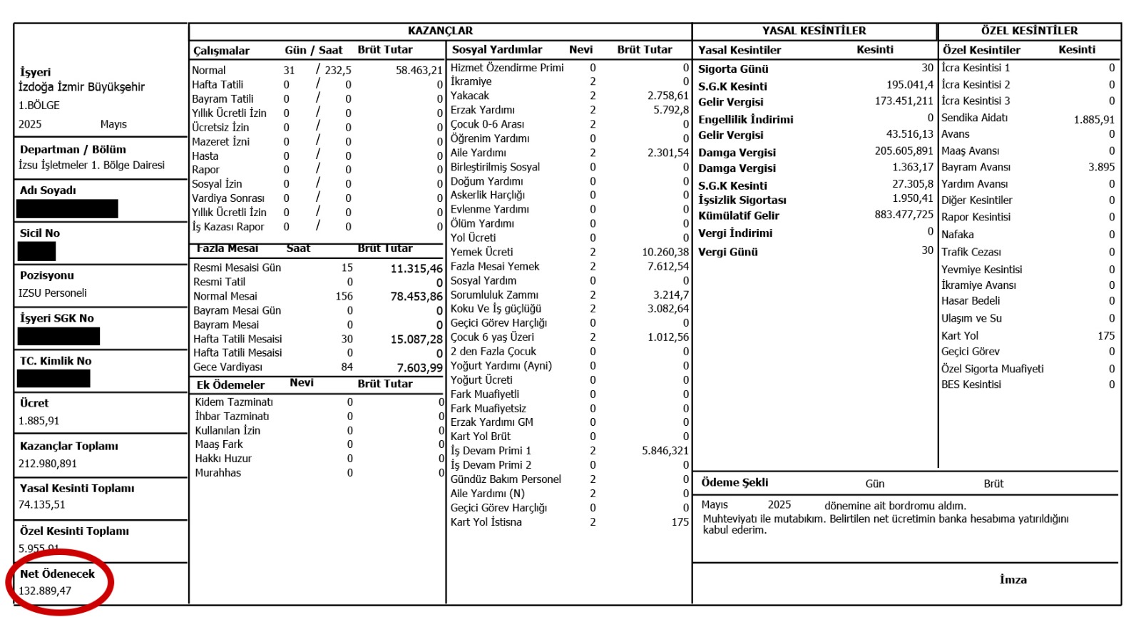İzmir Büyükşehir Belediye Başkanı Dr. Cemil Tugay, Türk-İş Genel Başkanı Ergün Atalay’ın İzmir Büyükşehir Belediyesi ve Belediye –İş Sendikası arasında geçen dönem imzalanan toplu sözleşme ve sonrasında yaşanan sürece ilişkin açıklamalarına bordro ile yanıt verdi. Bir büyükşehir belediye başkanı, sorumlu bir kamu yöneticisi olarak sabırlı ve itidalli olmaya, zorunlu işten çıkarma sürecini akıl ve mantık sınırları içinde mağduriyet yaratmadan çözüme kavuşturmak için diyalog içinde kalmaya çalıştıkça sürekli olarak Belediye-İş yetkilileri tarafından doğru olmayan beyanlarla itham edildiğini aktaran Başkan Tugay, “Son olarak Türk-İş Genel Başkanı Ergün Atalay da maalesef bu kervana katılarak ‘bizim arkadaşlarımızın sendikasını itibarsızlaştırdılar’ ve ‘işçiler 50-55 bin lira para alıyor’ şeklinde beyanlarda bulundu. Sayın Ergün Atalay, tevatür ile somut gerçeğin farkını ekte sunduğum iki bordroyla fark edeceksiniz diye düşünüyorum. Bordrolarda, net ve brüt ücretleri görebilirsiniz. Bu da sizin için yeterli olmazsa, bordrolardaki "kümülatif gelir" kısmına bakıp ilgili aya bölerseniz (örneğin, mayıs bordrosunda 883 bin liralık kümülatif gelir, aylık 180 bin liraya tekabül eder ki) bunun aylık ortalama neti 130 bin liranın üzerinde olur. İtirazımız bu derece yüksek ücretin üzerine Eylül 2025'te gelecek zamdır, eylül zammından feragat istiyoruz” ifadelerini kullandı.