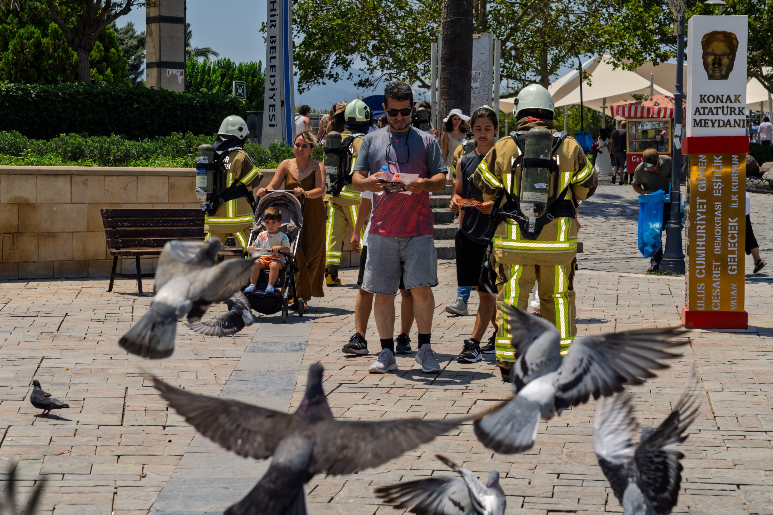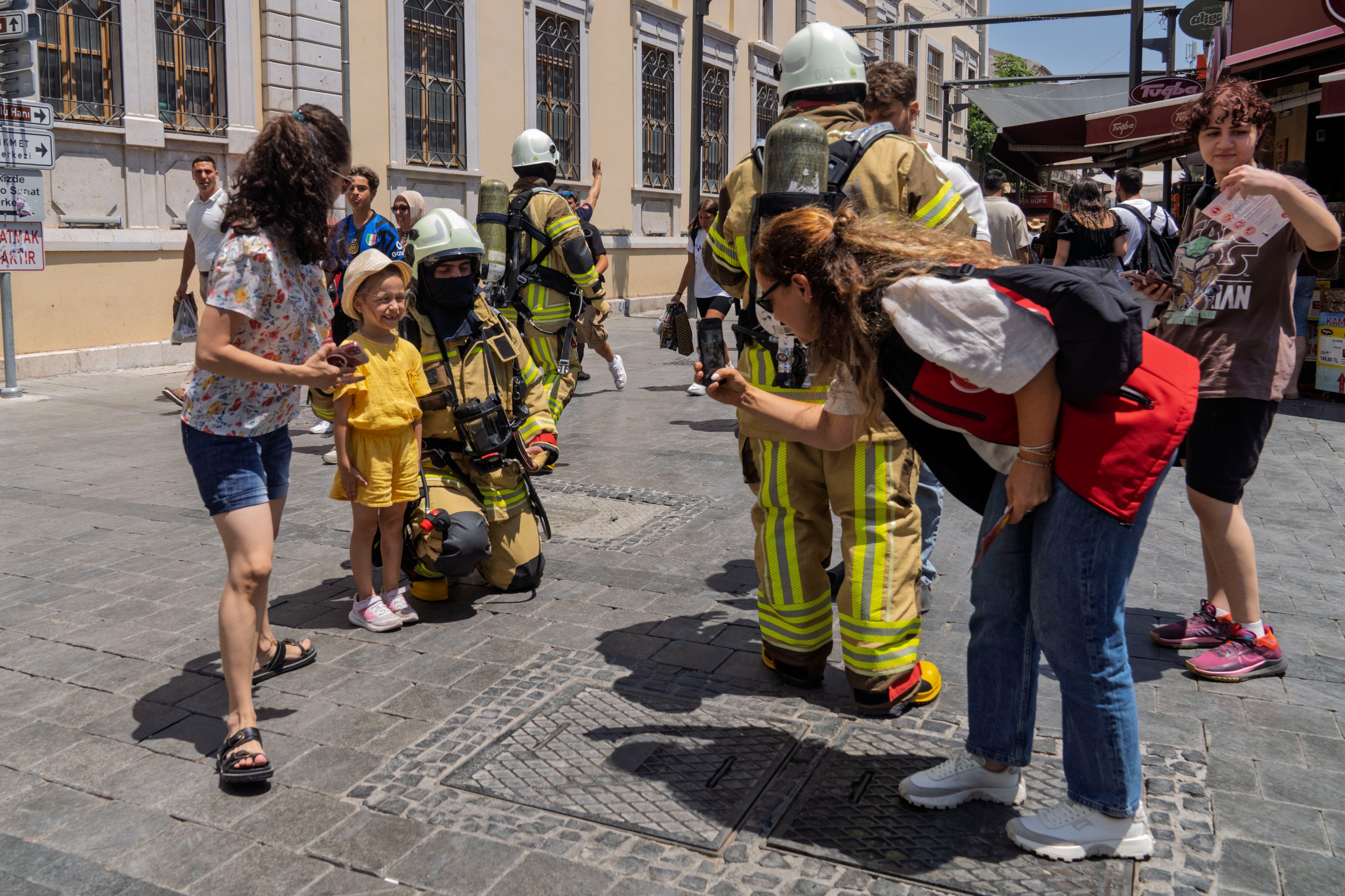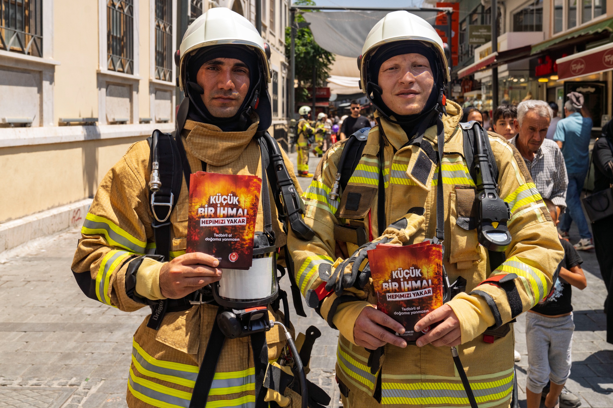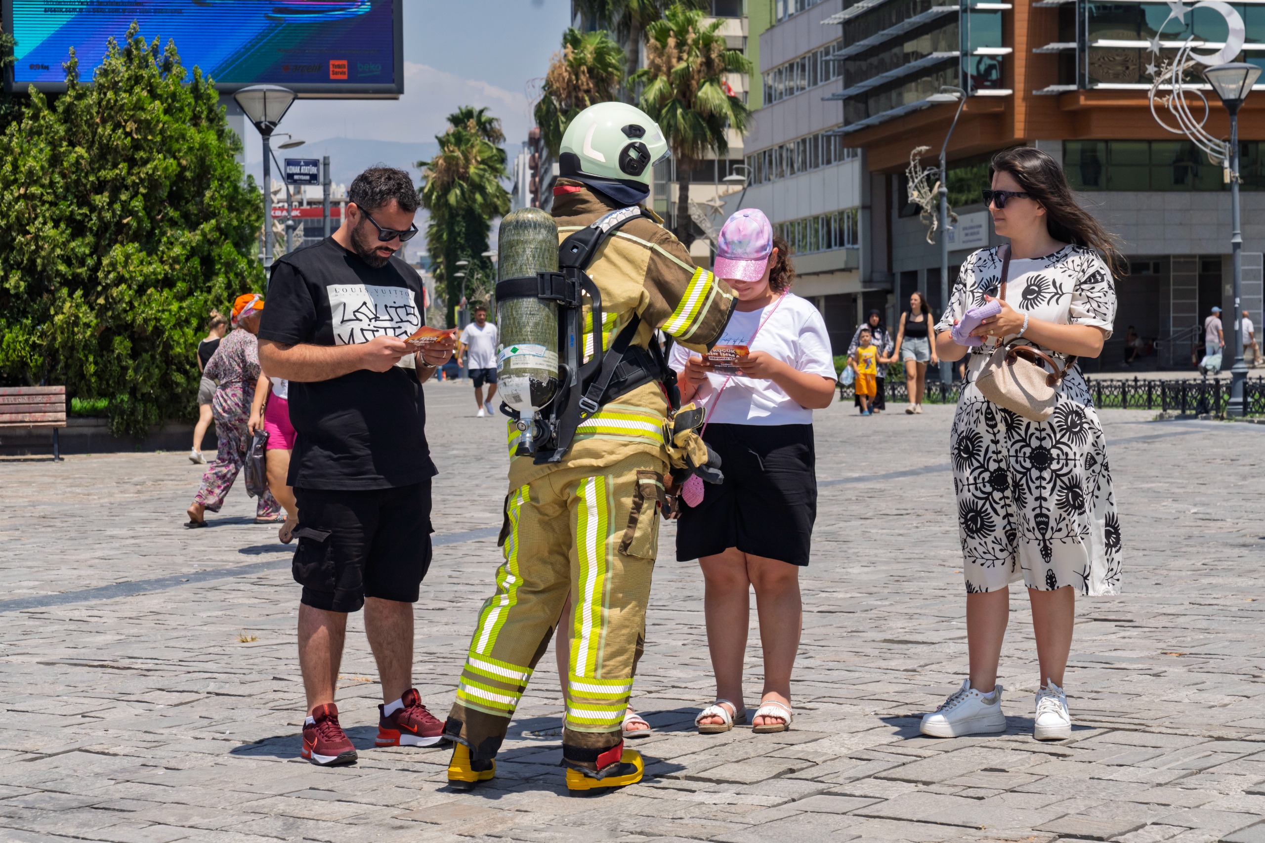 İzmir Büyükşehir Belediyesi İtfaiye Dairesi Başkanlığı, çoğu küçük ihmaller sonucu başlayan ve geride yıkıcı bir etki bırakan orman yangınlarına karşı ilginç bir farkındalık etkinliği düzenledi. Yangınlara müdahale ederken kullandıkları ısıya ve aleve karşı koruyan özel kıyafet giyen, baret ve temiz hava solunum cihazı takan itfaiye personeli, Konak Atatürk Meydanı ile Kemeraltı Çarşısı’nda broşür dağıtarak yurttaşları bu konuda dikkatli olmaya çağırdı. 40 dereceye yaklaşan sıcak havada koruyucu kıyafetle dolaşan itfaiye personelini gören vatandaşlar şaşkınlığını gizleyemedi.