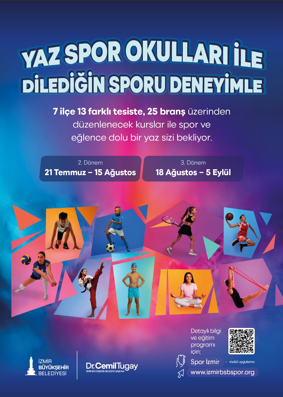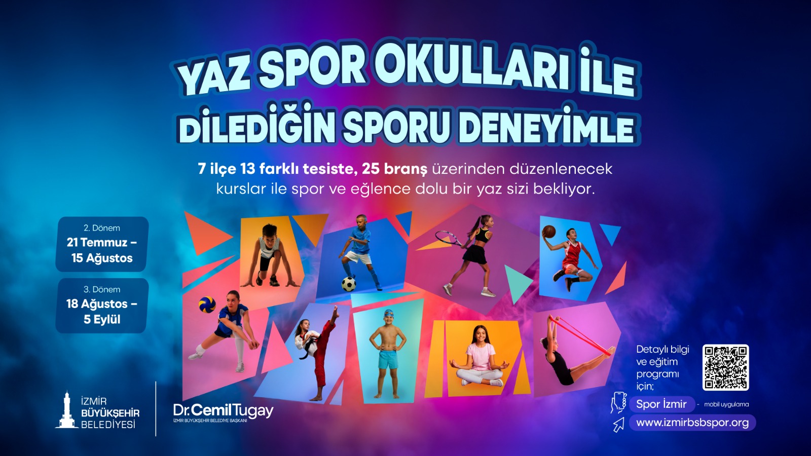 İzmir Büyükşehir Belediyesi Gençlik ve Spor Hizmetleri Dairesi Başkanlığı ile İzmir Büyükşehir Belediyesi Spor Kulübü iş birliğinde düzenlenen Yaz Spor Okulları; atletizm, badminton, basketbol, jimnastik, dans, futbol, futsal, güreş, halk oyunları, judo, kano, karate, kondisyon, masa tenisi, pilates, sağlıklı yaşam, satranç, step-aerobik, sutopu, tekvando, temel hareket eğitimi, tenis, voleybol, yoga, yüzme olmak üzere 25 branşta kurs düzenliyor. Ayrıca özel gereksinimli bireyler için de basketbol eğitimleri veriliyor. 7 ilçe 13 farklı tesiste devam eden kurslarda çocuk, genç ve yetişkinlerin fiziksel ve sosyal gelişimlerinin desteklenmesi hedefleniyor. 100’ü aşkın uzman antrenör ve spor eğitmeni eşliğinde gerçekleştirilen spor kurslarında yeteneğiyle öne çıkan çocuklar, İzmir Büyükşehir Belediyesi Spor Kulübü altyapı takımlarına davet ediliyor.