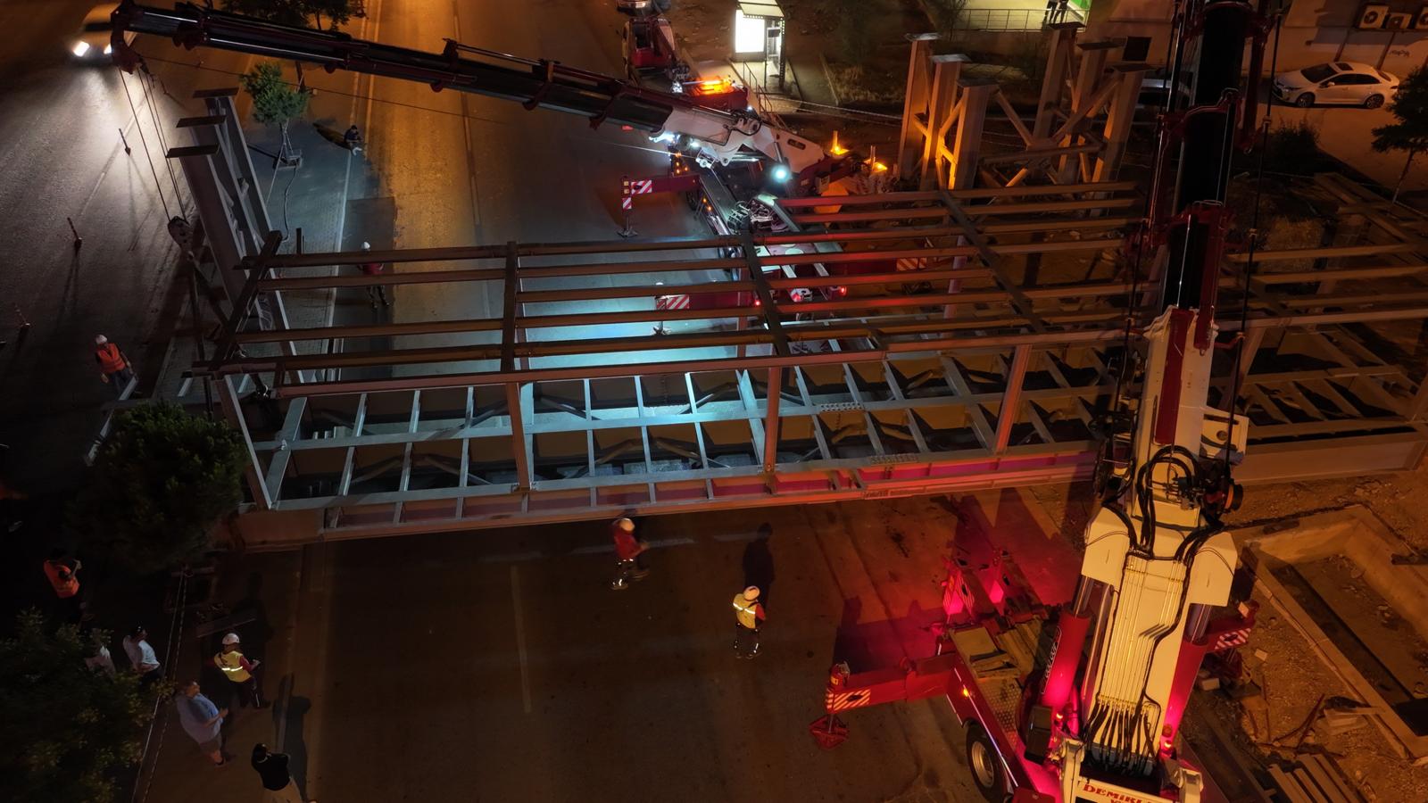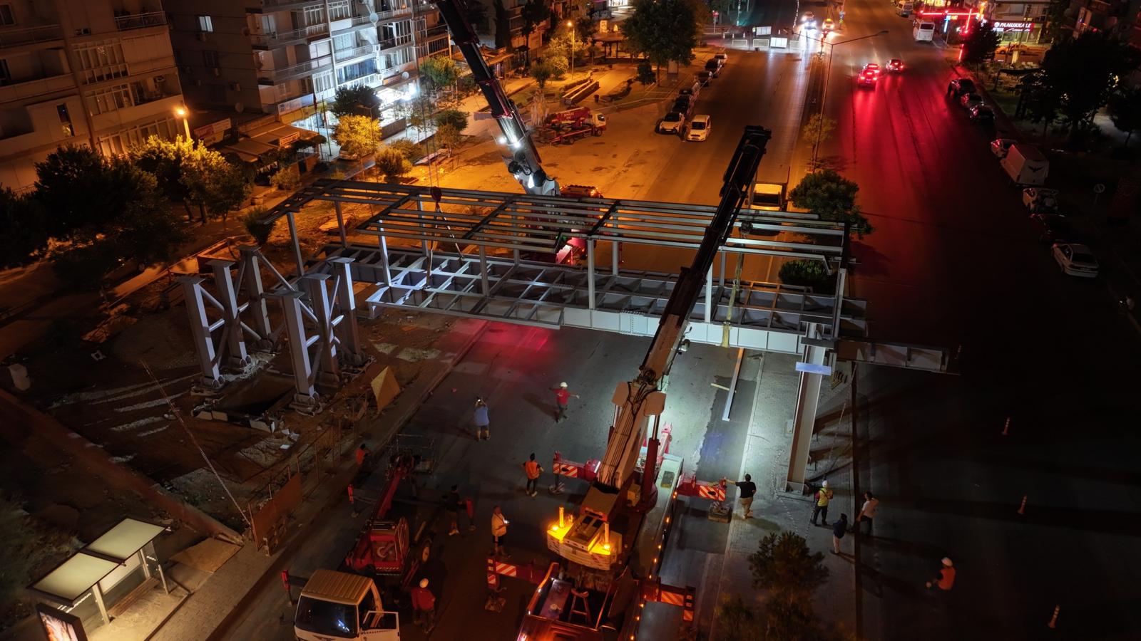 İzmir Büyükşehir Belediye Başkanı Dr. Cemil Tugay’ın kentin ulaşım konforunu artırmak için başlattığı projeler arasında yer alan Karşıyaka Yeni Girne Yaya Üst Geçidi’nin yapım çalışmalarında sona yaklaşılıyor. İzmir Büyükşehir Belediyesi Fen İşleri Dairesi Başkanlığı tarafından yapımı devam eden üst geçidin, temel ve ayak montajının ardından Soğukkuyu Mahallesi ile Örnekköy Mahallesi’ni bir araya getirecek yürüyüş platformunun montajına başlandı. Gece devam eden çalışmalarda Girne Bulvarı kontrollü bir şekilde trafiğe kapatıldı. Güvenlik önlemlerinin alınmasının ardından ekipler, vinç eşliğinde platformların montajına başladı. Yenilikçi ve modern bir yapıyla inşa edilen üst geçidin, ağustos ayı sonunda hizmete açılması planlanıyor. 50 metre uzunluğunda, 6 metre genişliğinde ve 5 metre yüksekliğinde olacak üst geçitte, 4 yürüyen merdiven ve 2 asansör bulunacak.