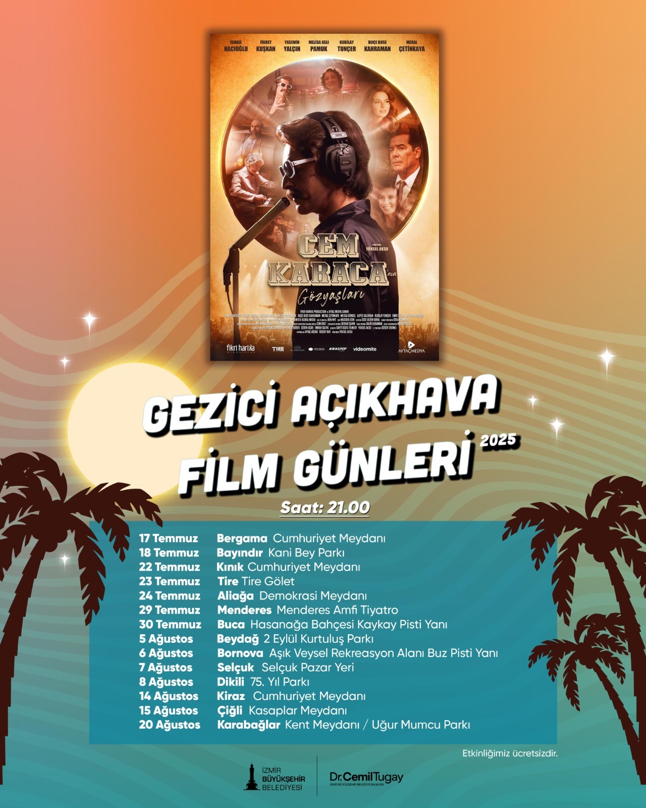 Sinemaseverler, Gezici Açıkhava Film Günleri ile ağustos ayında da beraber olmaya devam edecek. “Cem Karaca’nın Gözyaşları” filmi, halka açık ve ücretsiz olarak gösterilecek. 5 Ağustos’ta Beydağ 2 Eylül Kurtuluş Parkı, 6 Ağustos’ta Bornova Aşık Veysel Rekreasyon Alanı Buz Pisti yanı, 7 Ağustos’ta Selçuk Pazaryeri, 8 Ağustos’ta Dikili 75. Yıl Parkı, 14 Ağustos’ta Kiraz Cumhuriyet Meydanı, 15 Ağustos’ta Çiğli Kasaplar Meydanı, 20 Ağustos’ta da Karabağlar Uğur Mumcu Parkı'nda gerçekleşecek gösterimler, saat 21.00'de başlayacak.