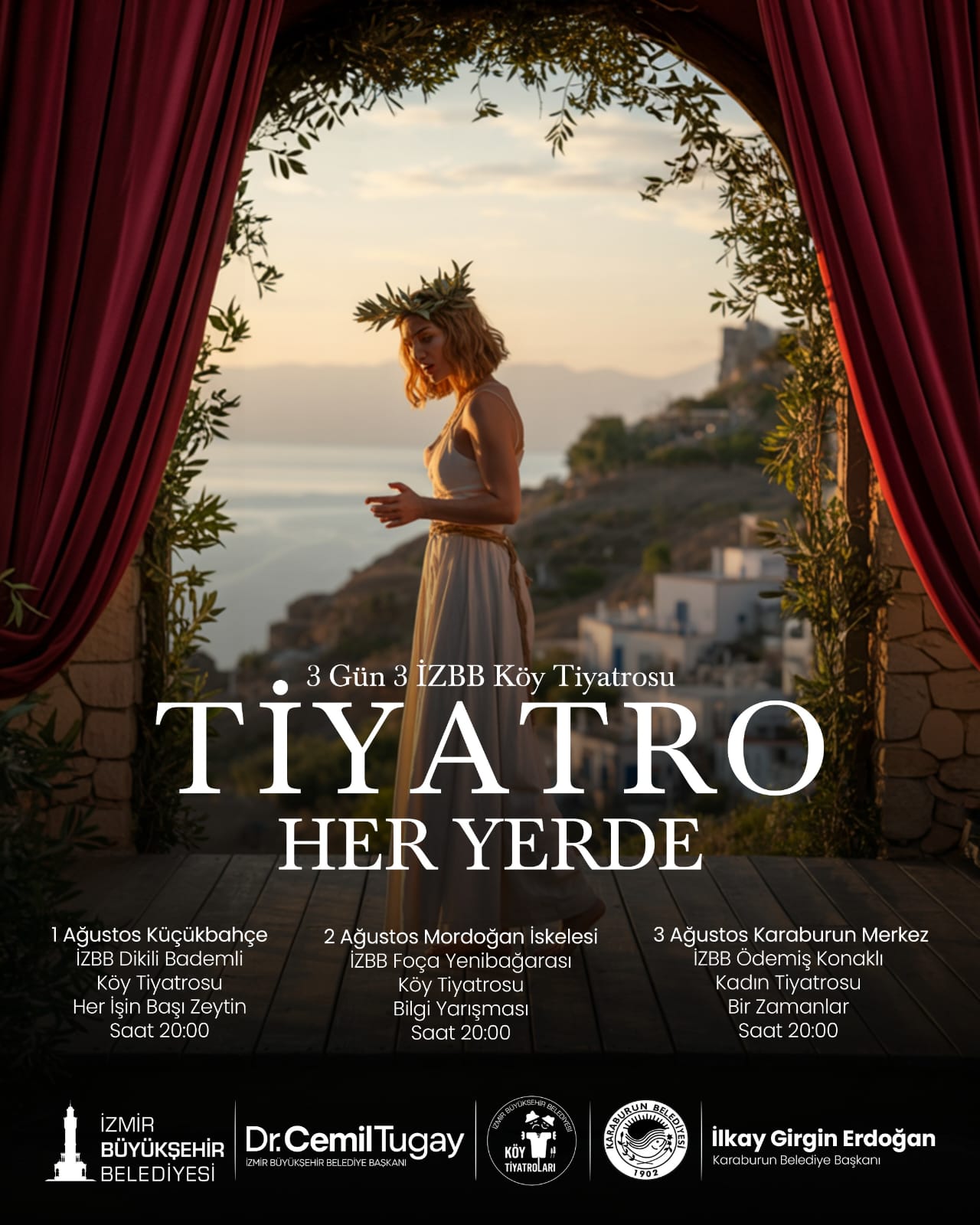 Alaybey Mahallesi Yaz Konserleri kapsamında, 6 Ağustos tarihinde Şef Hüseyin Tolu yönetiminde Türk Sanat Müziği Korosu konseri saat 20.00’de Muammer Aksoy Parkı Tersane Kafe yanında gerçekleşecek. 1-10 Ağustos tarihleri arasında düzenlenecek TeosFest kapsamında ise 5 Ağustos günü İzmir Büyükşehir Belediyesi Ürkmez Kadın Tiyatrosu’nun “Zeytine Sadakat” oyunu sahnelenecek. Ayrıca İzmir'in önemli sanat köşelerinden biri olan Urla Dam sahnesi, 10 Ağustos'ta iki güzel oyunu sahnesine taşıyacak. Bu yıl ödül alan İzmir Büyükşehir Belediyesi Ürkmez Kadın Tiyatrosu’nun “Pişti” oyunu ve İzmir Büyükşehir Belediyesi Bergama Kozak Yukarıbey Köy Tiyatrosu’nun “Doğanın Gözyaşı” oyunu, 10 Ağustos'ta Urla Dam’da seyirci ile buluşacak. İzmir Büyükşehir Belediyesi Köy Tiyatroları, “Tiyatro Her Yerde” sloganıyla 1, 2, 3 Ağustos tarihlerinde Karaburun köy ve plajlarında sanatseverlere keyifli anlar yaşatacak.