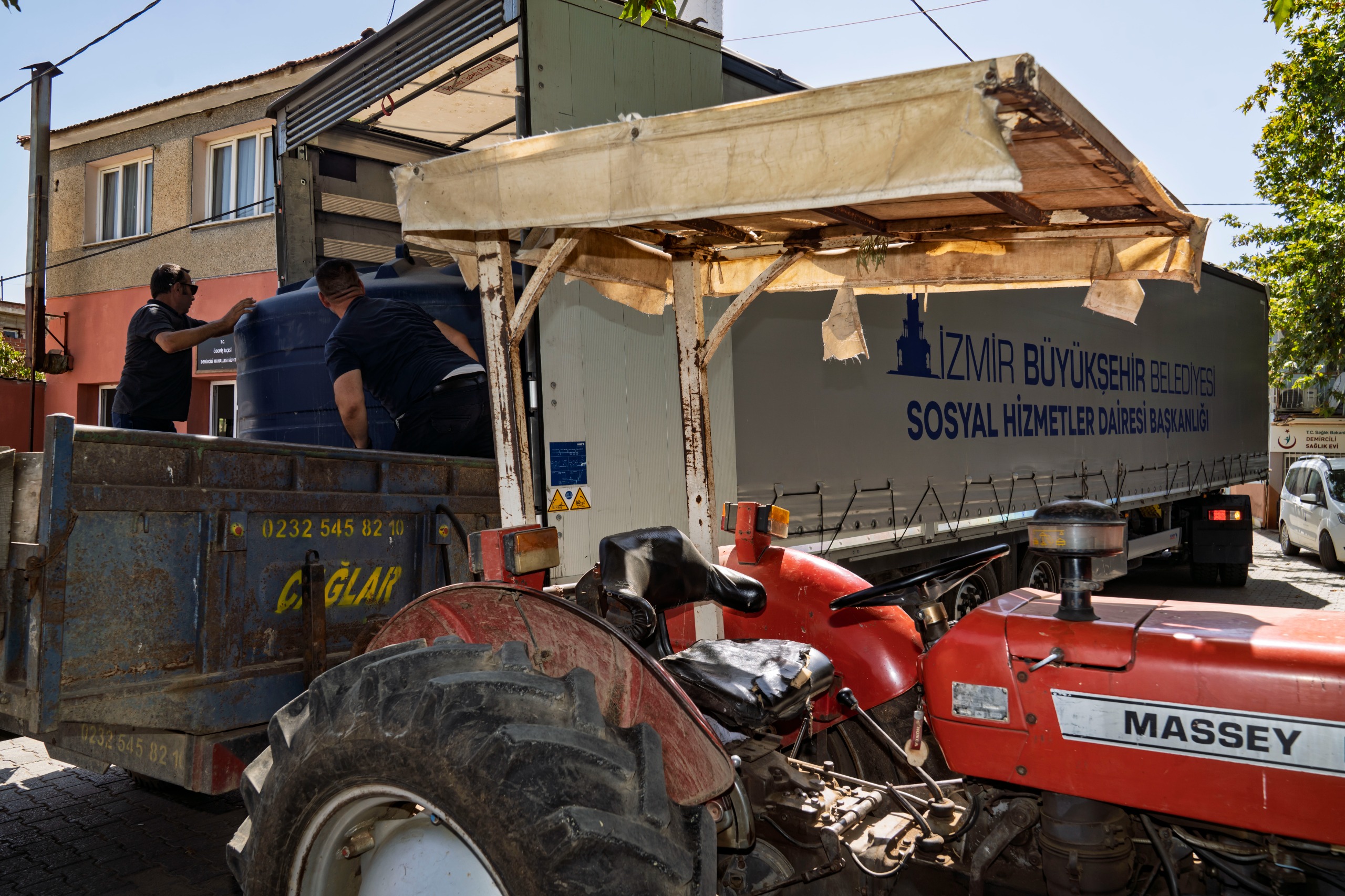İzmir Büyükşehir Belediyesi, orman yangınlarında en çok yara alan Ödemiş’in köylerinde su deposu dağıtımına başladı. Tarımsal ve hayvansal üretimin devamlılığını sağlamak için büyük öneme sahip su depoları yangından zarar gören tüm üreticilere ulaştırılmaya devam edecek.