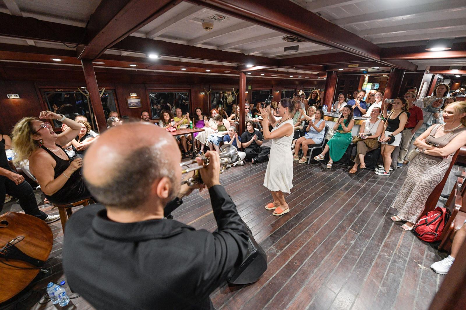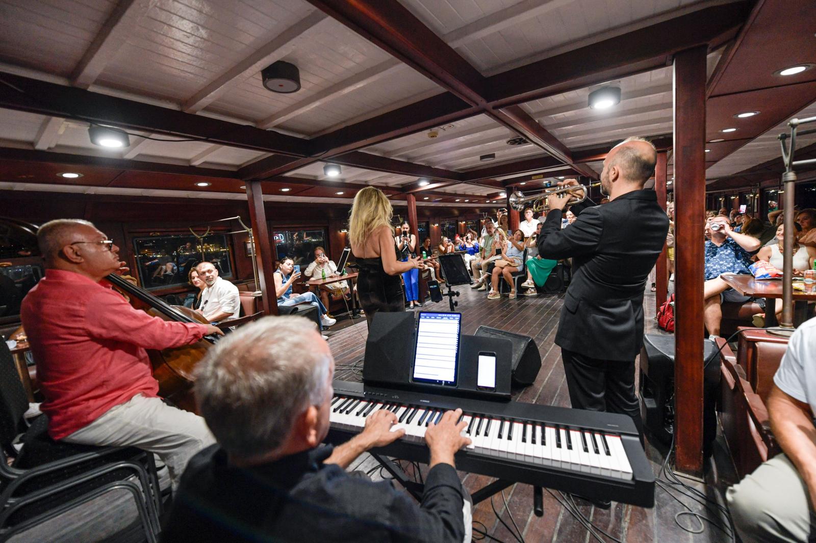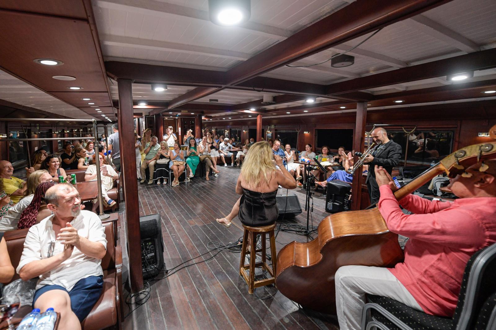 Tarihi Bergama Vapuru, bu kez çok renkli ve coşkulu bir konsere ev sahipliği yaptı. Yerli ve yabancı çok sayıda sanatseverin katıldığı Caz Gecesi etkinliğinde Nükhet Yalçın Jazz Quartet’in melodileri yankılandı. Konser sırasında İzmir Körfezi turu yapan tarihi vapur, dinleyicilere unutulmaz bir akşam yaşattı. Bazı sanatseverler, cazın ritmine kapılarak sahnede dans etti. Nükhet Yalçın, müzikseverlere caz ve Latin müziğin klasiklerinden Türk Hafif Müziği’nin unutulmaz eserlerine, rock ve blues çeşitlemelerinin farklı yorumlarına kadar geniş yelpazede şarkılar seslendirdi. Nükhet Yalçın Jazz Quartet’e piyanoda Mehmet Ariç, basta Uğur Yalçın ve virtüöz trompet sanatçısı Uğur Sayınbatur eşlik etti.