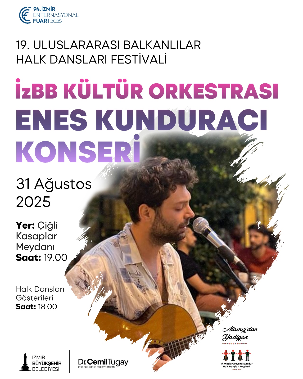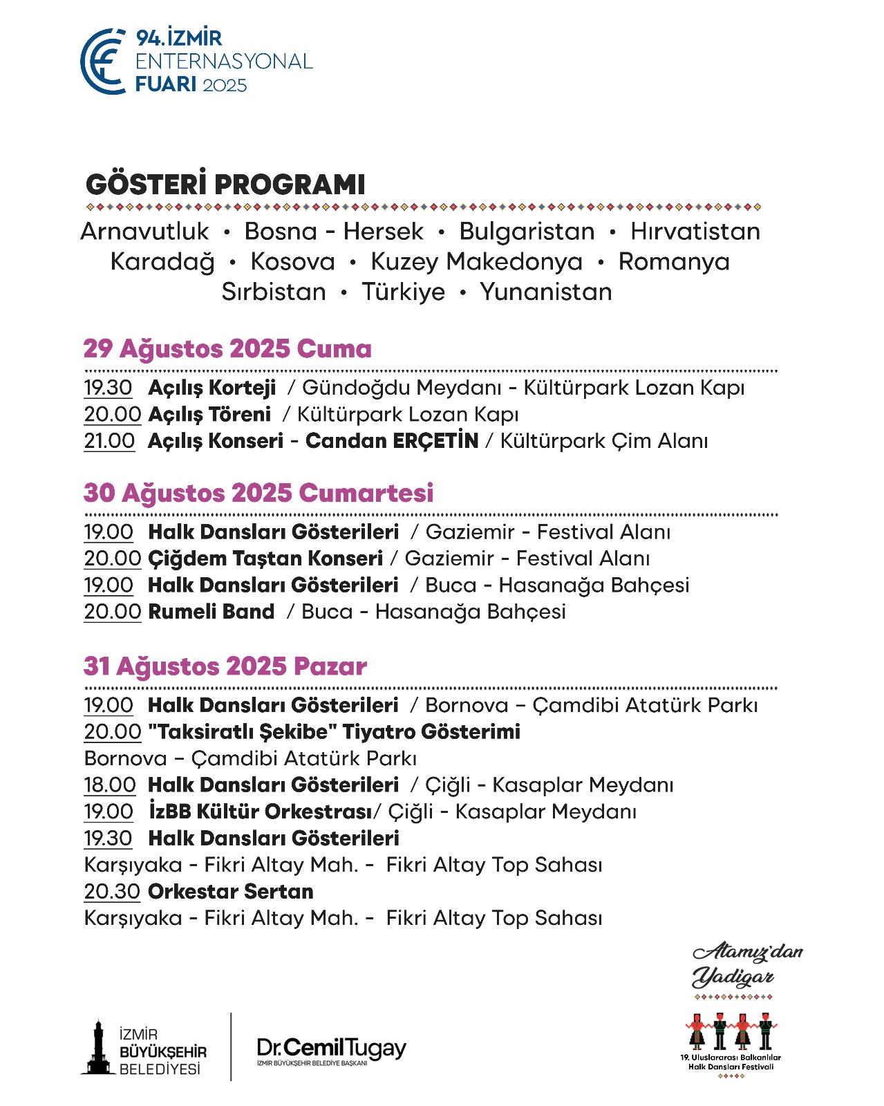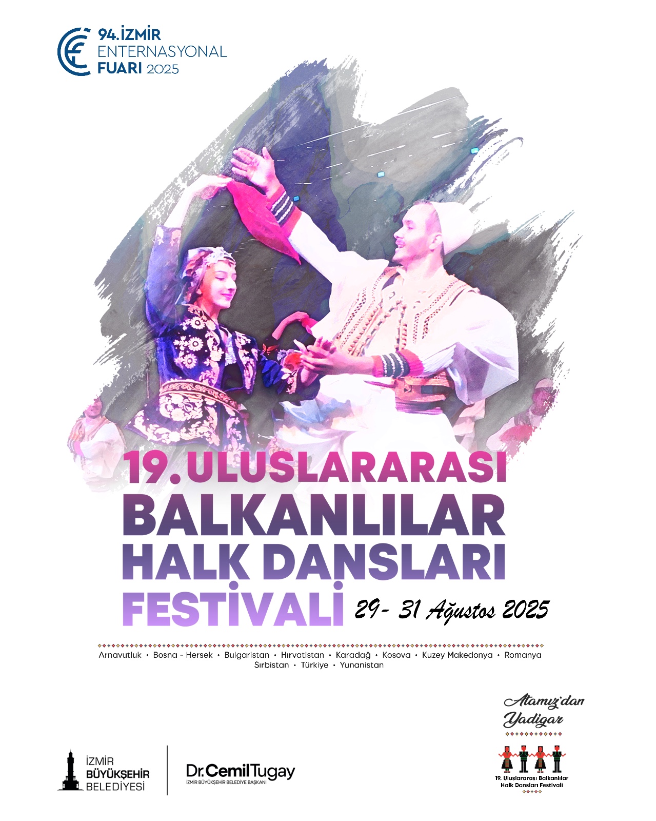 İzmir Büyükşehir Belediyesi ev sahipliğinde İZFAŞ tarafından “Fuar Şehrin Kalbinde” sloganıyla 94’üncü kez kapılarını açmaya hazırlanan İzmir Enternasyonal Fuarı (İEF) ile eş zamanlı olarak 29 Ağustos'ta başlayacak Uluslararası Balkanlılar Halk Dansları Festivali, İzmir’i Balkan ezgileriyle donatacak. Onur konuğu ülkenin Bosna Hersek olduğu İEF’de 31 Ağustos’a kadar sürecek festival, Bosna Hersek’ten Yunanistan’a; Romanya’dan Karadağ’a uzanan geniş bir coğrafyanın halk dansı ekipleri, müzisyenleri ve sanatçılarını bir araya getirecek. Festival; Balkan kültürünün coşkusunu, danslarını ve müziğini İzmir’in dört bir yanına taşıyacak. Şölen havasında geçecek festival, her yıl olduğu gibi bu yıl da on binlerce İzmirliyi bir araya getirecek.