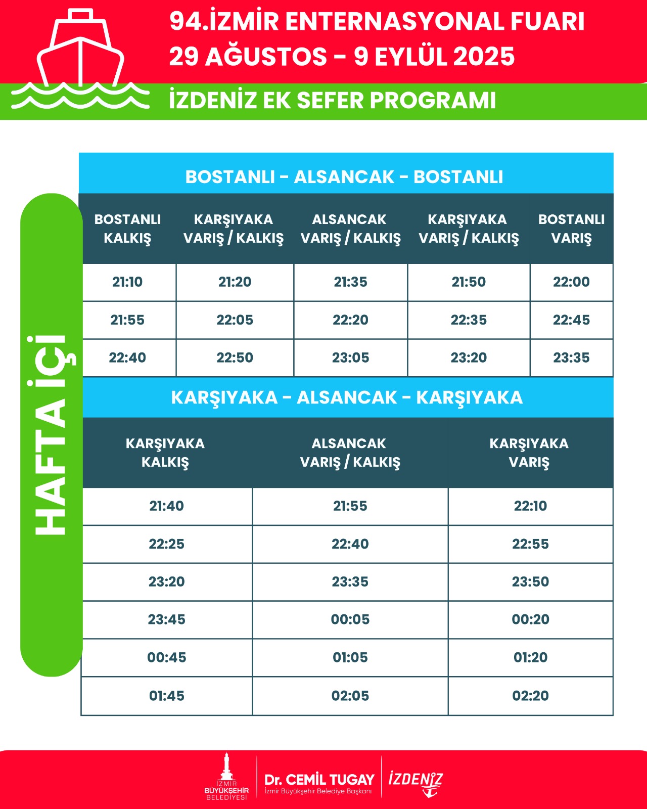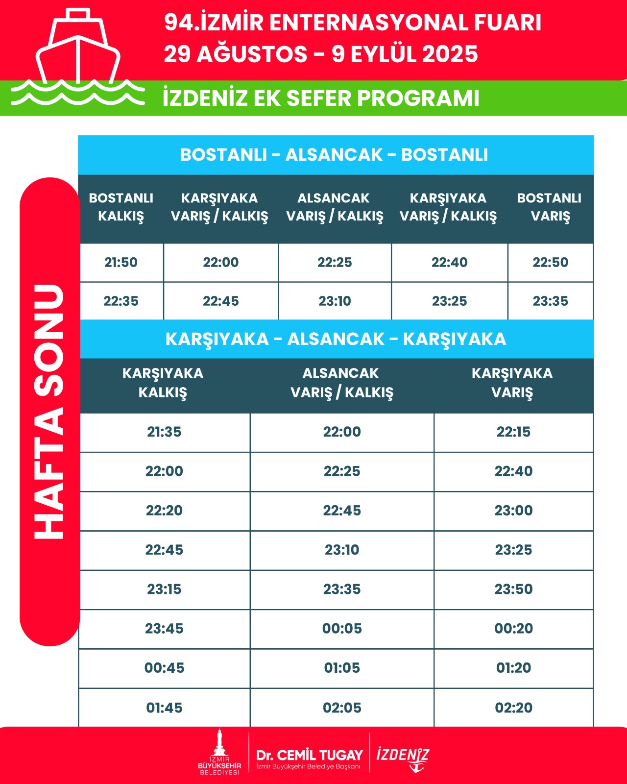 İZBAN, İzmir Enternasyonal Fuarı için her gün iki ek sefer düzenleyecek. Trenler, 9 Eylül tarihine kadar Aliağa'dan saat 00.26'da, Tepeköy'den ise 00.31'de kalkacak. Her iki yönden gelen trenler, saat 01.35'te Alsancak'tan başlangıç istasyonlarına geri dönecek.
