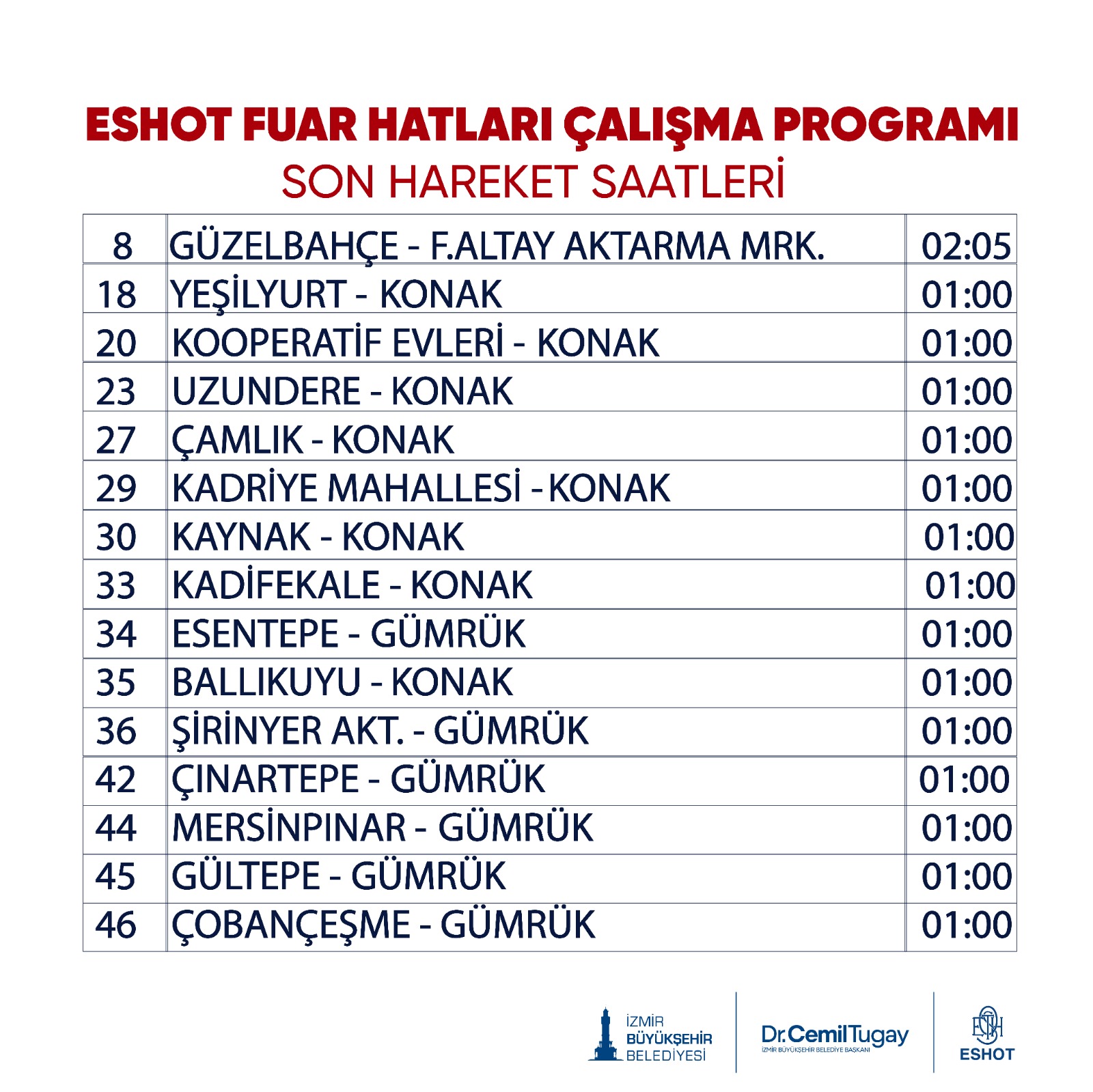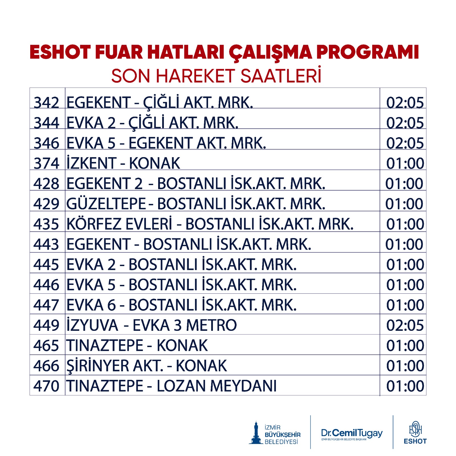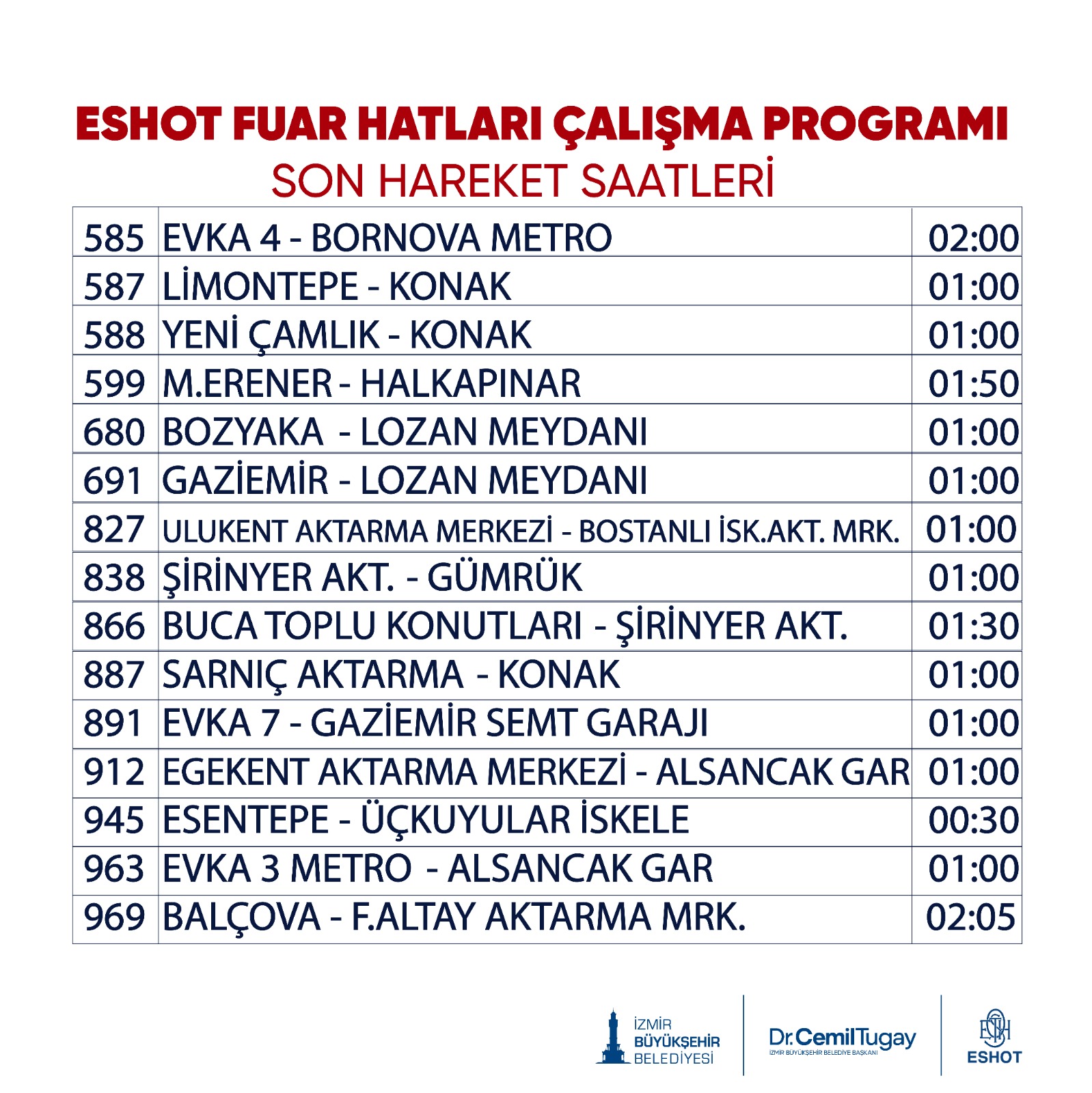 Fuar süresince İzmir Metro’da 00.20 olan son sefer saati 01.20 olarak güncellendi. Sefer sıklığı ise 00.20 ile 01.20 arasında 20 dakikada bir olacak. Konak Tramvayı’nda da son sefer 01.20 olarak belirlendi. 00.00 ile 01.00 arasında 7,5 dakika, 01.00 ile 01.20 arasında ise 10 dakikada bir sefer olacak.