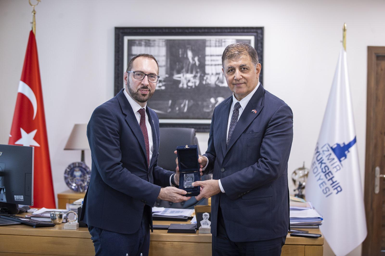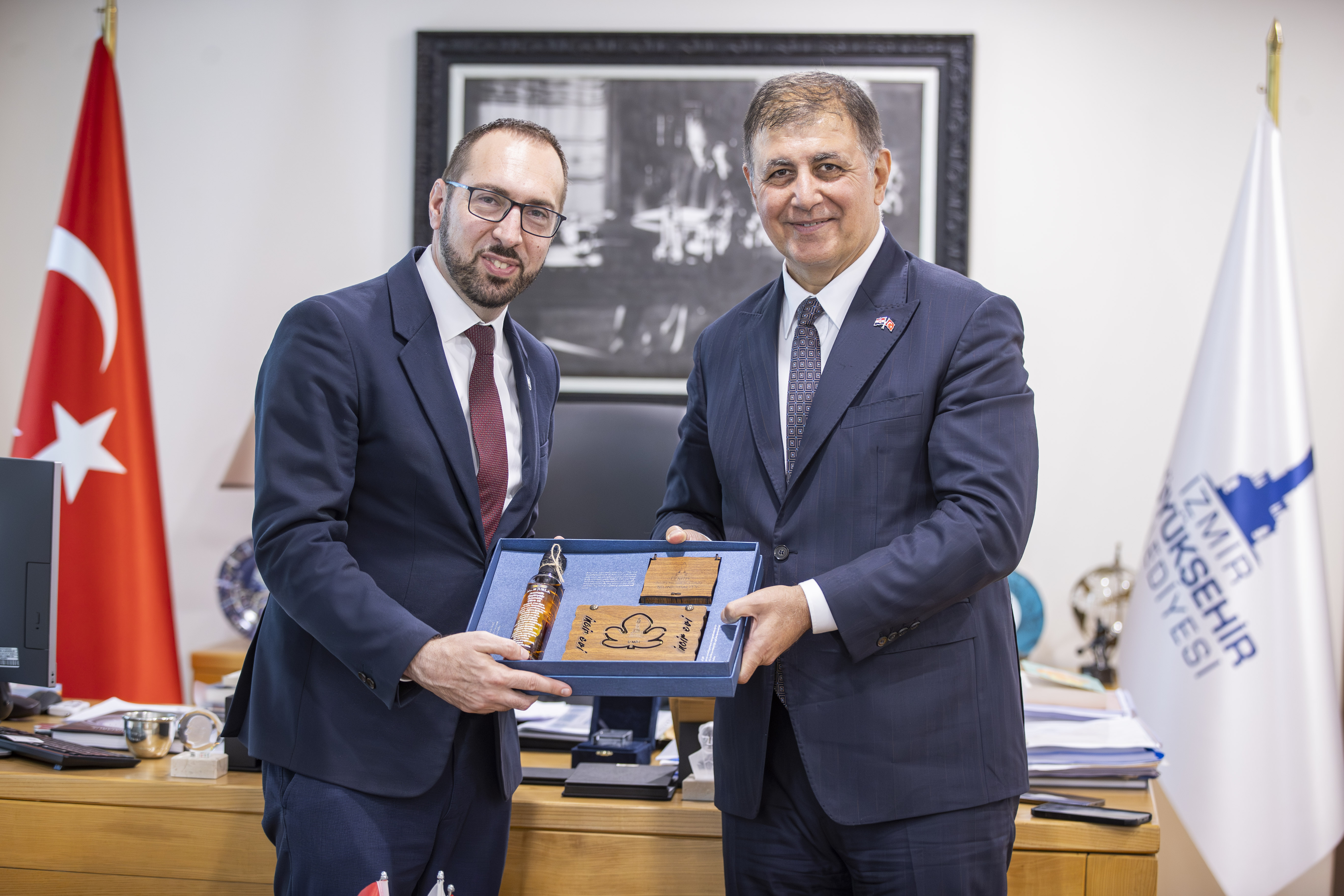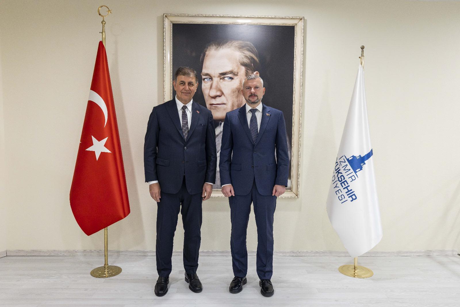 İzmir Büyükşehir Belediye Başkanı Dr. Cemil Tugay, 94. İzmir Enternasyonal Fuarı için kente gelen Belarus’un Ankara Büyükelçisi Anatoli Glaz ile Hırvatistan’ın Zagreb şehrinin Belediye Başkanı Tomislav Tomašević’i makamında ağırladı.