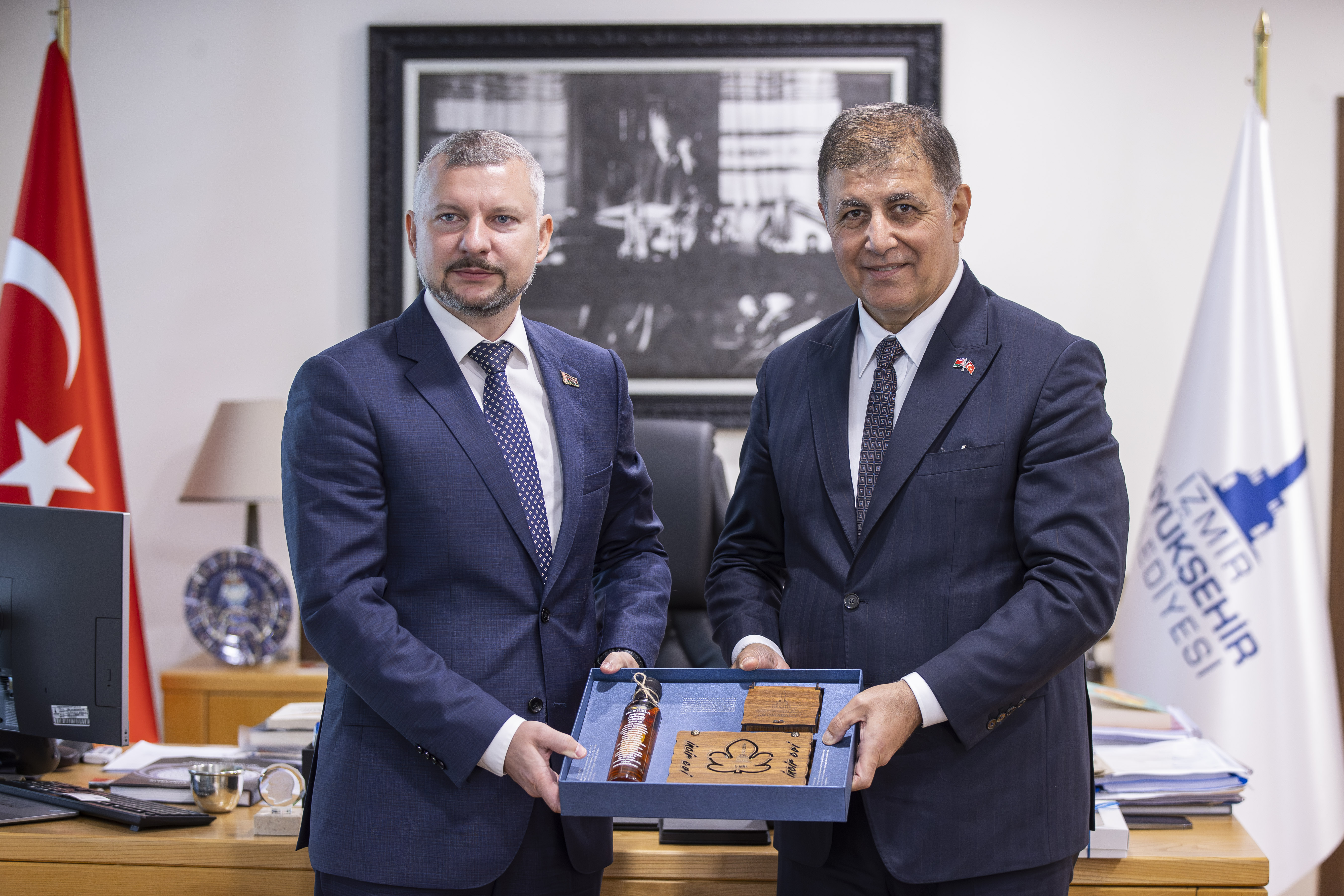 Belarus Büyükelçisi Anatoly Glaz, İstanbul Başkonsolosu Yauheniya Bartkevich, İzmir Fahri Konsolosu Murat Yorgancıoğlu ve beraberindeki heyetle bir araya gelen Başkan Tugay, İzmir’in tarihi bir kent olmasının yanı sıra tarım, ticaret, turizm odaklı bir kent olduğunu belirterek, bu alanlarda kenti daha da geliştirmek için çalıştıklarını kaydetti. Belarus’ta ve İzmir’de, karşılıklı olarak kentlerin tanıtımının yapılabileceği önerisini Büyükelçi Glaz’a ileten Başkan Tugay, Belarus’ta her yıl düzenlenen Tarım Fuarı’na katılabileceklerini aktardı. Büyükelçi Glaz önümüzdeki yıl gerçekleşecek fuarda İzmir’i kesinlikle görmek istediklerini söyledi.
