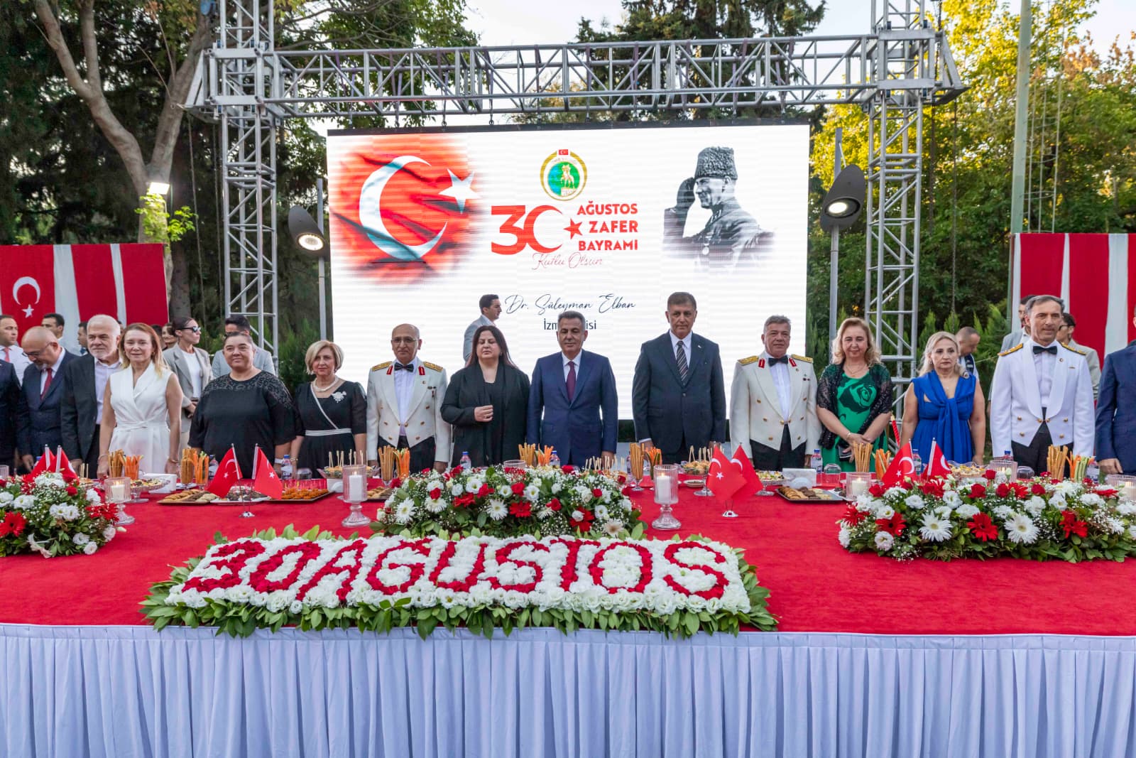 İzmir Büyükşehir Belediye Başkanı Dr. Cemil Tugay, İzmir Valisi Dr. Süleyman Elban ve eşi İrem Beyza Elban'ın ev sahipliğinde Balçova Termal Otel'de düzenlenen 30 Ağustos Zafer Bayramı resepsiyonuna katıldı. Programda Ege Ordusu ve Garnizon Komutanı Orgeneral İrfan Özsert'in yanı sıra ilçe belediye başkanları, siyasi parti temsilcileri ve şehit yakınları ile gaziler de yer aldı. Piyano dinletisi ile başlayan programda İzmir Büyükşehir Belediye Başkanı Dr. Cemil Tugay, resepsiyona katılan konukların masalarını dolaşarak, bir süre sohbet etti.