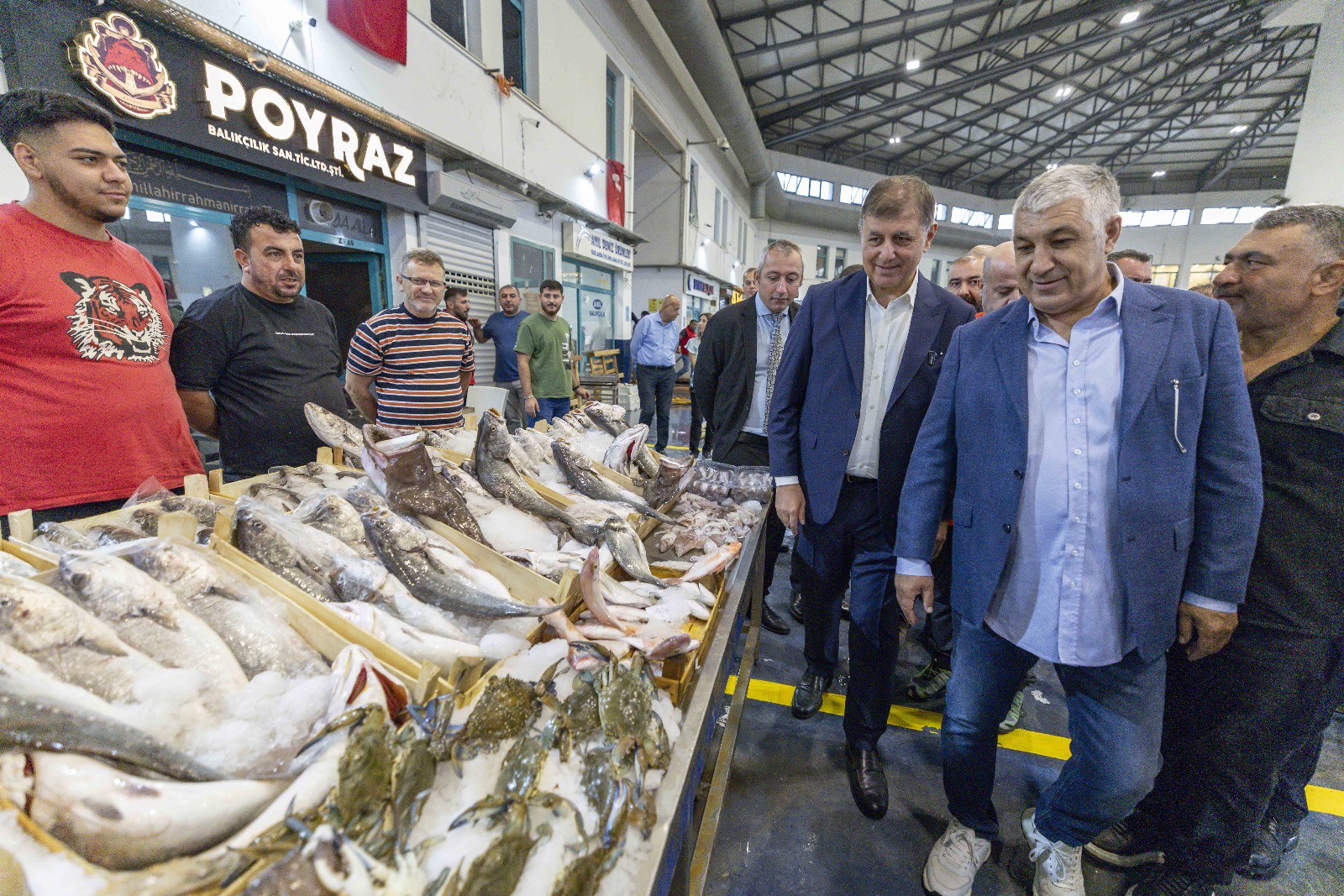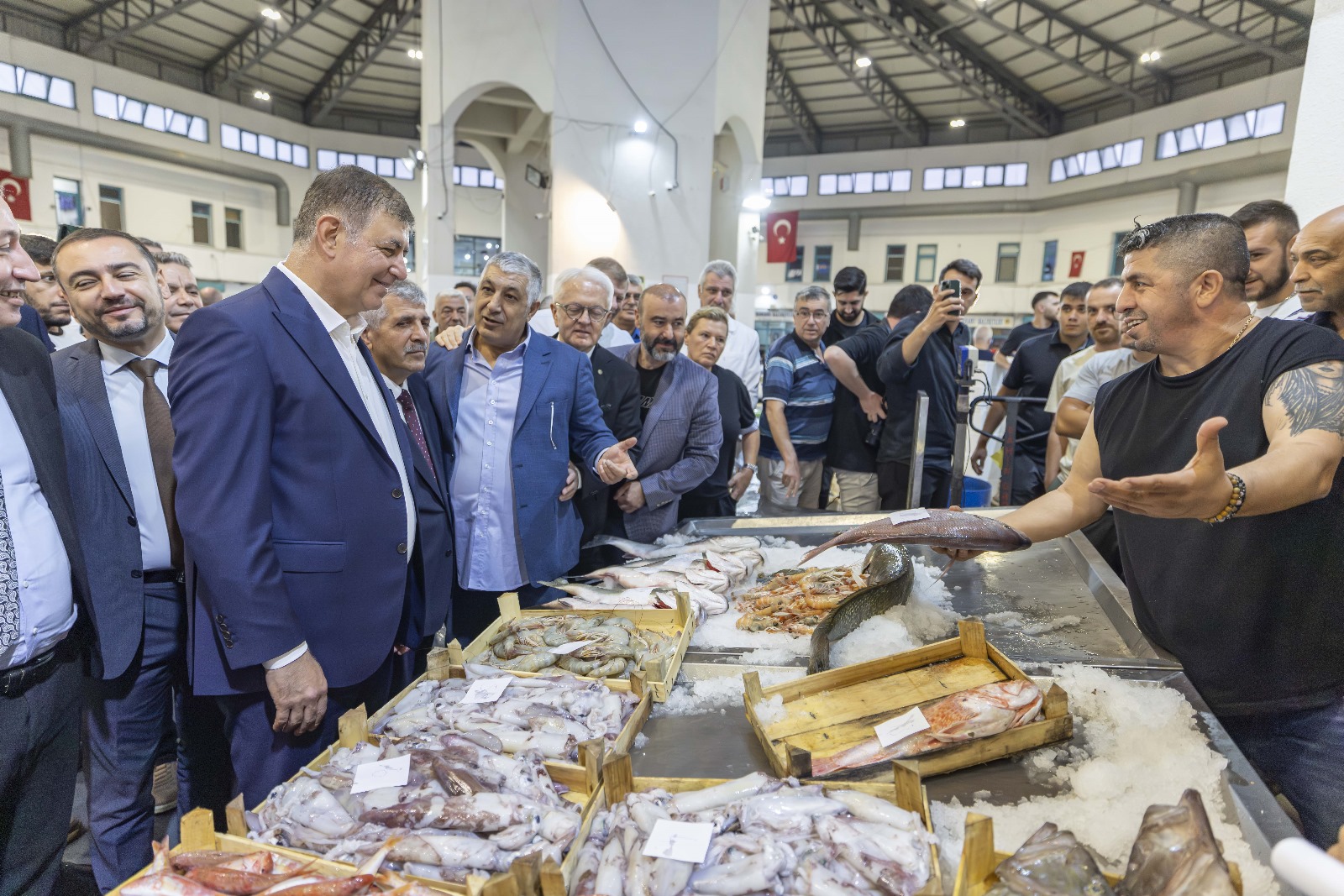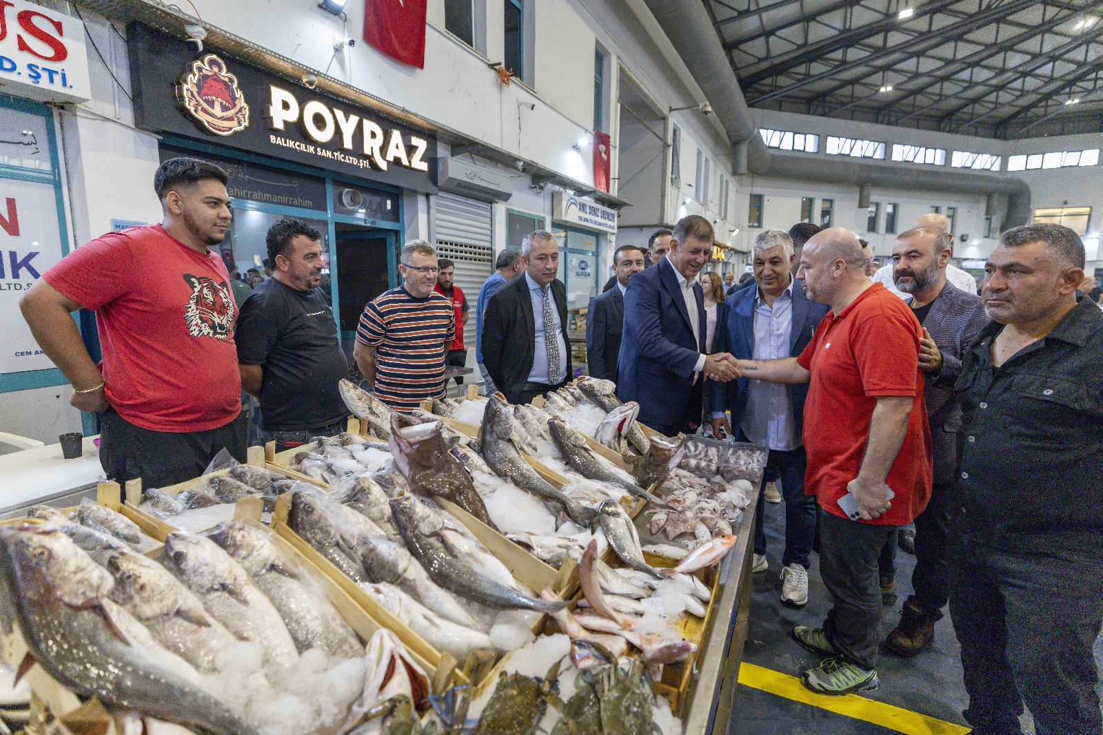 Başkan Dr. Cemil Tugay, tezgahları ziyaret ederek balıkçılara bol kazançlı, bereketli bir sezon diledi. Av yasağının bitmesiyle denizden çıkarılan ilk balıklar açık artırma usulüyle satıldı. Başkan Tugay, sezonun ilk balığını mezattan alarak siftah yaptı. Mezatın ardından Başkan Tugay, halde yeni bir işletmenin de açılışını yaptı. Sezonun ilk satılan balıkları ise kalkan, lahos, mercan, levrek, trança ve barbun oldu.