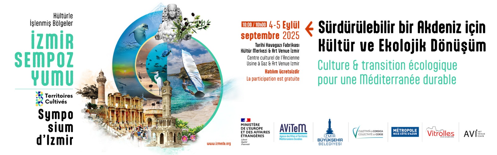 Fransa Dışişleri Bakanlığı’na bağlı Avrupa ve Dışişleri Bakanlığı Yerel Yönetimler Dış Eylem Delegasyonu (DAECT) hibesinden yararlanan “Kültürle İşlenmiş Bölgeler / Cultivated Territory” projesi kapsamında düzenlenen uluslararası sempozyum, Tarihi Havagazı Fabrikası Kültür Merkezi ve Art Venue İzmir’de (AVİ) yapılacak. Organizasyon, AVİTEM (Sürdürülebilir Akdeniz Kent ve Bölgeleri Ajansı) liderliğinde İzmir Büyükşehir Belediyesi, Nice Côte d'Azur Metropolü, Vitrolles Belediyesi ve Korsika Kolektifi iş birliğiyle hayata geçiriliyor.