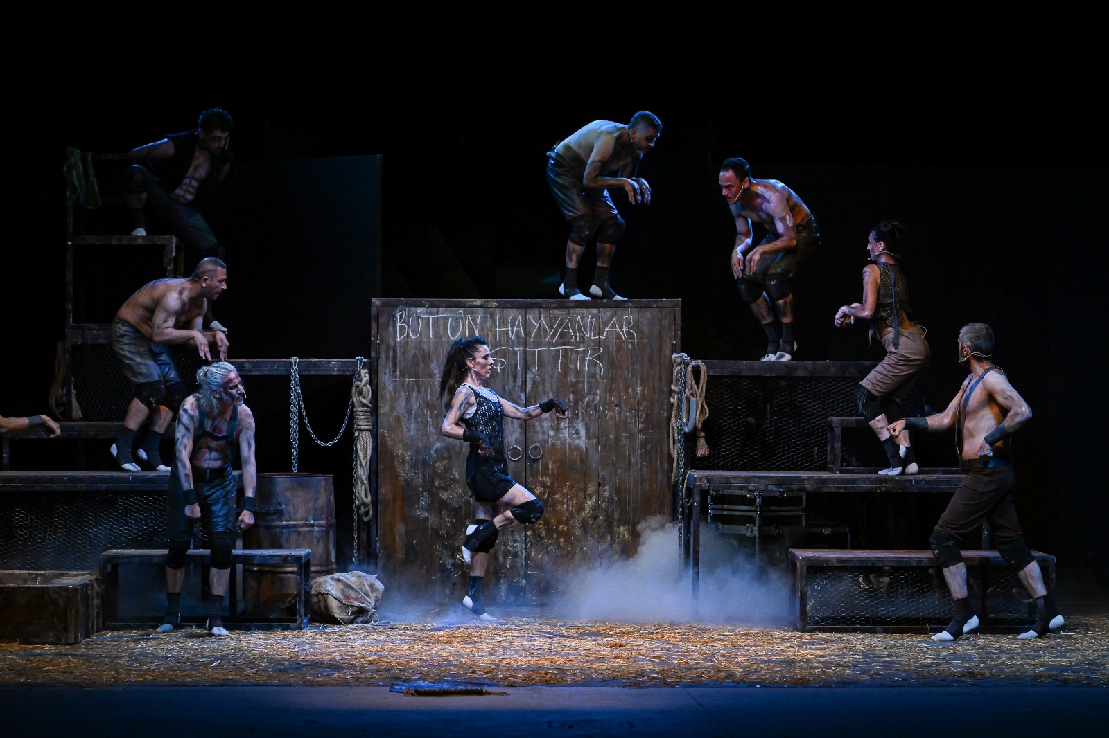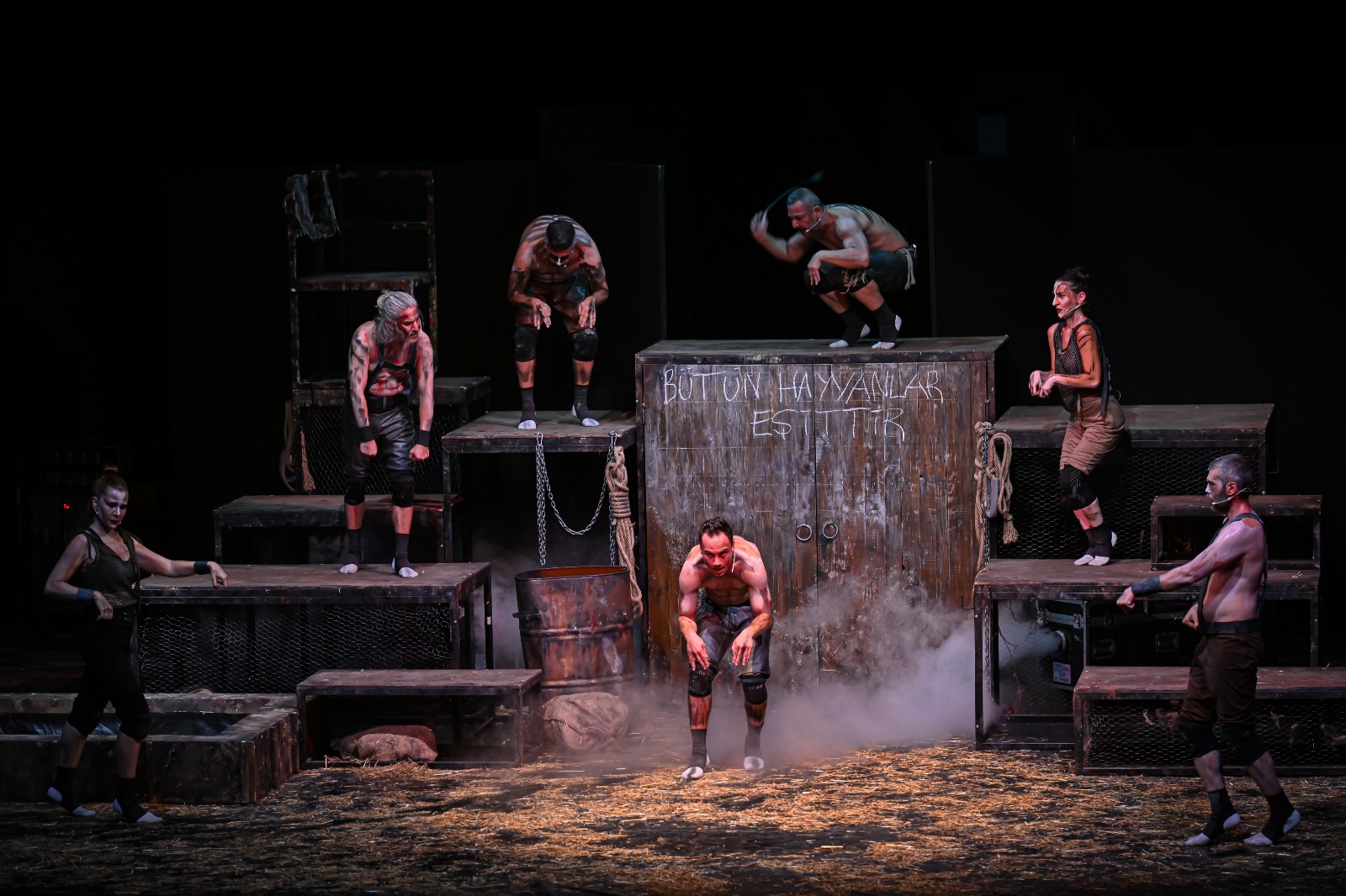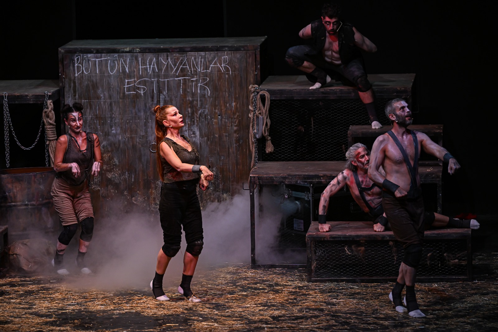 Bu yıl 94’üncüsü düzenlenen İzmir Enternasyonal Fuarı’nda ücretsiz Açık Hava Tiyatrosu etkinlikleri Oyun Atölyesi’nin “Hayvan Çiftliği” oyunu ile başladı. Uyarlamasını Zerrin Akdenizli’nin yaptığı, yönetmenliğini Barış Erdenk’in üstlendiği oyunda; Muharrem Özcan, Umut Temizaş, Aylin Kontente, Eser Karabil, Şirin Kılavuz, Ezgi Coşkun, Ayhan Bekdemir, Beran Kotan, Ulaş Akşit, Ramazan Ülkü Turan Bölükbaşı ve Ali Tepe sahne aldı. Gürkan Çakıcı’nın müzikleri, Kemal Yiğitcan’ın ışık tasarımı ve Asya Başkan’ın kostümleriyle zenginleşen yapım, izleyiciyi yalnızca oyuncuların sahne üstündeki performansıyla değil atmosferiyle de etkiledi. Orwell’in politik hicvi olan “Hayvan Çiftliği”, hayvanların eşitlik ve özgürlük talepleriyle başlattıkları isyanın, kısa sürede totaliter bir rejime dönüşmesini anlatıyor.