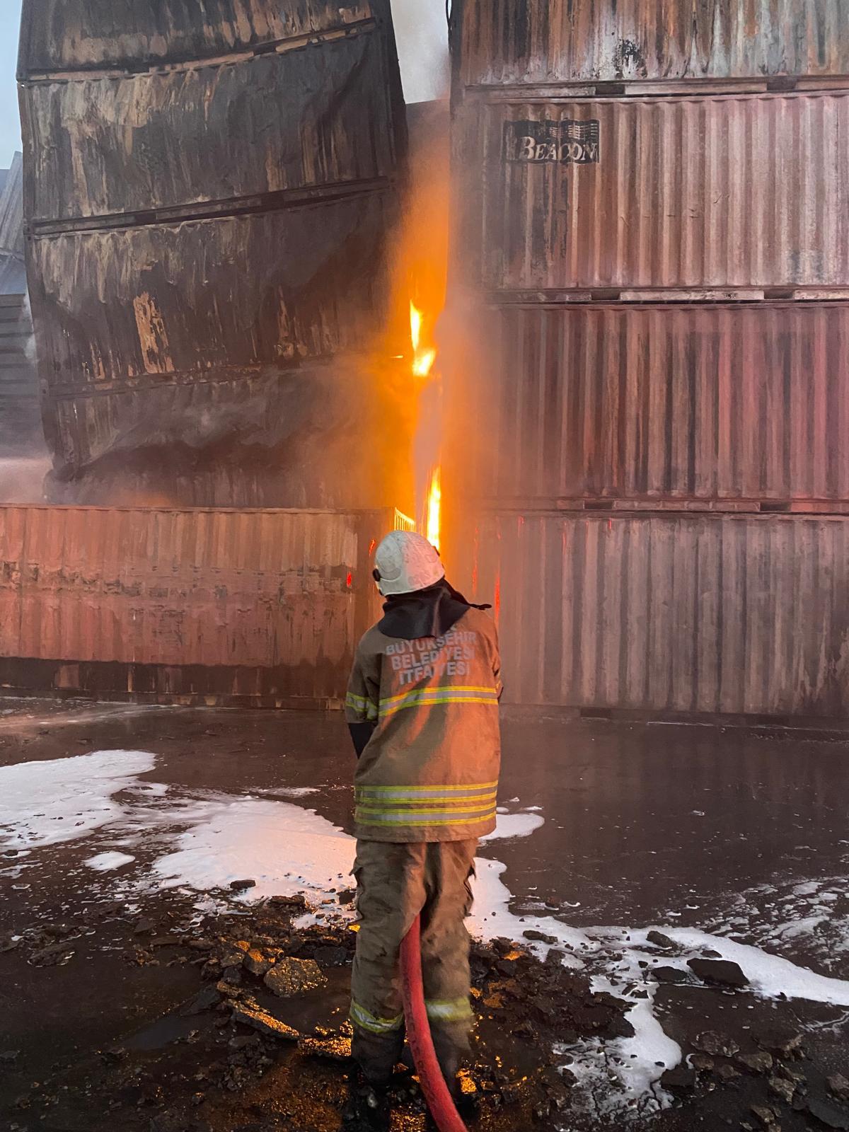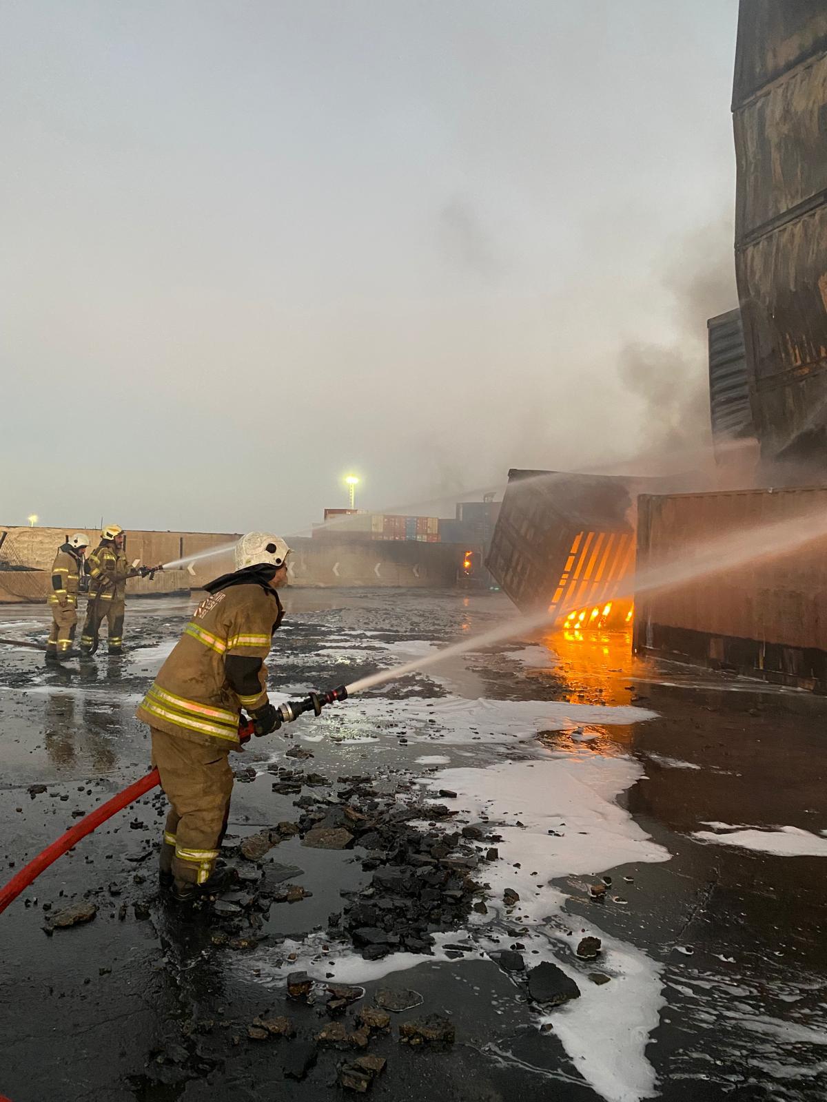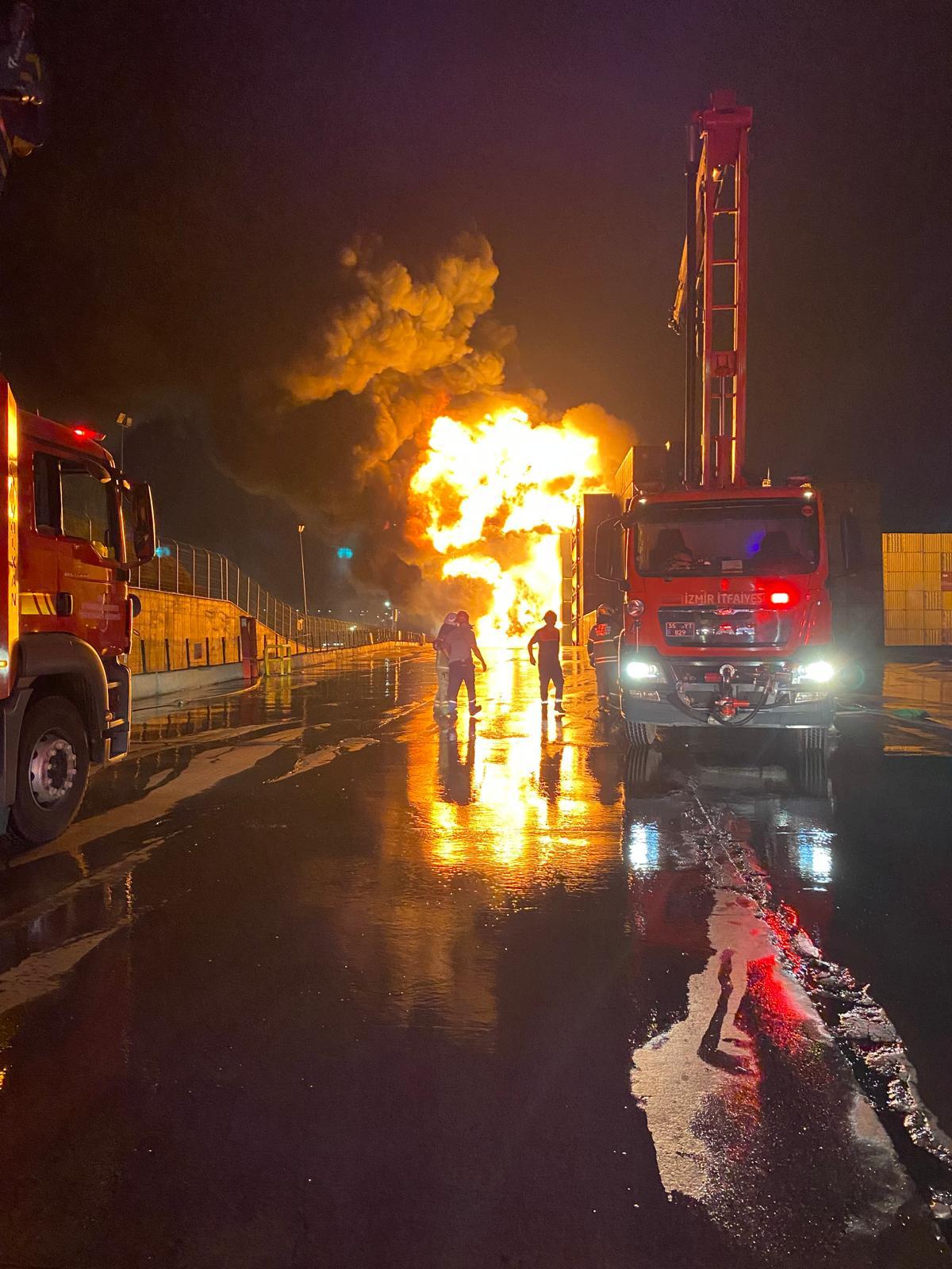 İzmir'in Aliağa ilçesinde faaliyet gösteren Nemport Limanı’nda sabaha karşı 04.00 sıralarında konteyner depolama alanında yangın çıktı. İhbar üzerine İzmir Büyükşehir Belediyesi İtfaiye Dairesi Başkanlığı ekipleri 10 arazöz, 4 tonaj araç, 2 endüstriyel araç ve çok sayıda personel ile olay yerine sevk edildi. İzmir Büyükşehir Belediyesi’nden ve ilçe belediyelerden gelen su tankerleri de söndürme çalışmalarına destek verdi. Yapılan incelemelerde, yanan konteynerlerde balık yağı bulunduğu ve alevlerin bölgeyi hızla sardığı belirlendi. Aynı zamanda otluk alana da sıçradığı belirlenen alevler, İzmir Büyükşehir Belediyesi İtfaiyesi ve Orman Bölge Müdürlüğü ekipleri tarafından kontrol altına alındı. İzmir İtfaiyesi’nin yaklaşık üç saat süren yoğun çalışmaları sonucu yangın, tehlikeli kimyasal içeren konteynerlere sıçramadan kontrol altına alındı. Olayda can kaybı ya da yaralanma yaşanmadığı belirlendi. Bölgede soğutma çalışmaları devam ediyor.